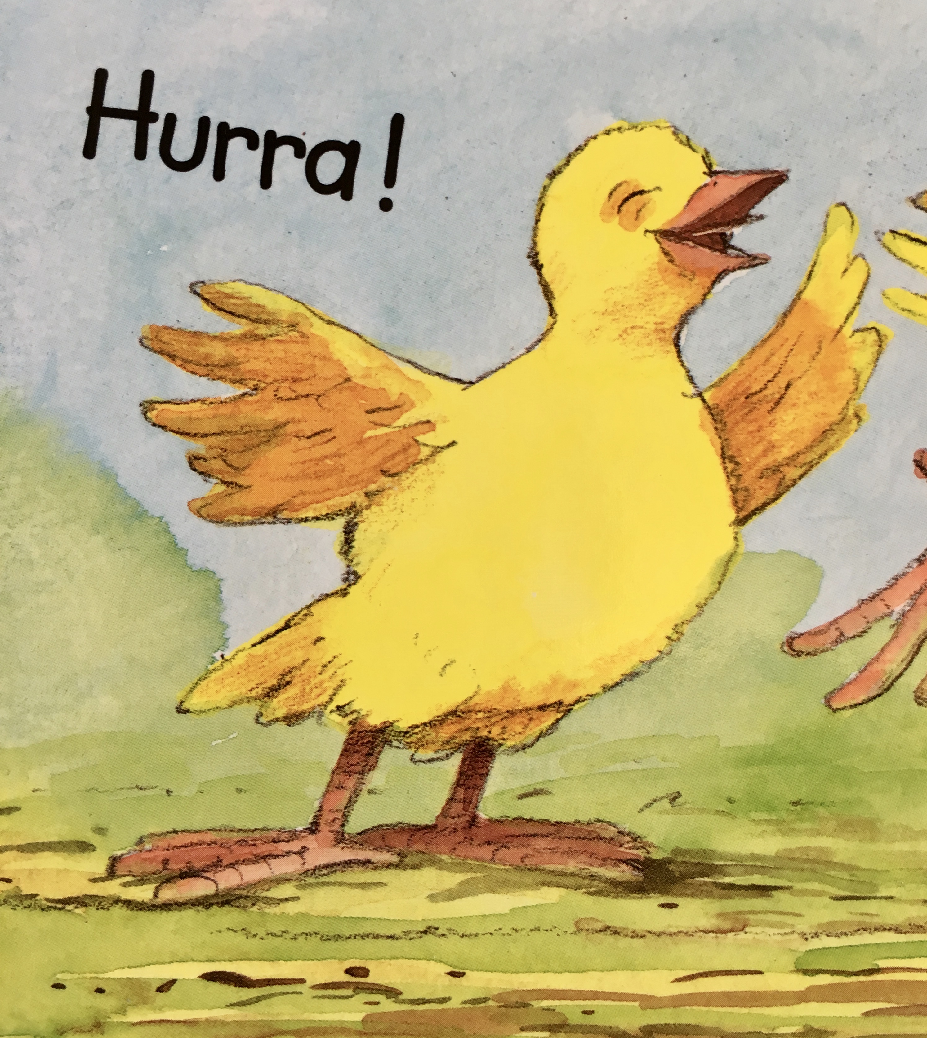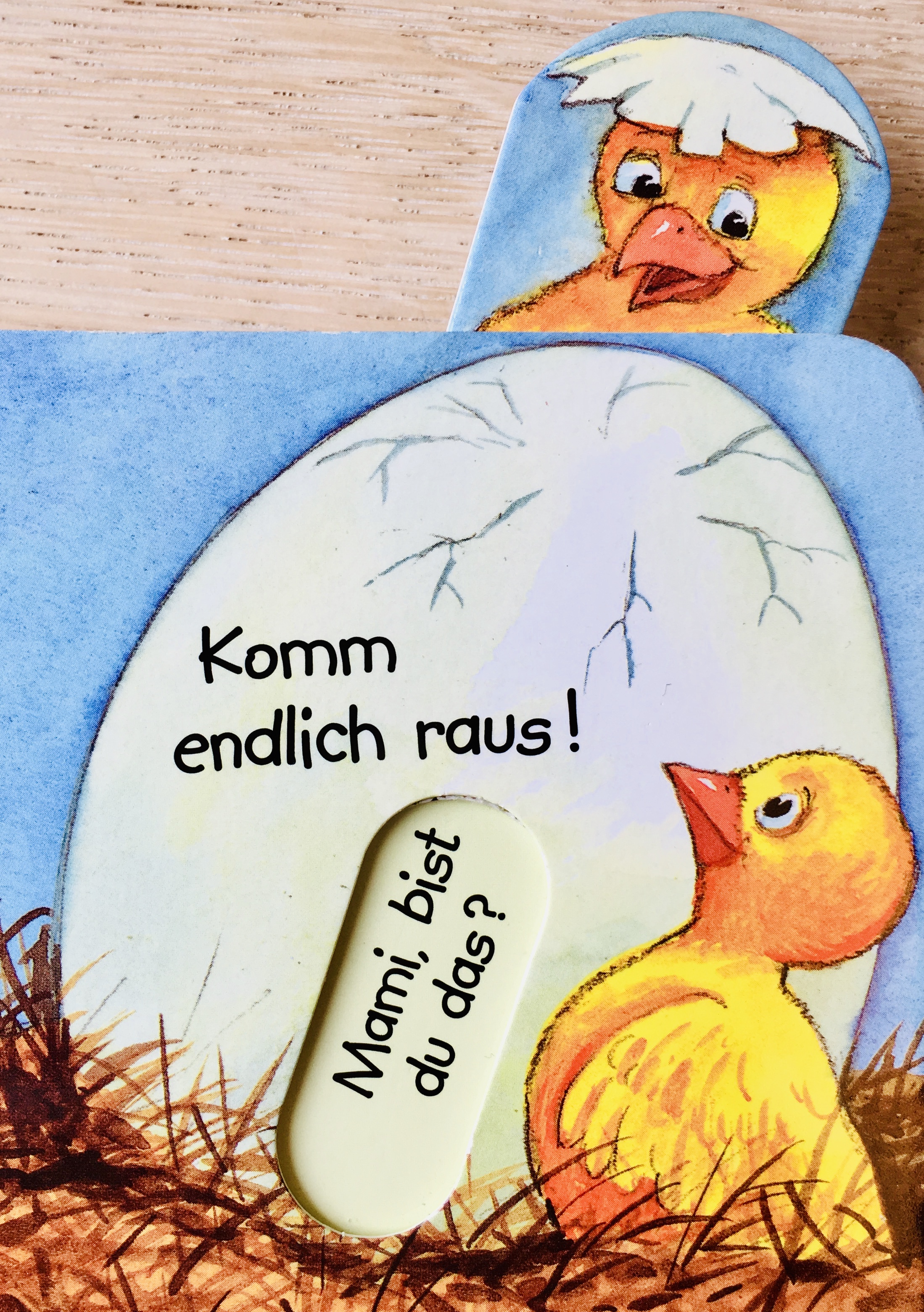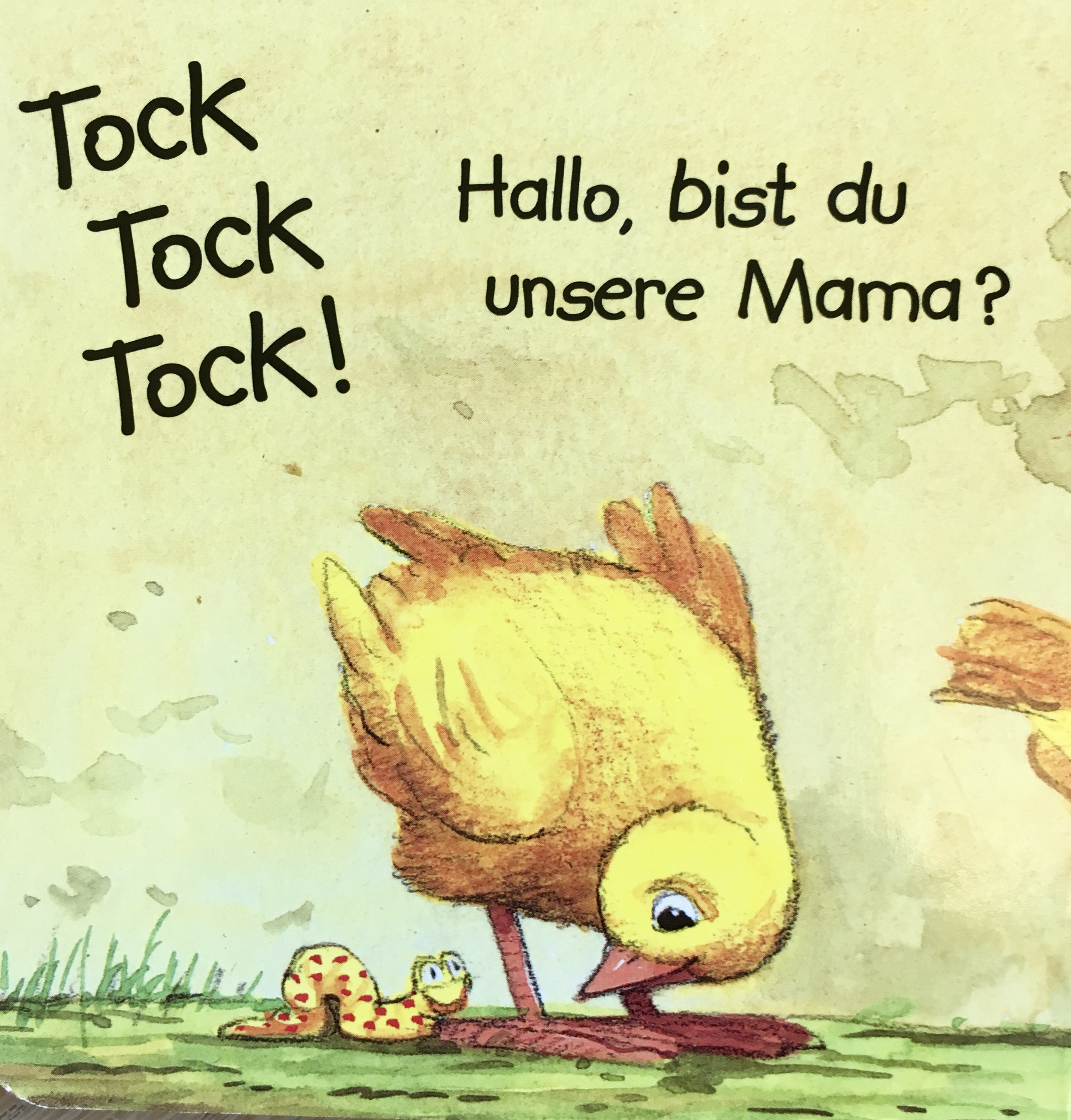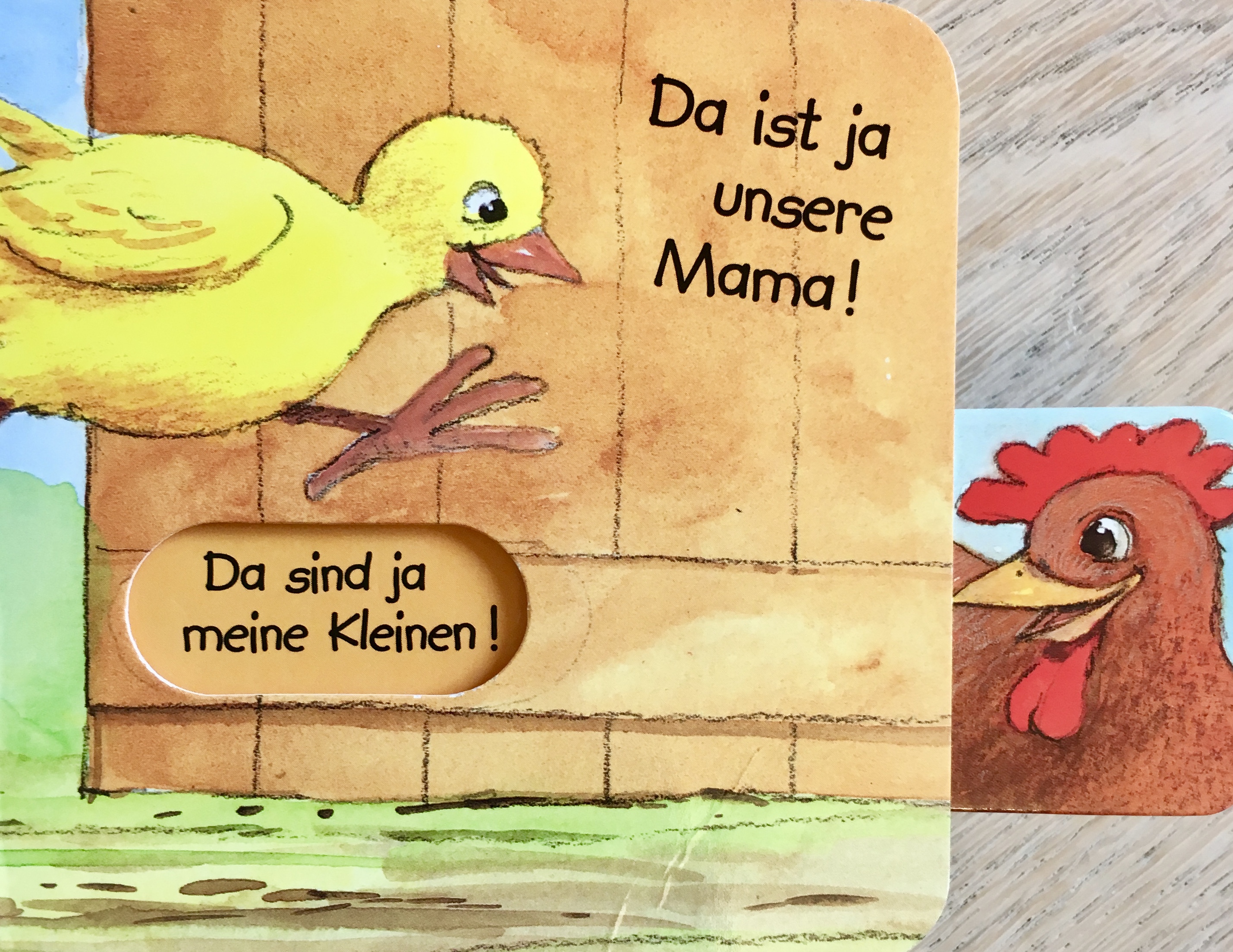 Die beiden kleinen Kücken suchen ihre Mutter: zuerst klopfen sie an einem Ei an, doch dort ist nur ein anderen Kücken, dann an der Stalltür, dort finden sie ein Schaf, hinter dem Zaun verbirgt sich das Schwein, dann finden sie eine Kuh und ein Pferd, bis schließlich das Huhn gefunden den wird.