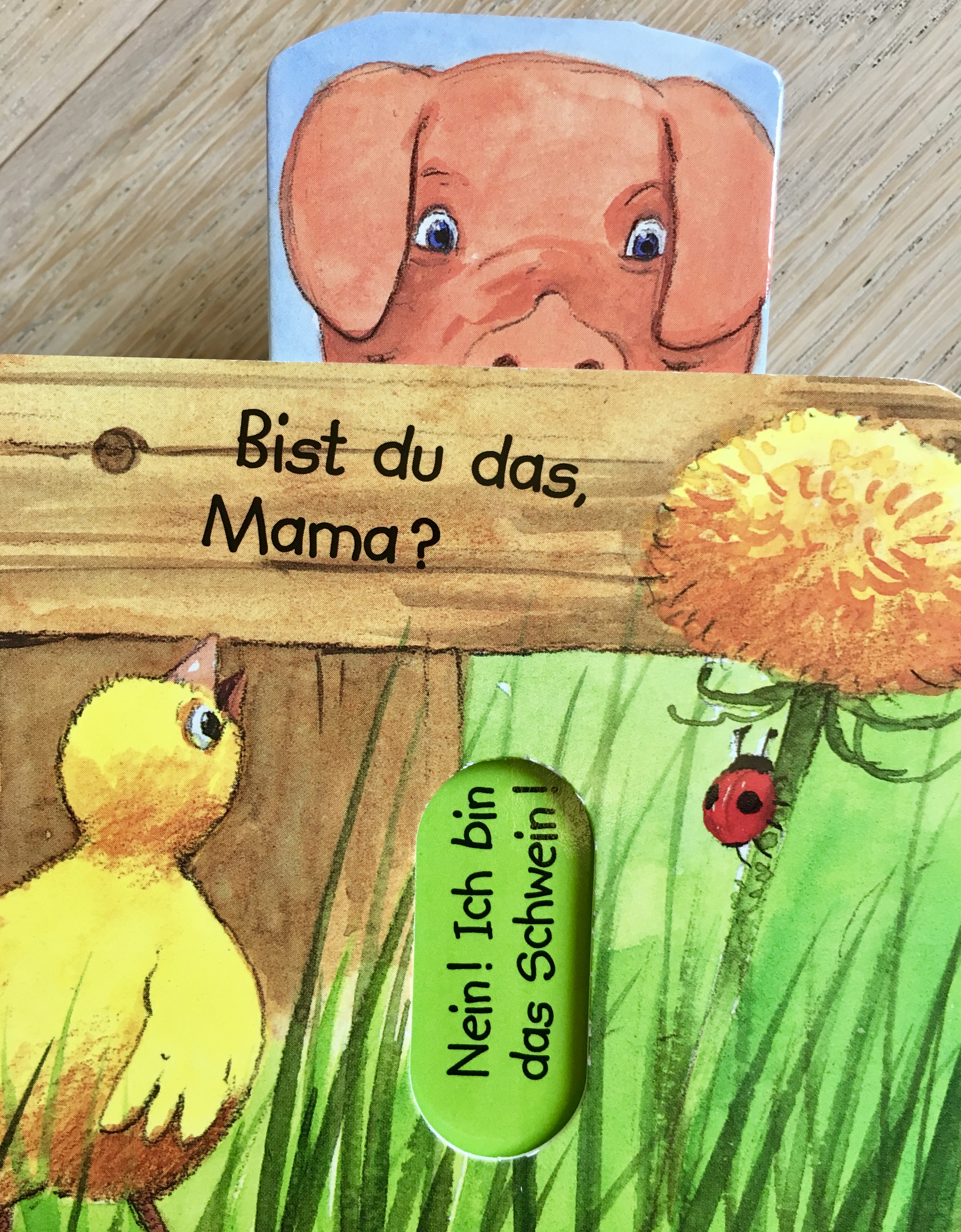 Das Buch ist einfach und liebevoll illustriert. Das Besondere sind jedoch die Schiebelemente auf jeder Seite, die die einzelnen Tiere austausche lassen und für eine Überraschung auf jeder Seite sorgen.
