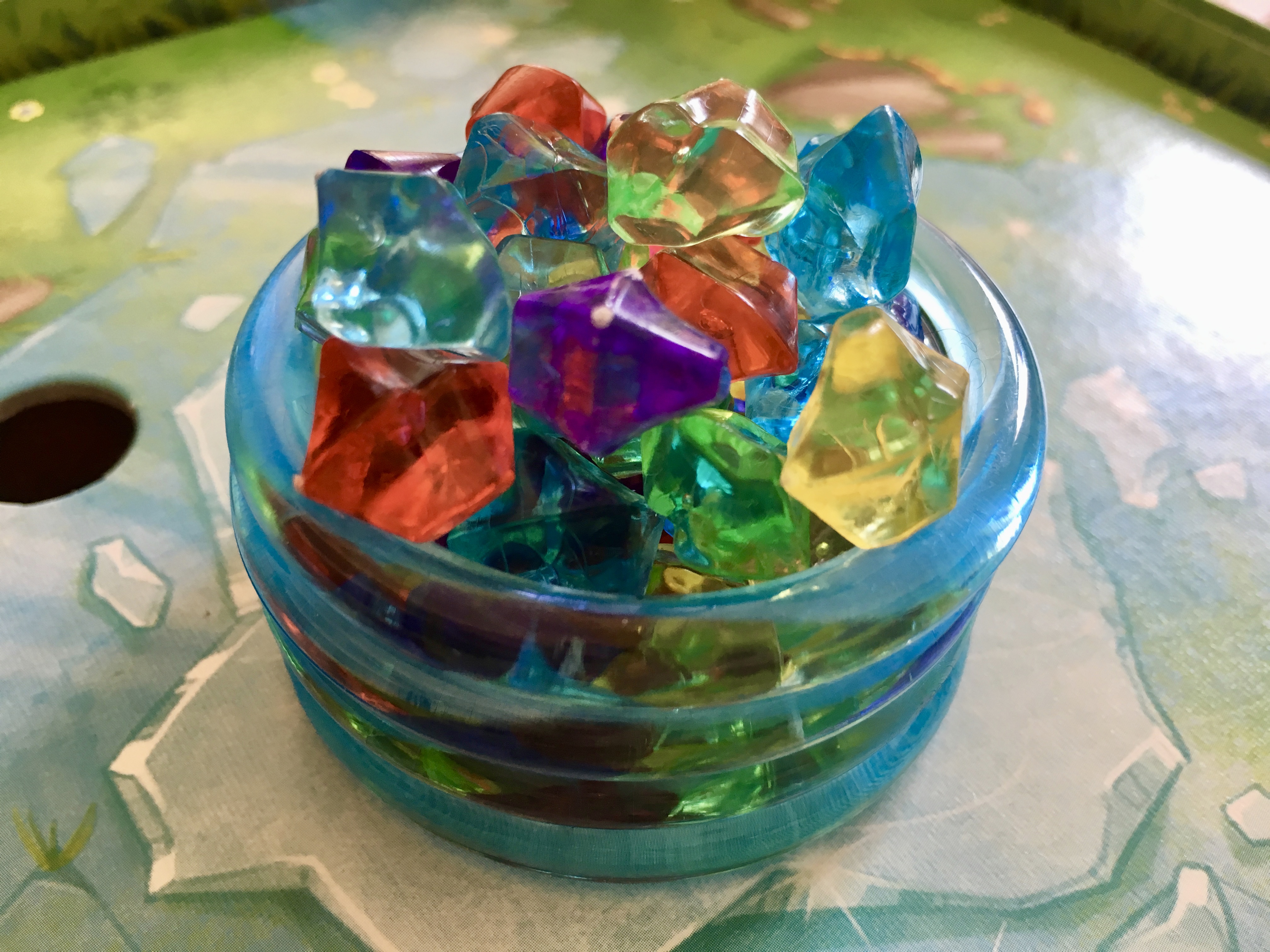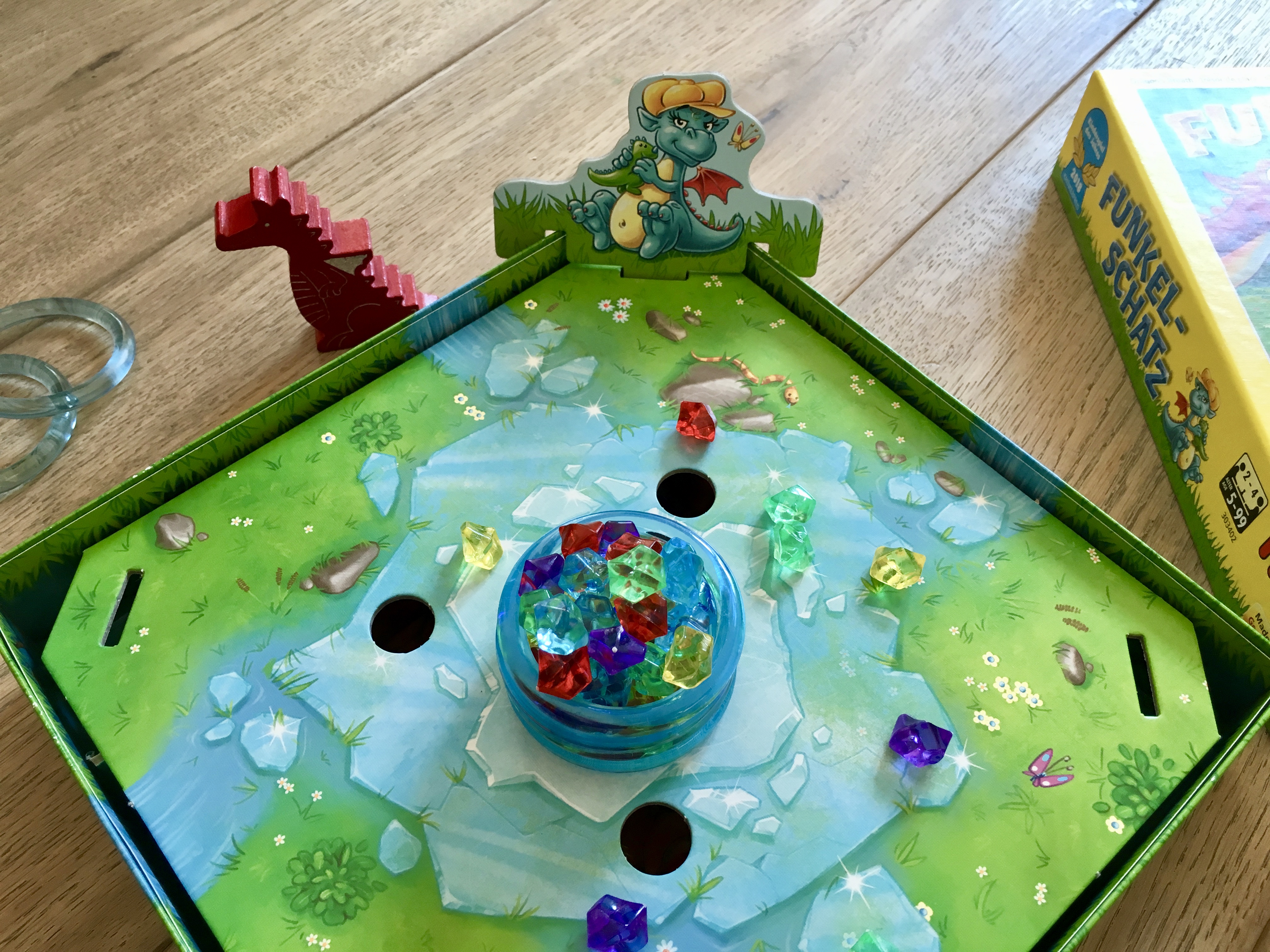 In dem ‚Eisberg‘ sind die Edelsteine versteckt. Abwechselnd können die Spieler ein Stück davon ‚abschmelzen‘, so dass ein paar Edelsteine herausfallen. Zuvor muss man sich jedoch für eine Edelsteinfarbe entscheiden und darf nur die Steine mit der entsprechenden Farbe in seine Höhle bringen. Ein bisschen Strategie ist also bei den Größeren auch gefragt. Aber auch für kleinere Kinder funktioniert das Spiel gut. Dadurch, dass die gewonnenen Steine in der Höhle deponiert werden, bleibt es bis zuletzt spannend, wer die meisten Steine gesammelt, also gewonnen hat.