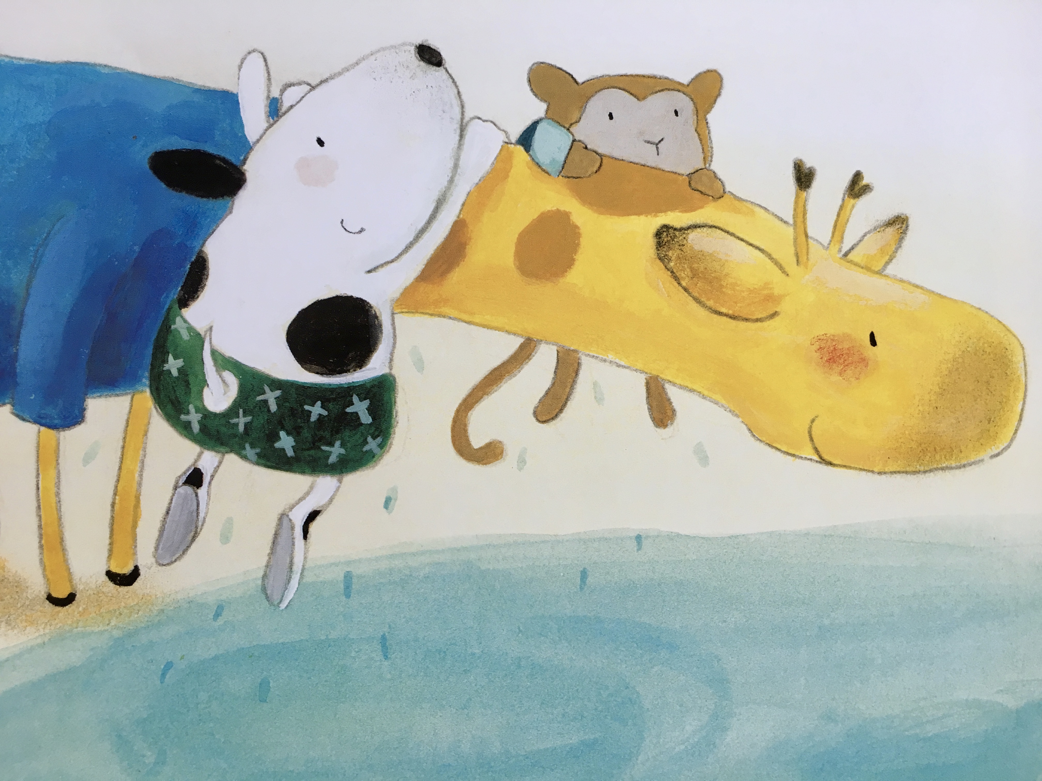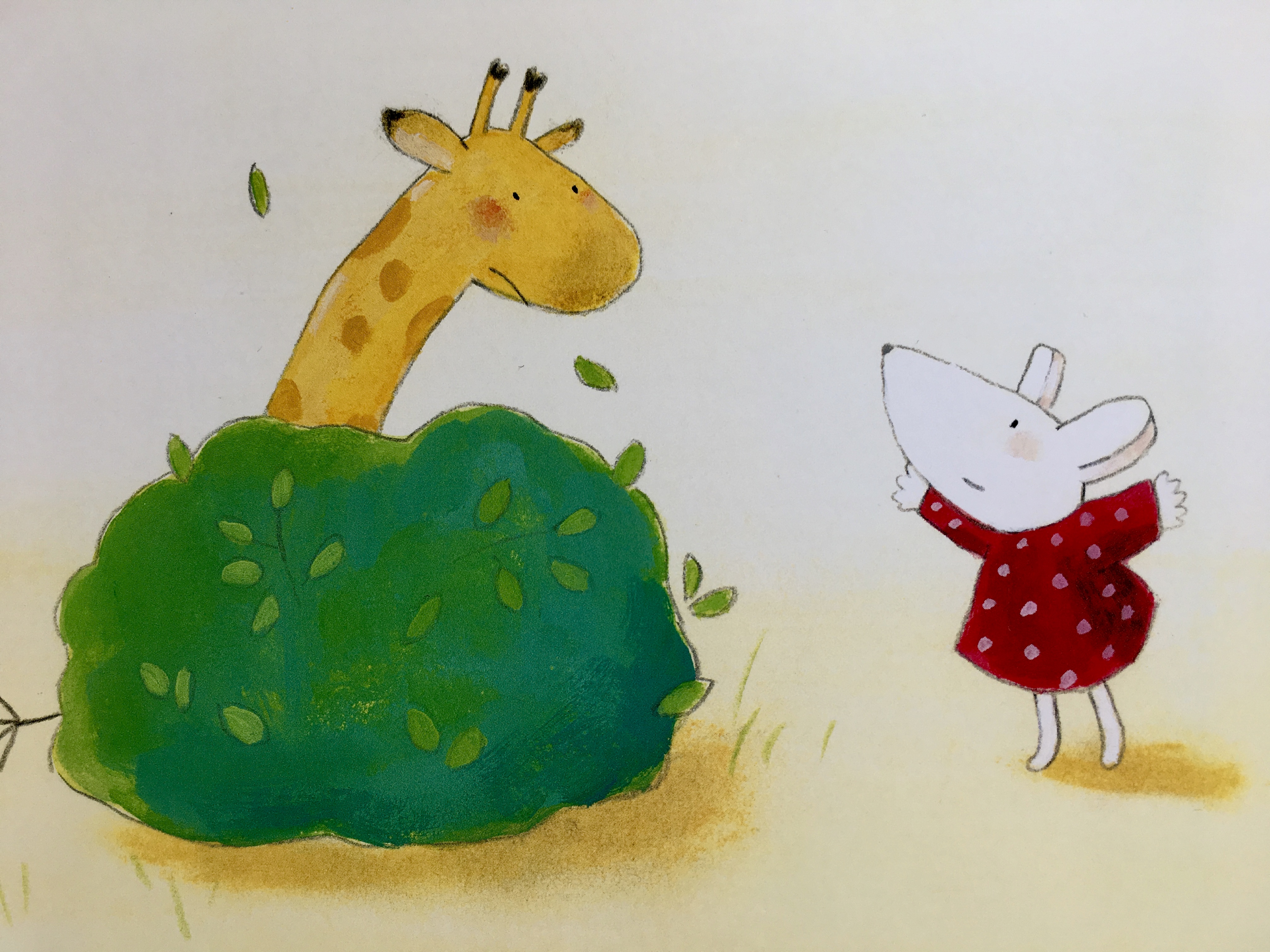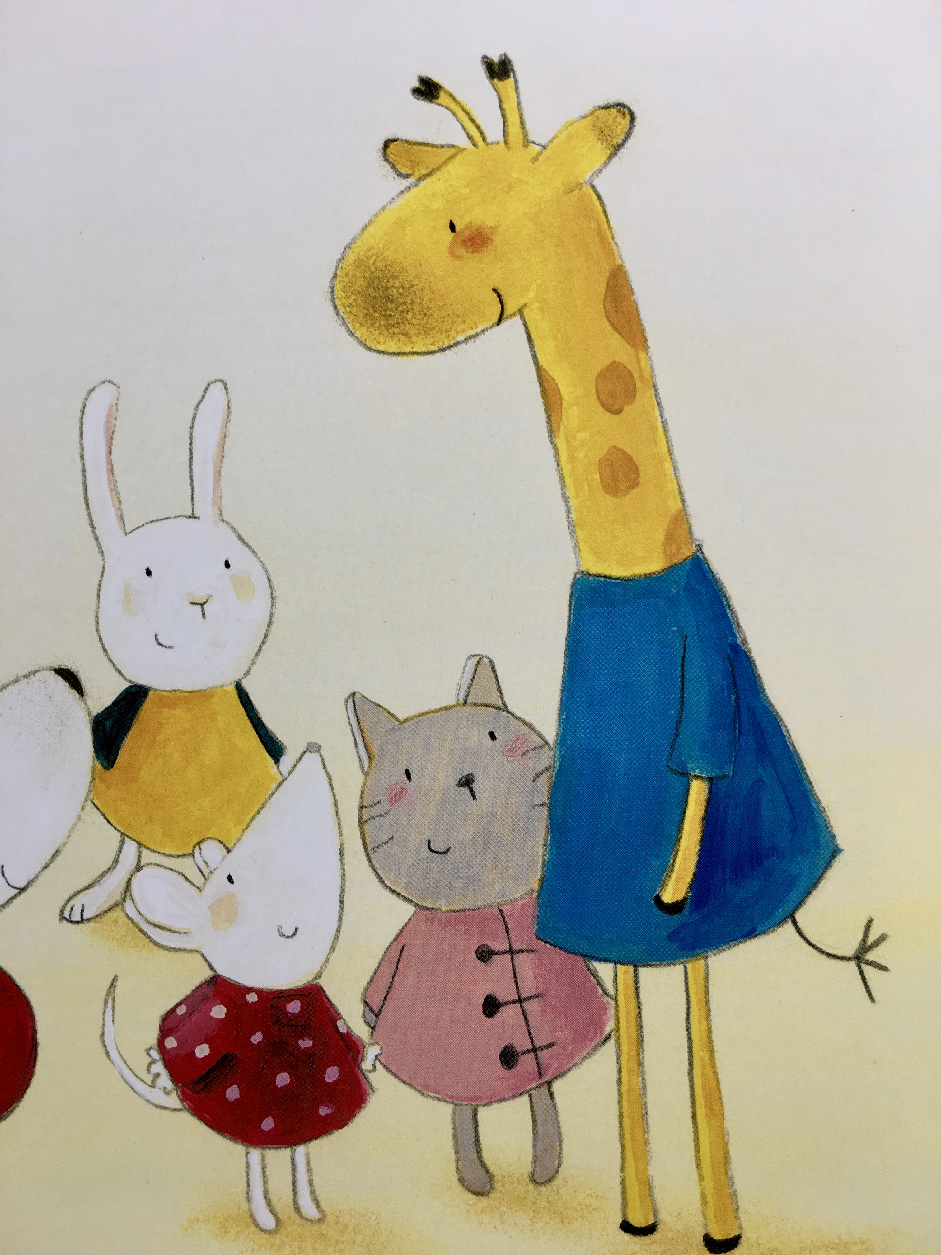In dem zweiten Band zieht die Giraffe neu in das Dorf. Sofort wollen alle Tiere miteinander spielen, doch mit der Giraffe scheint das gar nicht so einfach zu sein: Zuerst verheddert sich ihr langer Hals beim Seilspringen, dann ist sie viel zu groß zum Verstecken spielen. Schließlich klappt es mit dem Fußball spielen, wenn, ja, wenn nicht sofort der Ball in Teich fallen würde. Der Affe und der Hund versuchen ihn herauszufischen und laden natürlich auch im Wasser. Gut, dass die Giraffe einen so langen Hals hat, dass sie den beiden heraus helfen und auch noch den Ball retten kann. Toll, eine solche neue Freundin zu haben.
