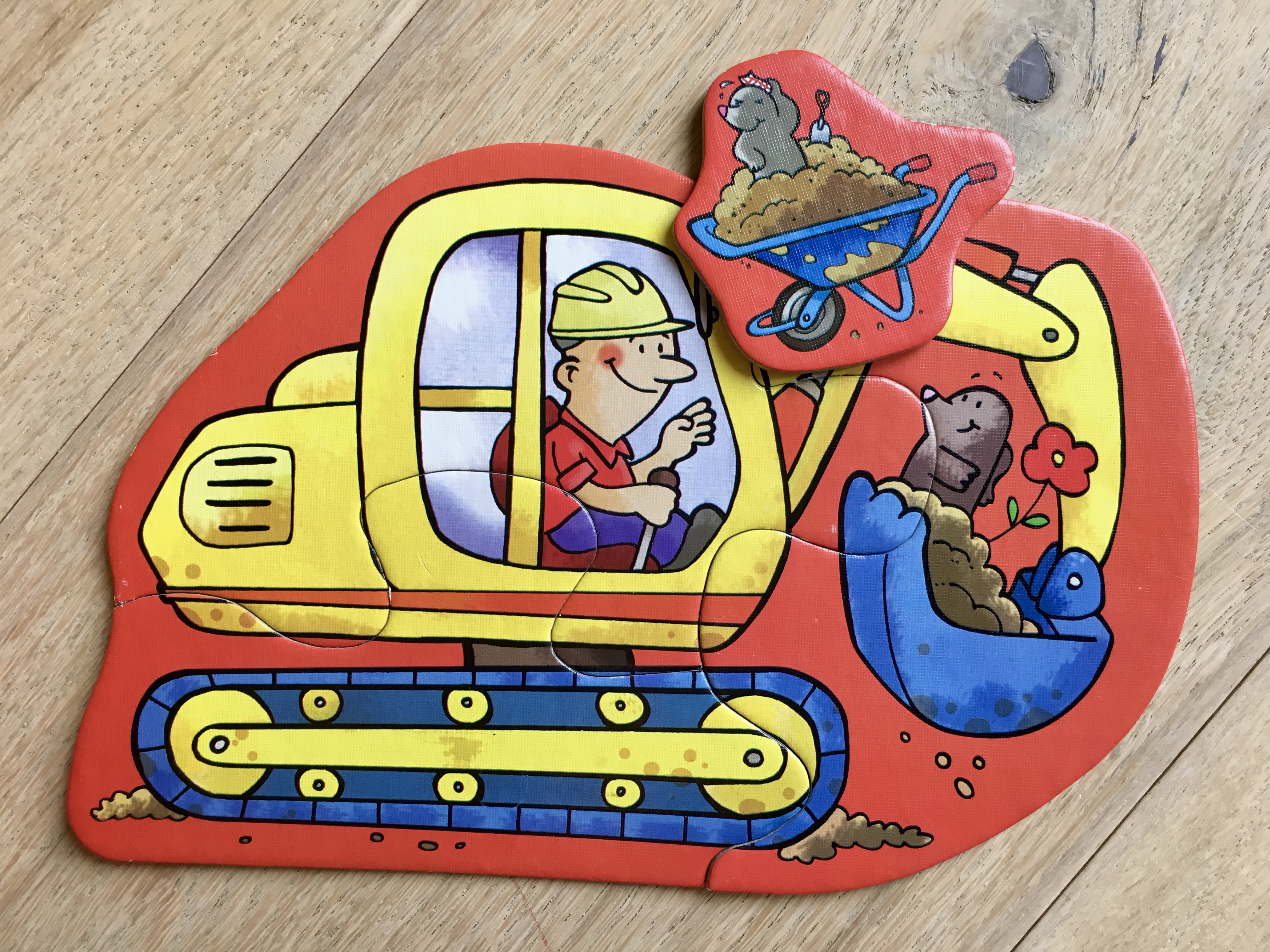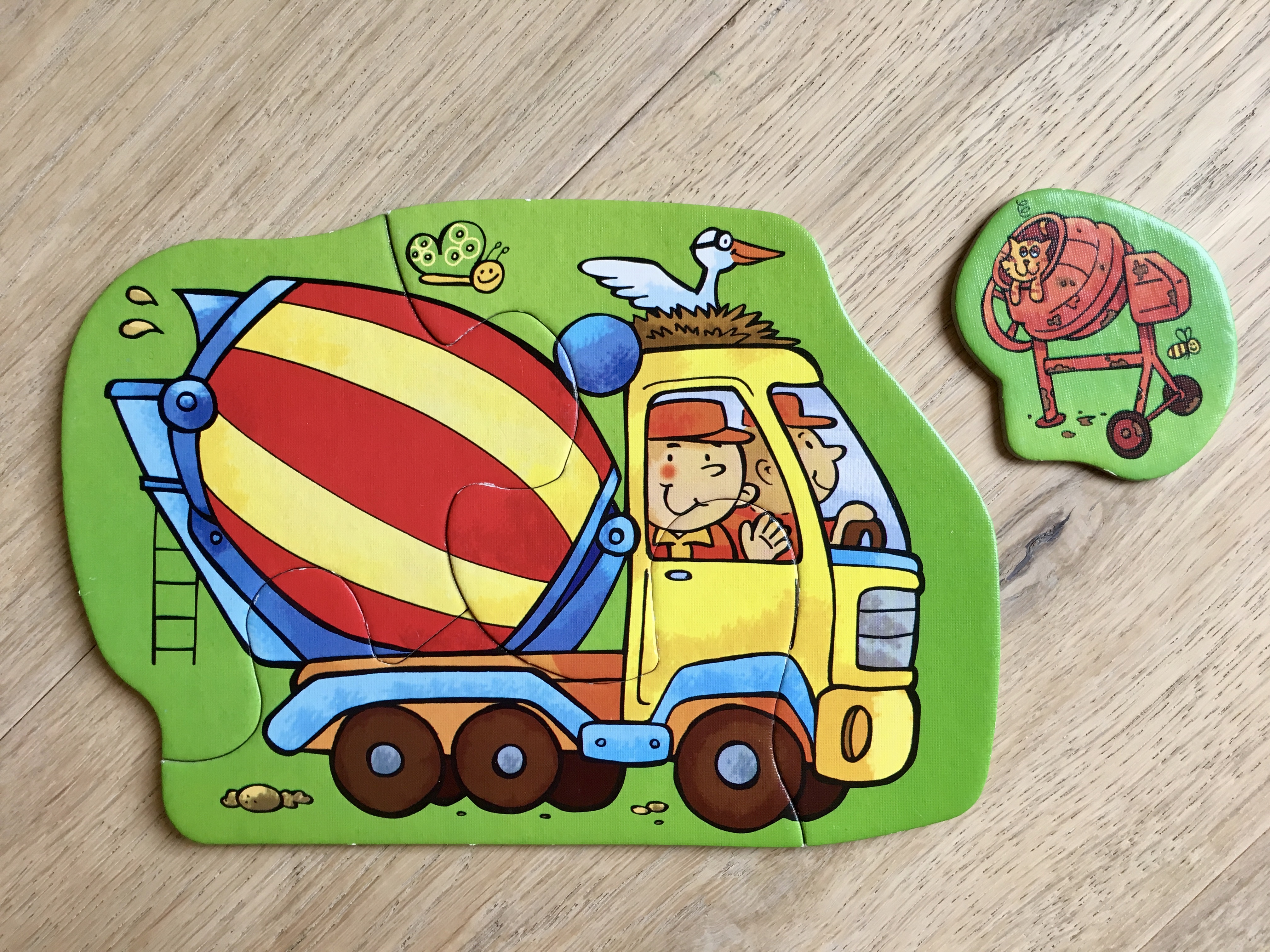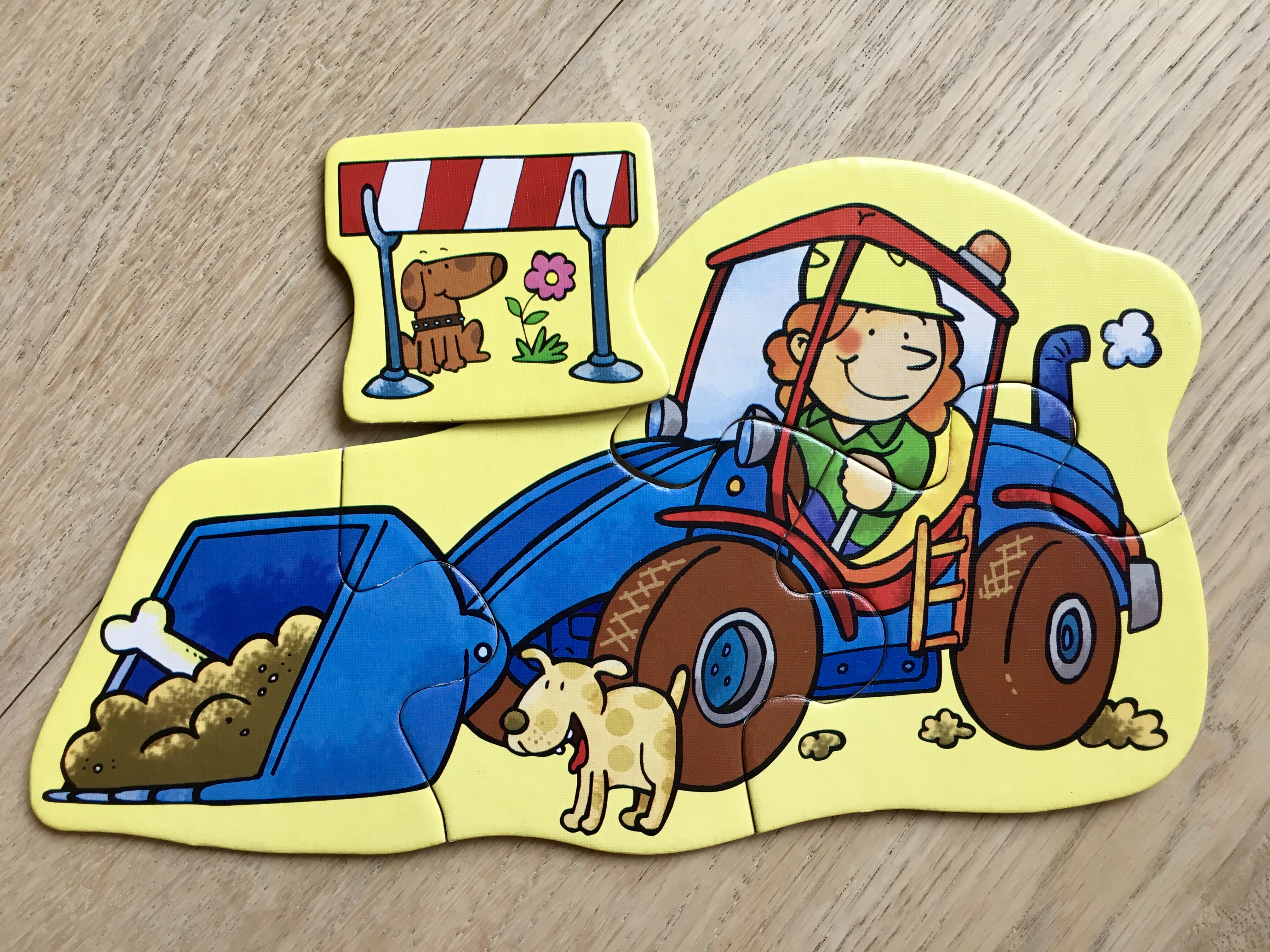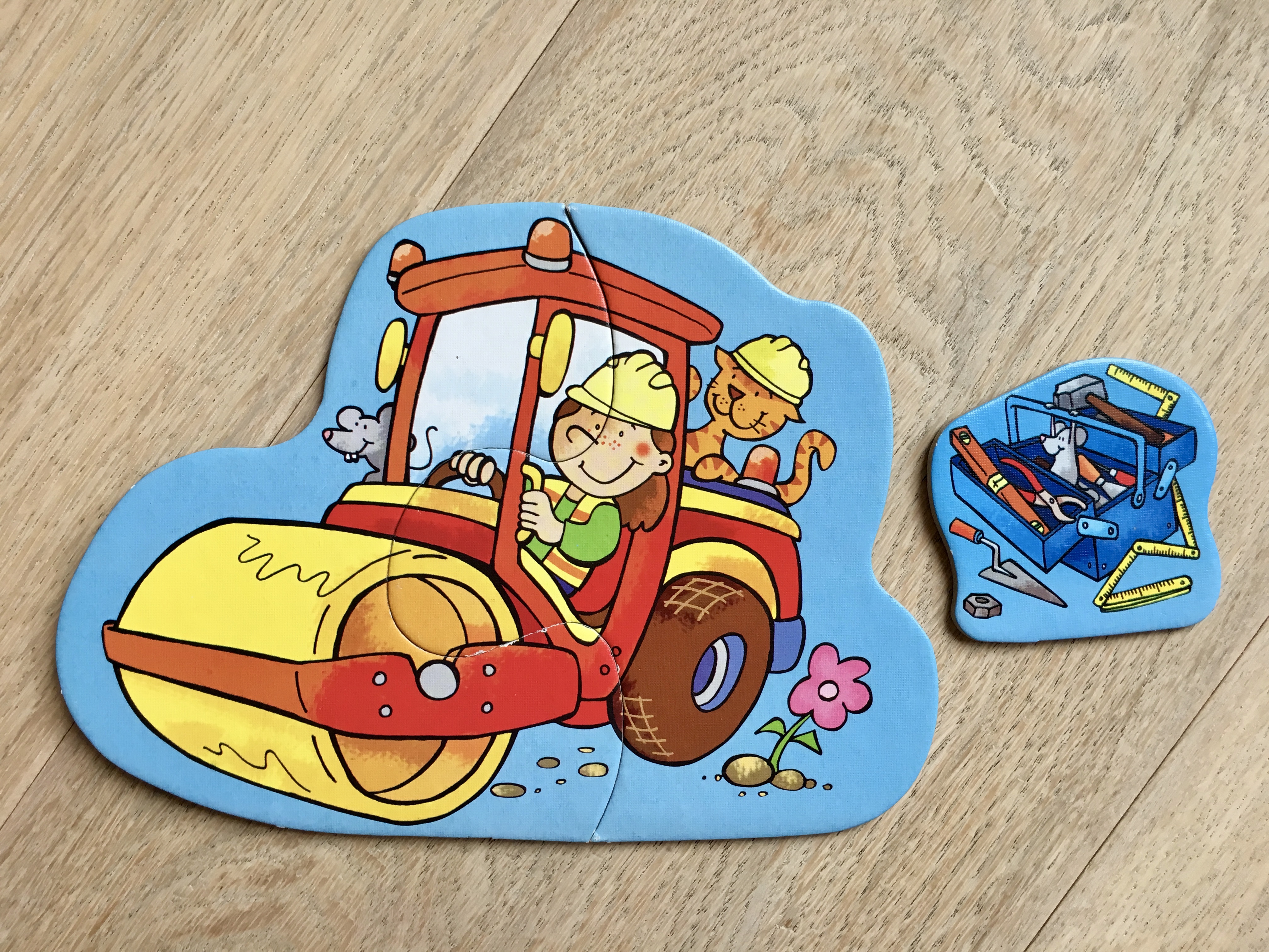 Erste Puzzle für Kinder ab drei Jahren sind in dieser Box enthalten. Dabei geht es um Motive rund und die Baustelle: