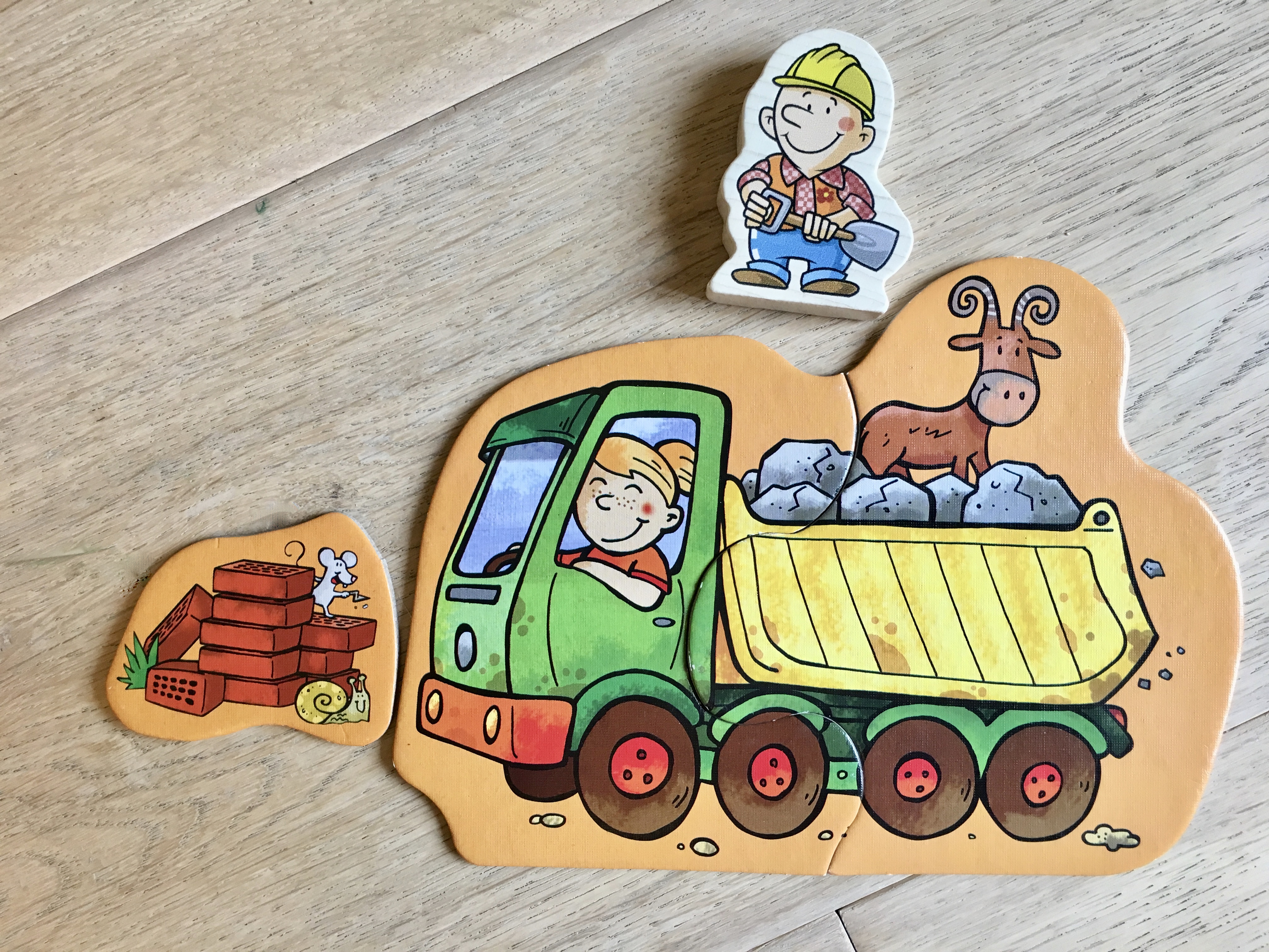 Zusätzlich können den einzelne Puzzles passende Karten zugeordnet werden und eine Bauarbeiter-Holzfigur regt zum ergänzenden Spielen an.