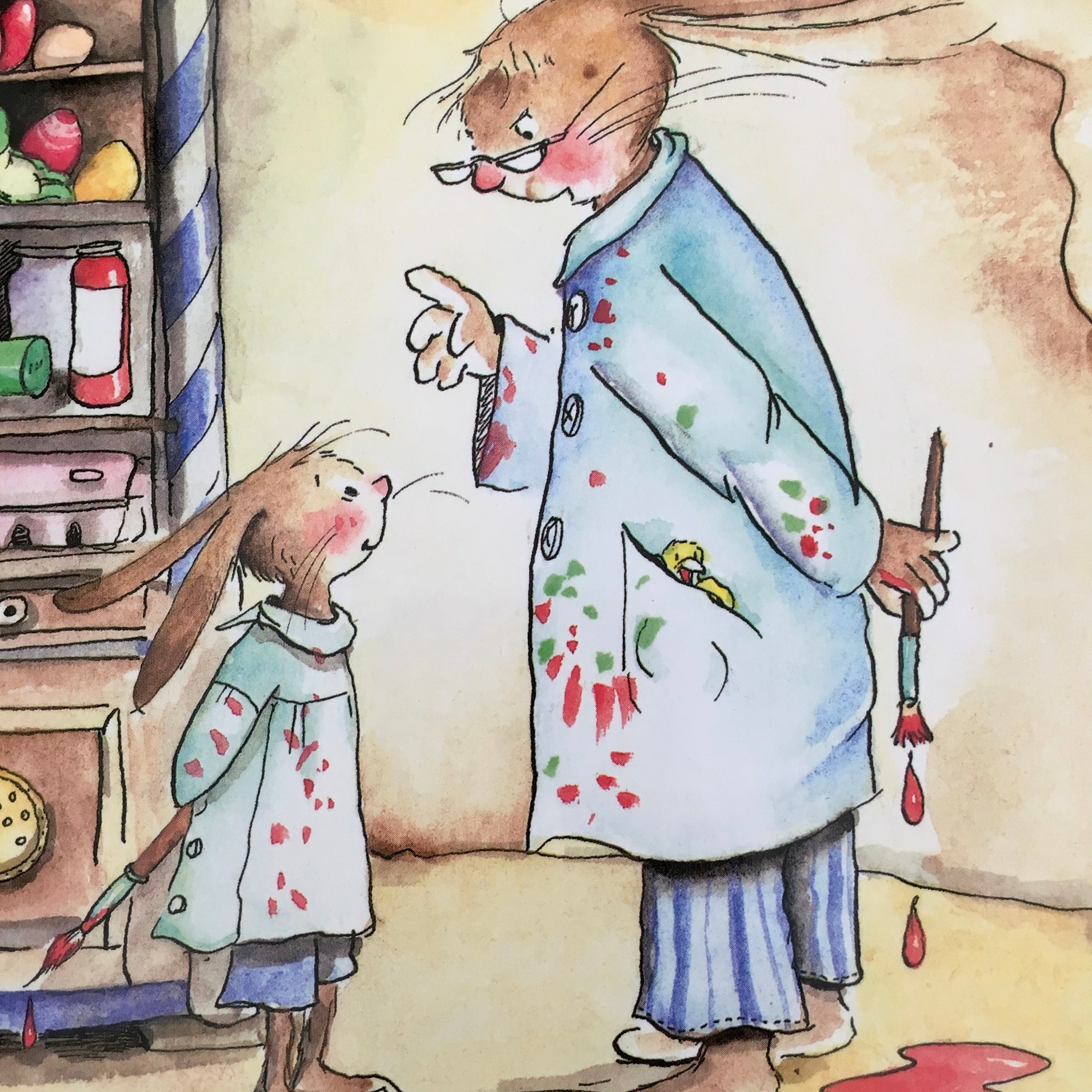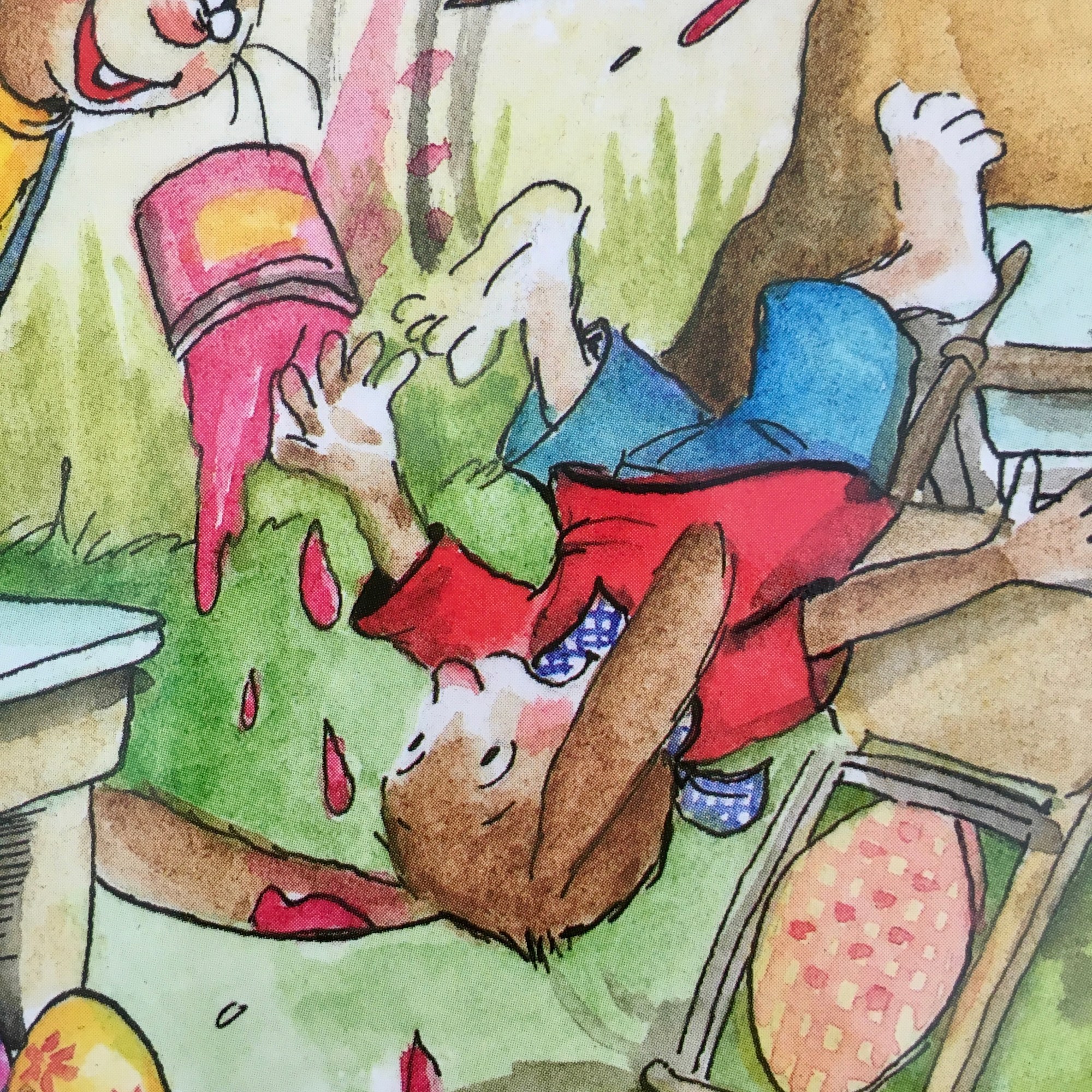 Zuerst ‚versteckt‘ er ein Ei in einem Schuh, das gibt dann Rührei. Er kippt in der Osterhasen-Schule in den Farbtopf und wird von der Henne fast ausgebrütet, was zu guter letzt zu einer kleinen Standpauke des Osterhasen-Vaters führt. Welche Stups natürlich zu kontern weiss…