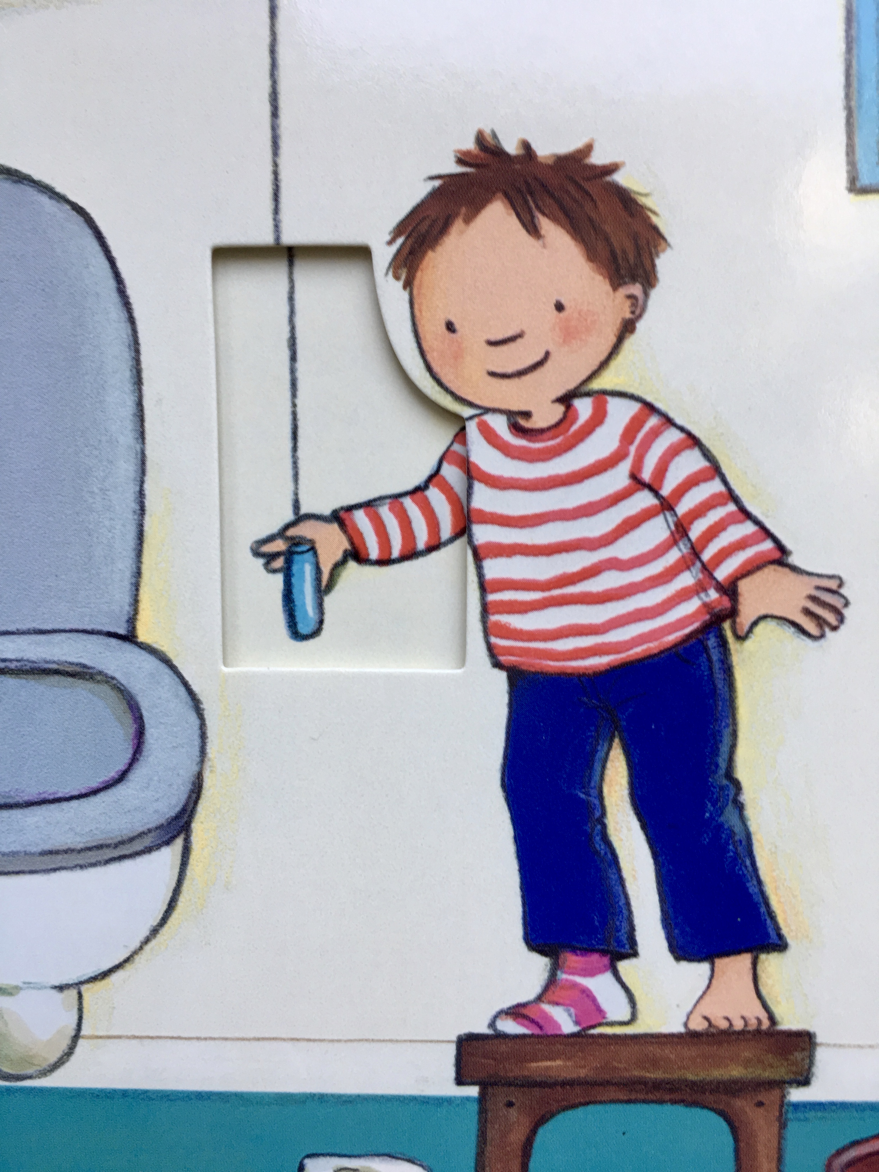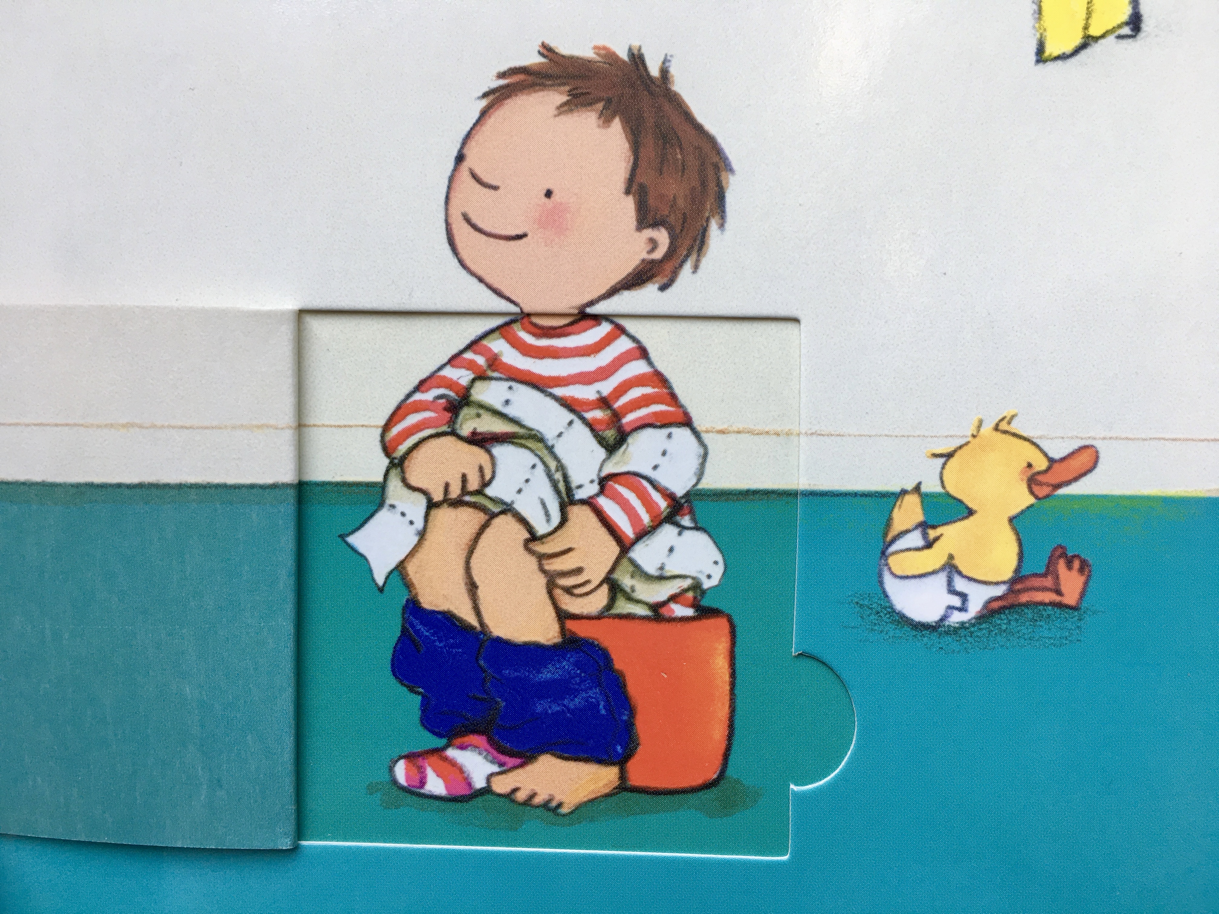 Die Beschäftigung mit dem Töpfchen erfolgt oft spielerisch schon eine Weile bevor es dann wirklich mit dem Abschied von der Windel losgeht. Hilfreich dabei sind einfache, schöne Bücher, welche die verschiedenen ‚Probleme‘ rund um den Umstieg thematisieren. So finden sich auf jeder Doppelseite ein vierzeiliger Reim zu Erfolgen und Misserfolgen des Kleinen Jona beim Sauberwerden.