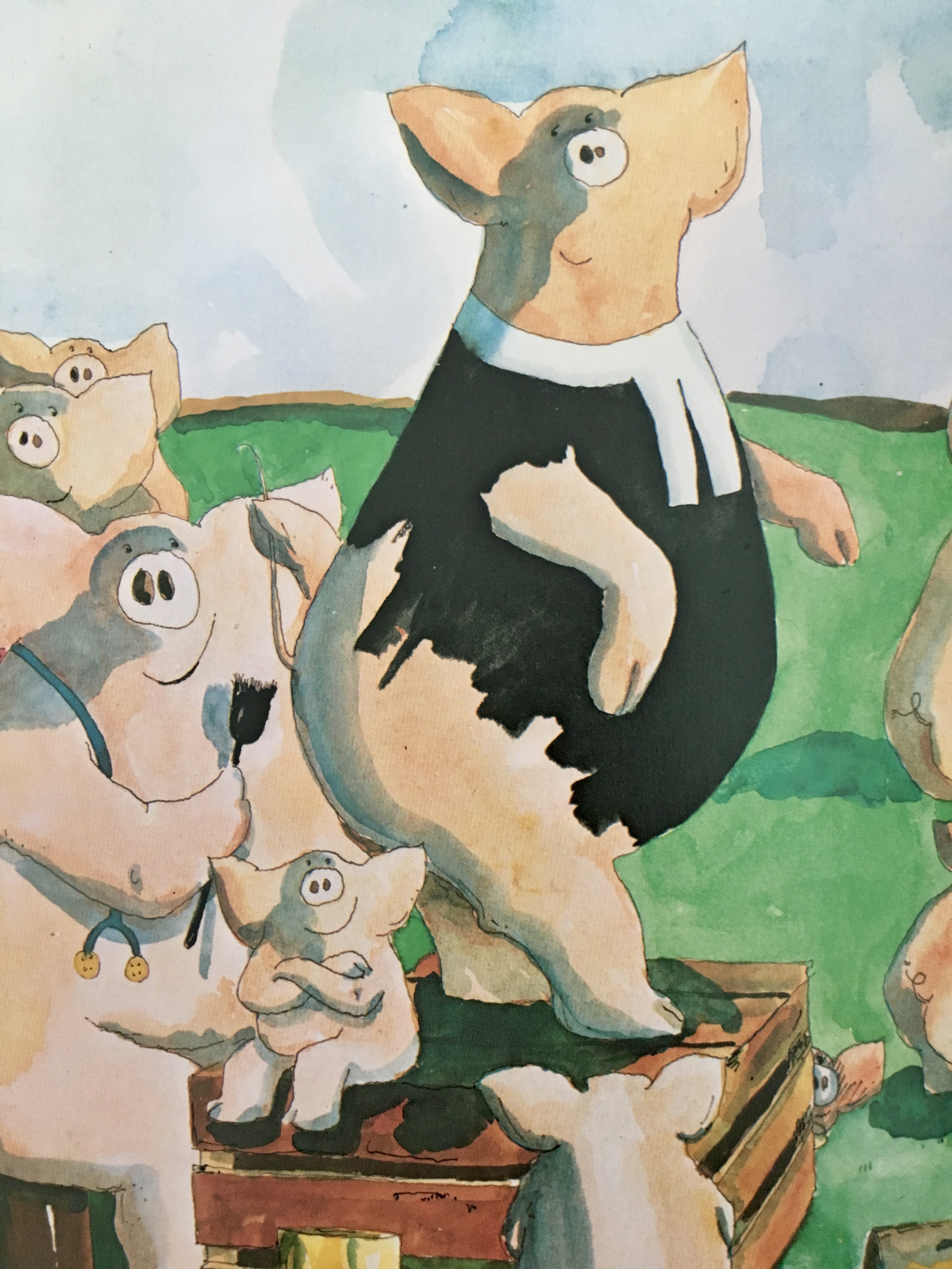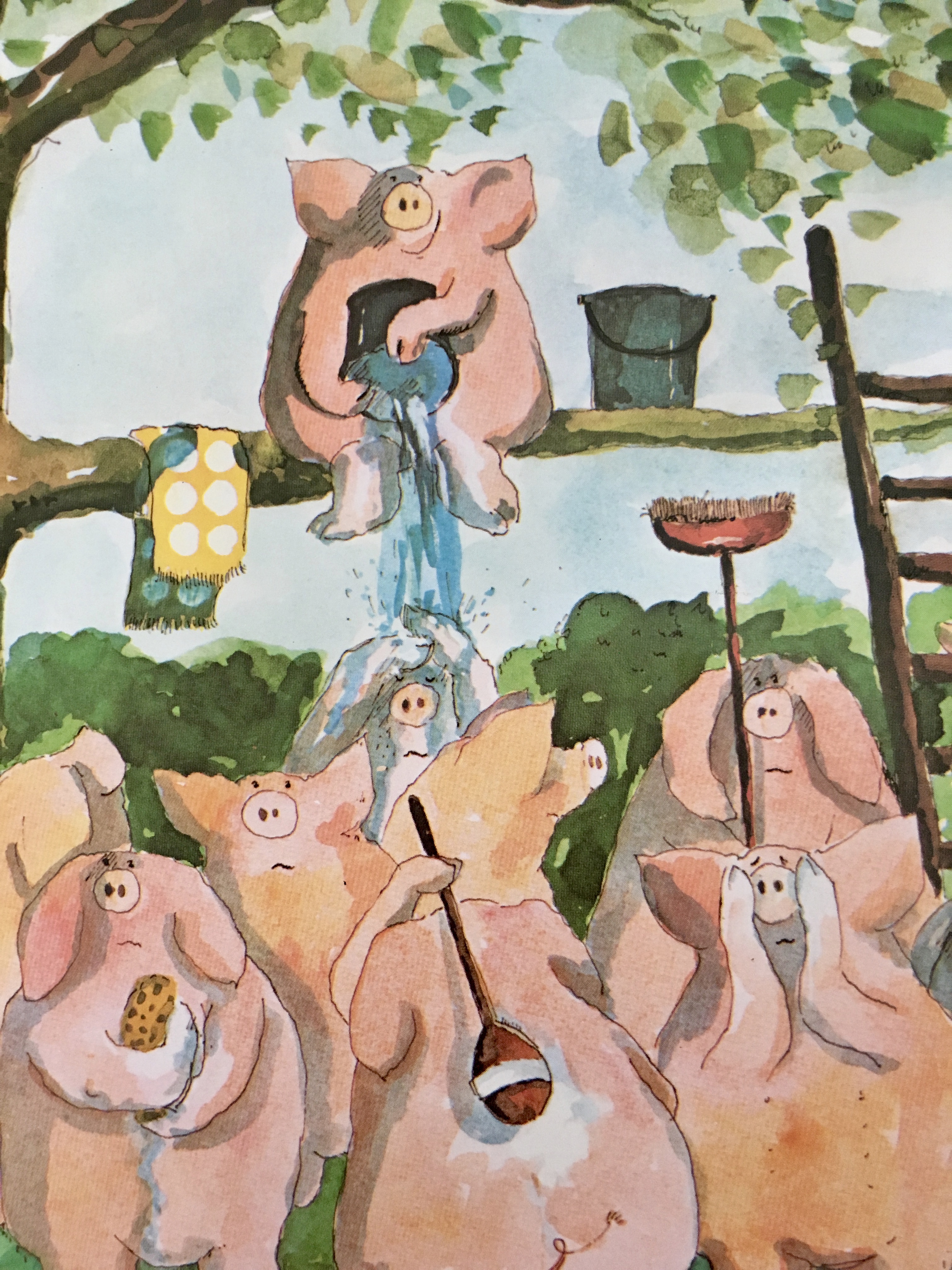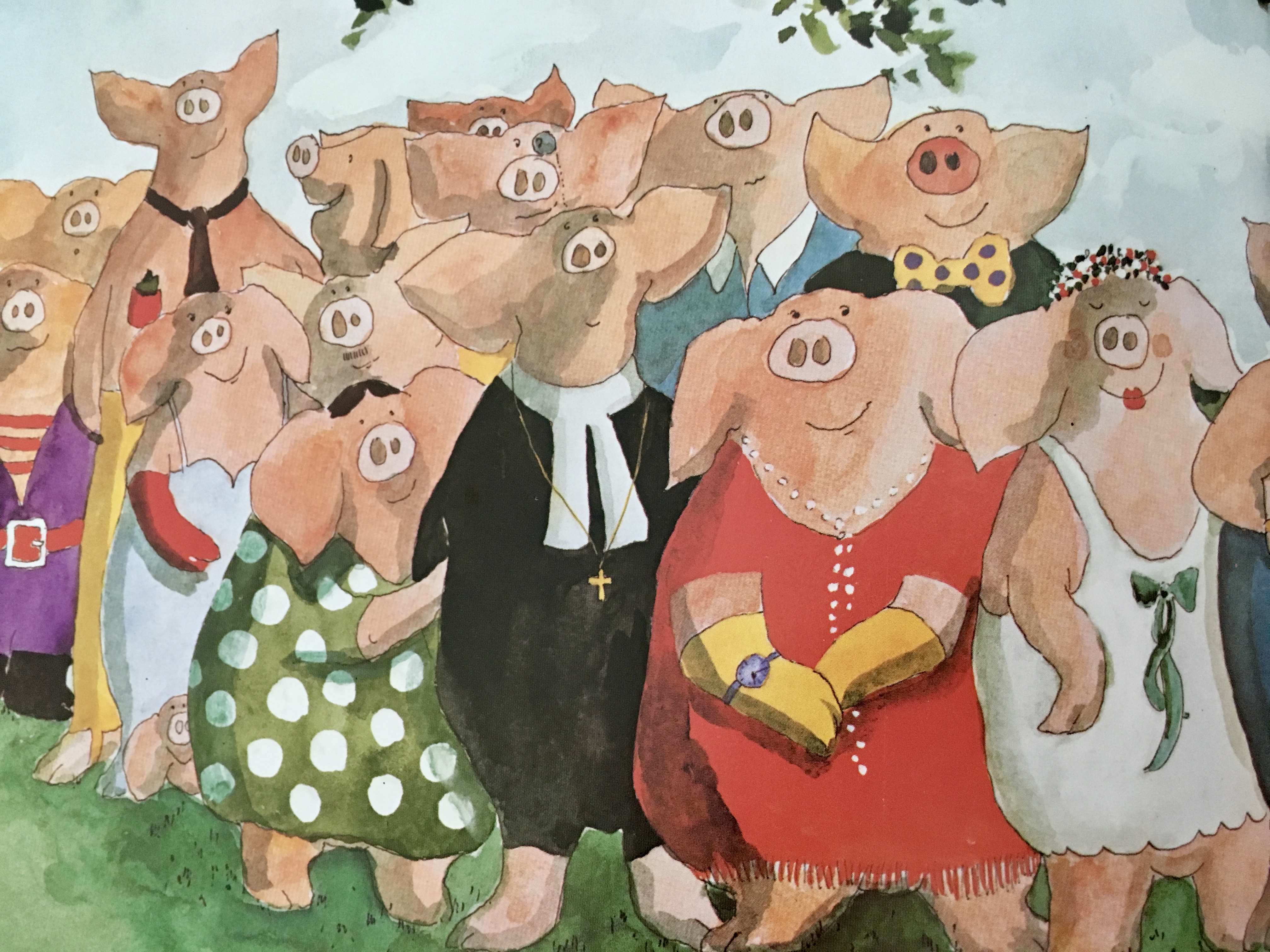 Ein schon 42 Jahre alter, wunderbarer Klassiker ist das Buch von Helme Heine, dass von einer Hochzeit im ‚Swineland‘ erzählt. Ringelschwänzchen und Schwarte haben zur Hochzeit geladen. Zuerst wird die gesamte Hochzeitsgesellschaft fein gemacht, gewaschen und dann hat Schwarte, na warte, eine gute Idee: ‚Wir malen unsere Kleider selbst!‘. Nach Trauung, Hochzeitsmahl und -tanz beginnt es jedoch zu regnen und alle schönen Kleider werden abgewaschen. Aber auch hier weiß Schwarte, na warte, Rat und alle Schweine springen vergnügt und die Matsche. Am Abend, nachdem alle gegangen sind hat Schwarte, na warte, wieder eine tolle Idee: Er malt seiner Braut ein wunderschönes Himmelbett.