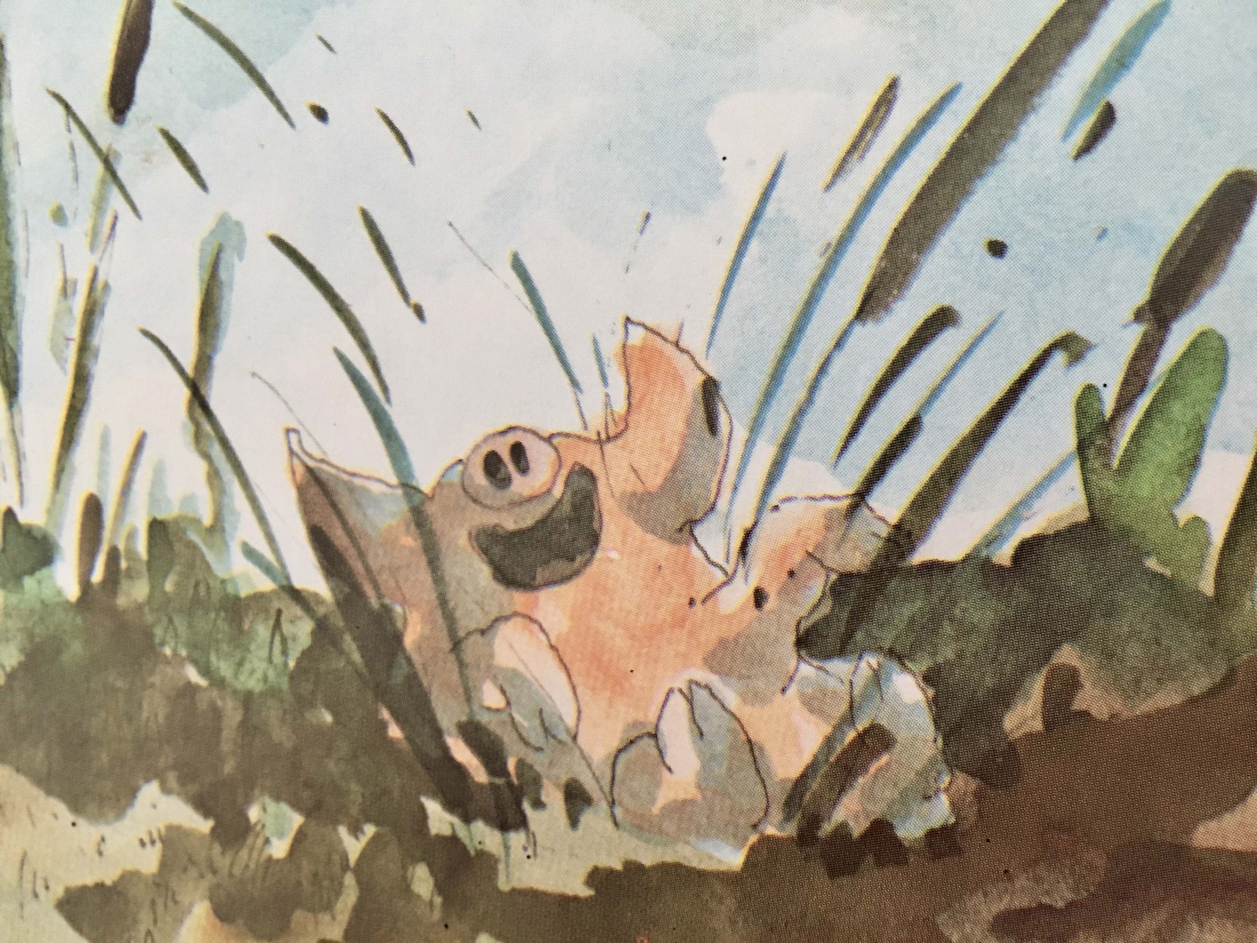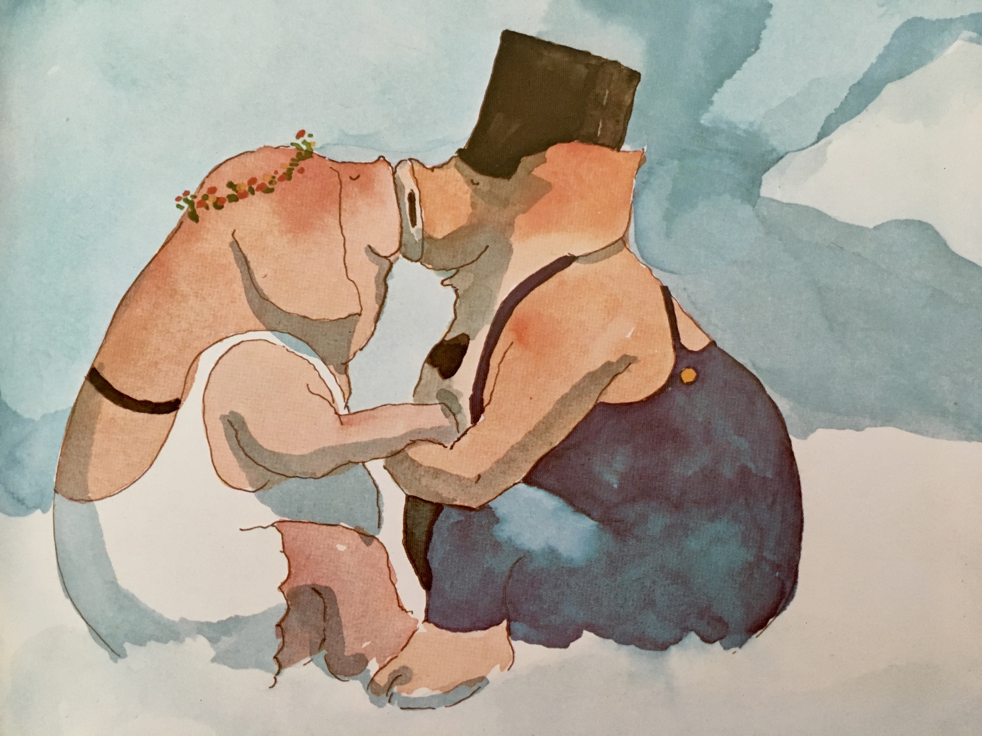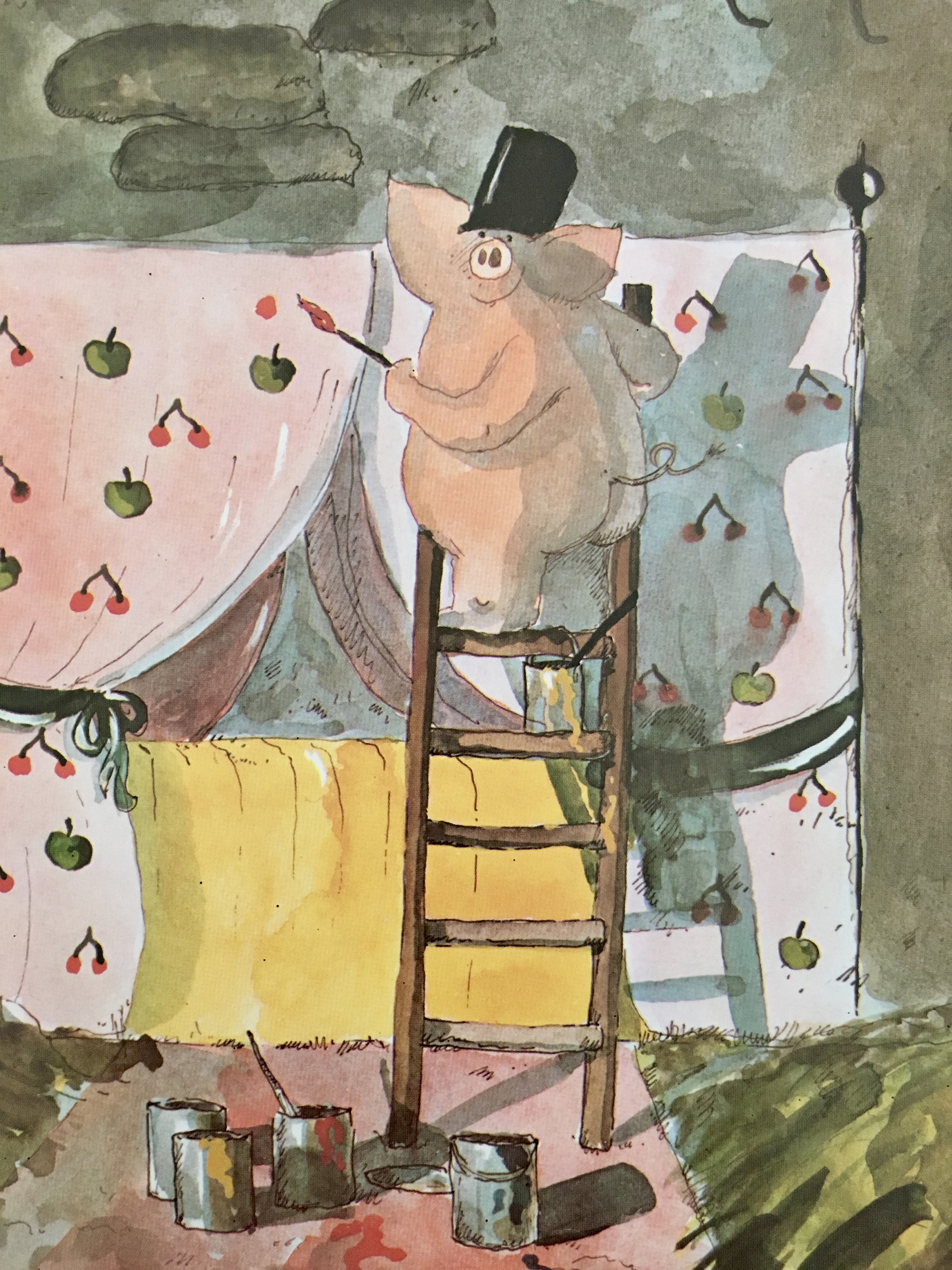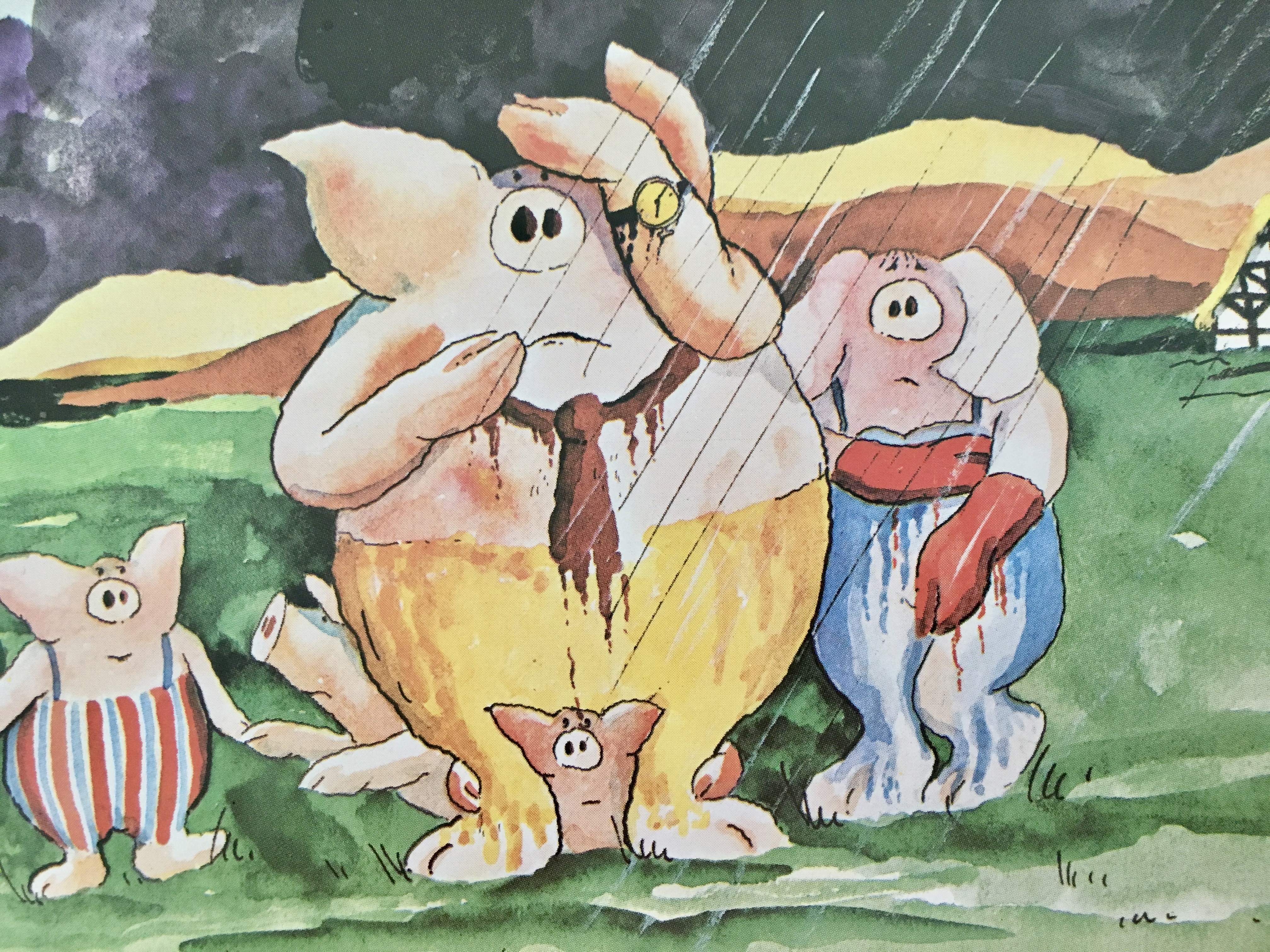 Ein schon 42 Jahre alter, wunderbarer Klassiker ist das Buch von Helme Heine, dass von einer Hochzeit im ‚Swineland‘ erzählt. Ringelschwänzchen und Schwarte haben zur Hochzeit geladen. Zuerst wird die gesamte Hochzeitsgesellschaft fein gemacht, gewaschen und dann hat Schwarte, na warte, eine gute Idee: ‚Wir malen unsere Kleider selbst!‘. Nach Trauung, Hochzeitsmahl und -tanz beginnt es jedoch zu regnen und alle schönen Kleider werden abgewaschen. Aber auch hier weiß Schwarte, na warte, Rat und alle Schweine springen vergnügt und die Matsche. Am Abend, nachdem alle gegangen sind hat Schwarte, na warte, wieder eine tolle Idee: Er malt seiner Braut ein wunderschönes Himmelbett.