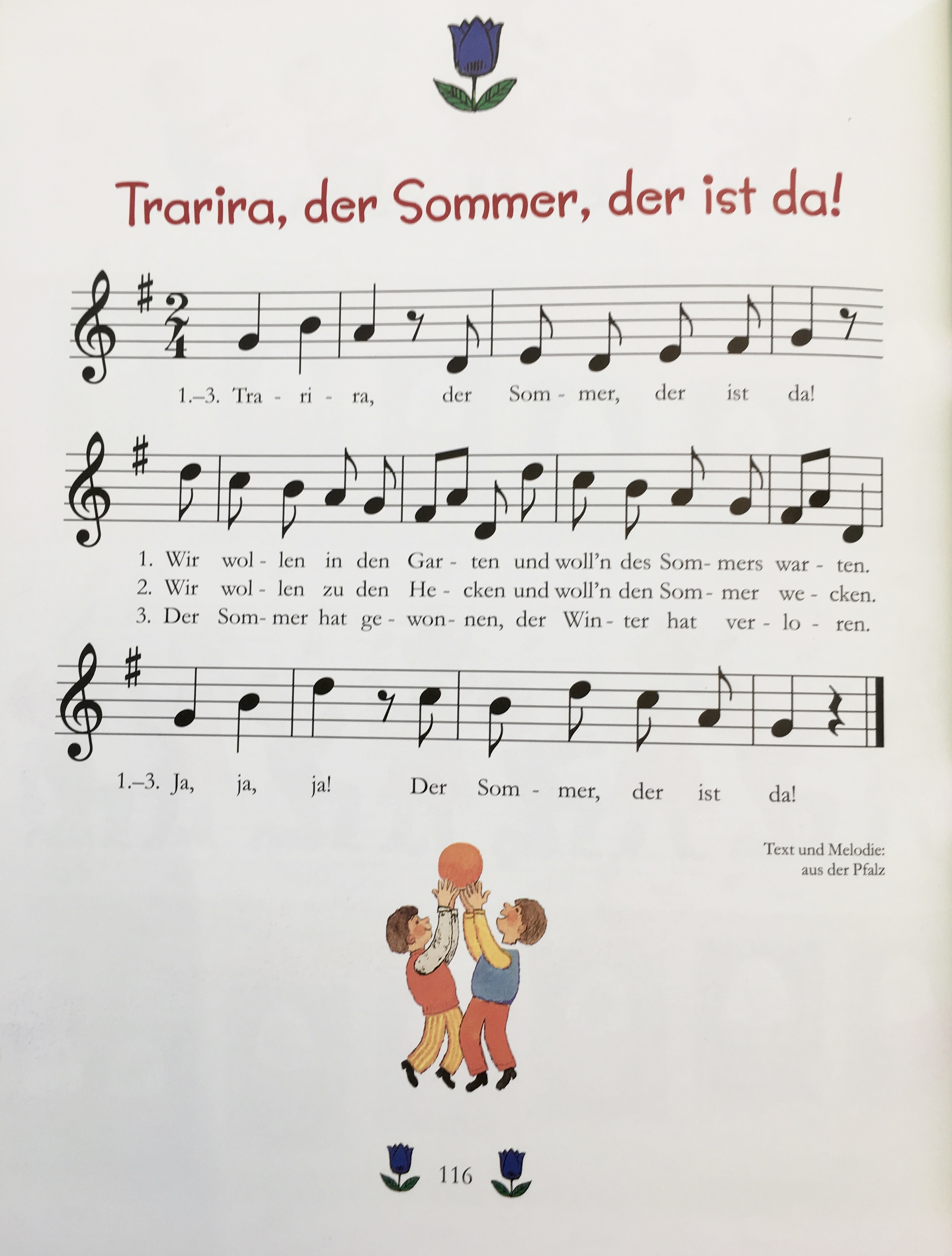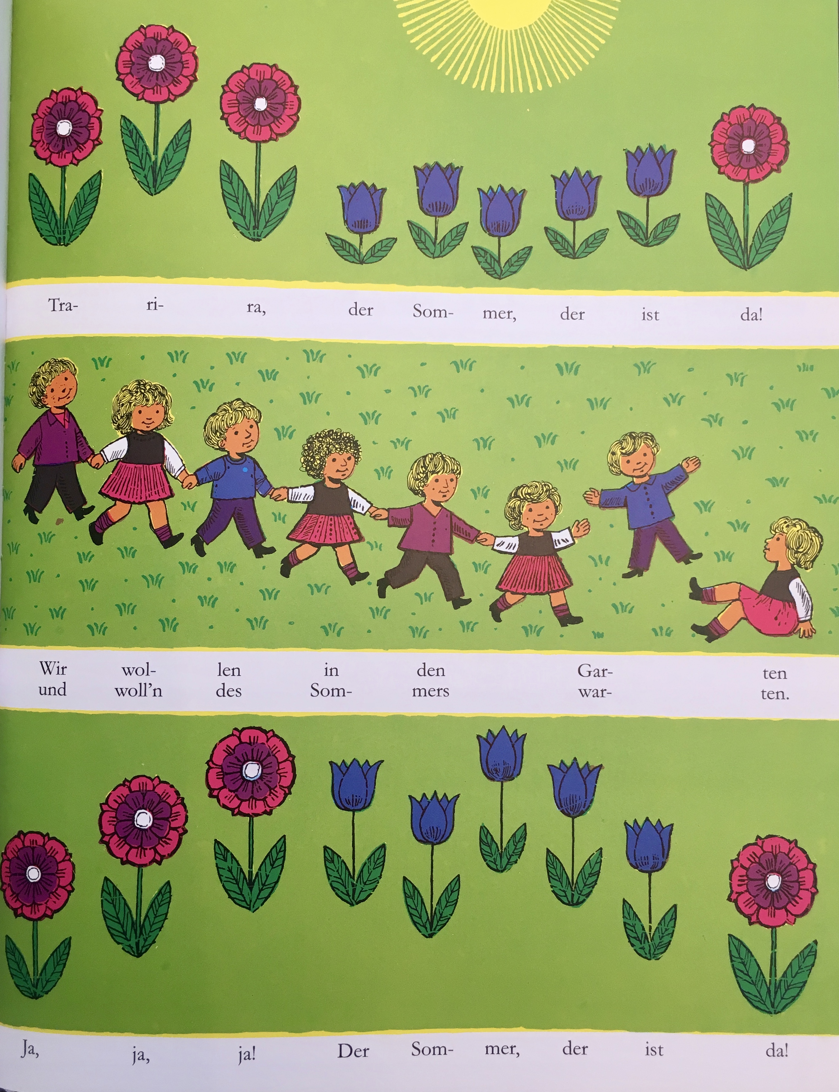 In der großen Liederfibel befinden sich Noten, Texte und Bilderbogen von insgesamt 70 Klassikern von ‚A,B,C‘ über ‚Bruder Jakob‘ und ‚Fuchs du hast die Gans gestohlen‘ bis zu ‚Schlaf, Kindlein Schlaf‘ und ‚Wer will fleissige Handwerker sehen‘.