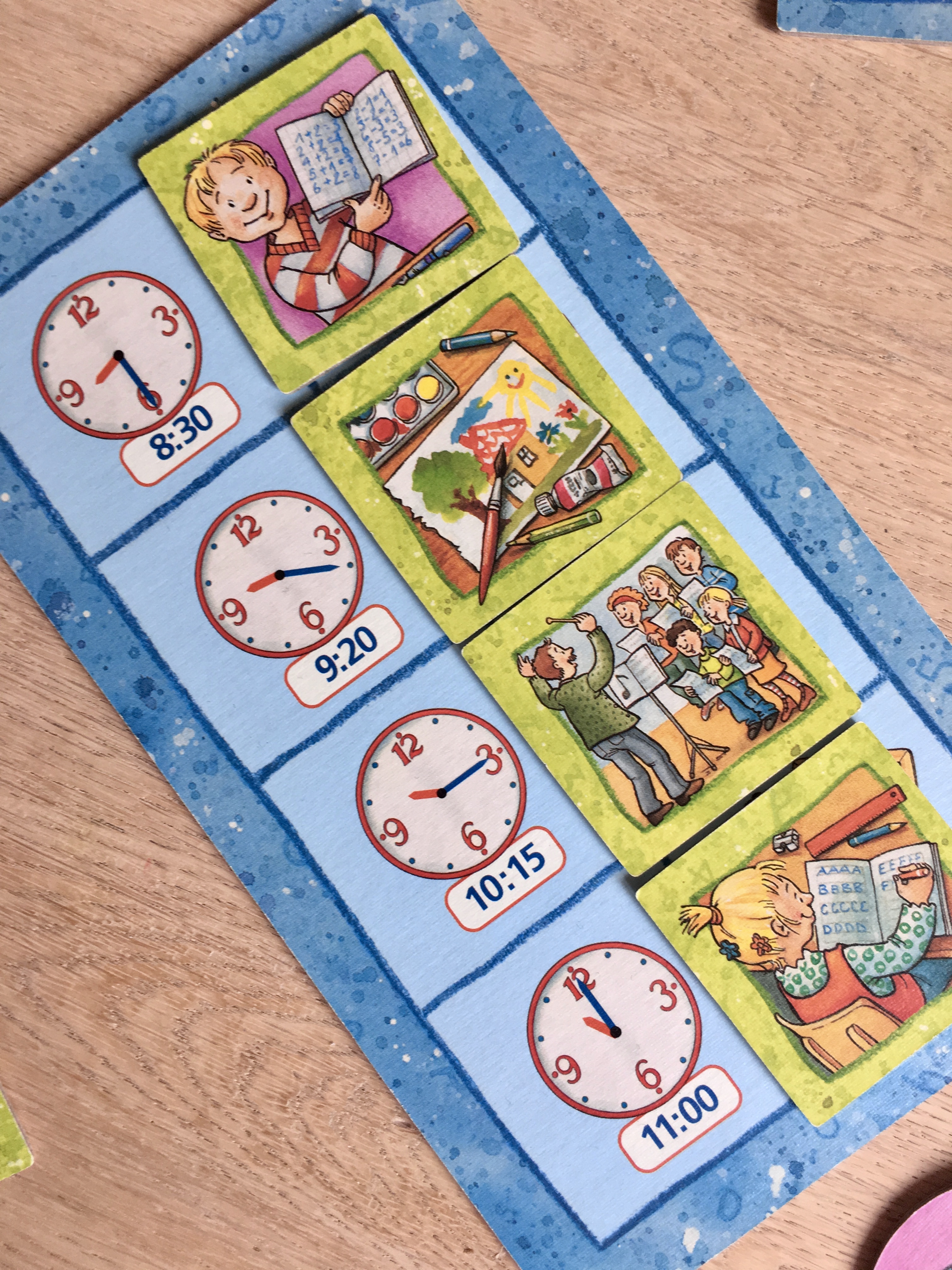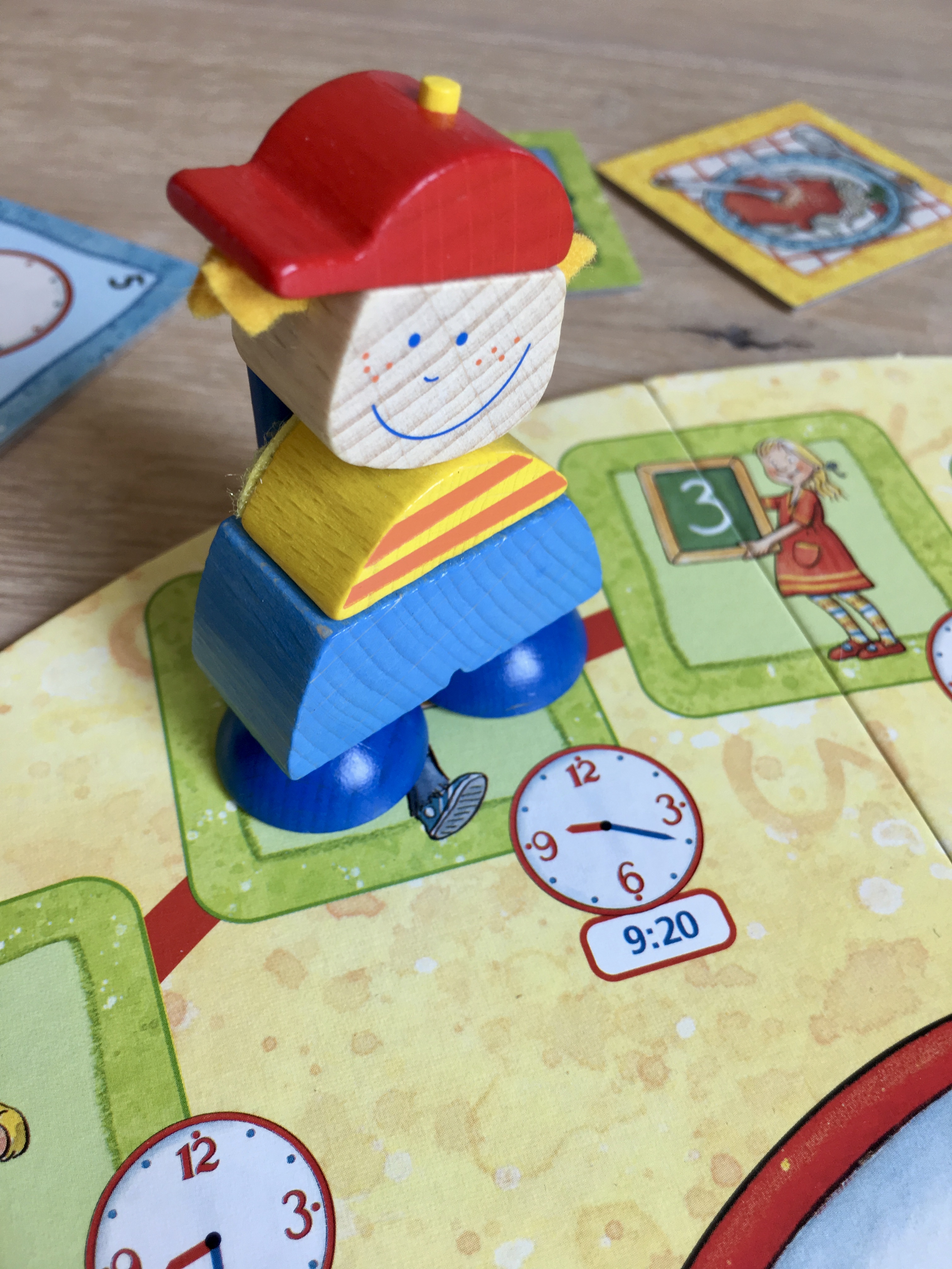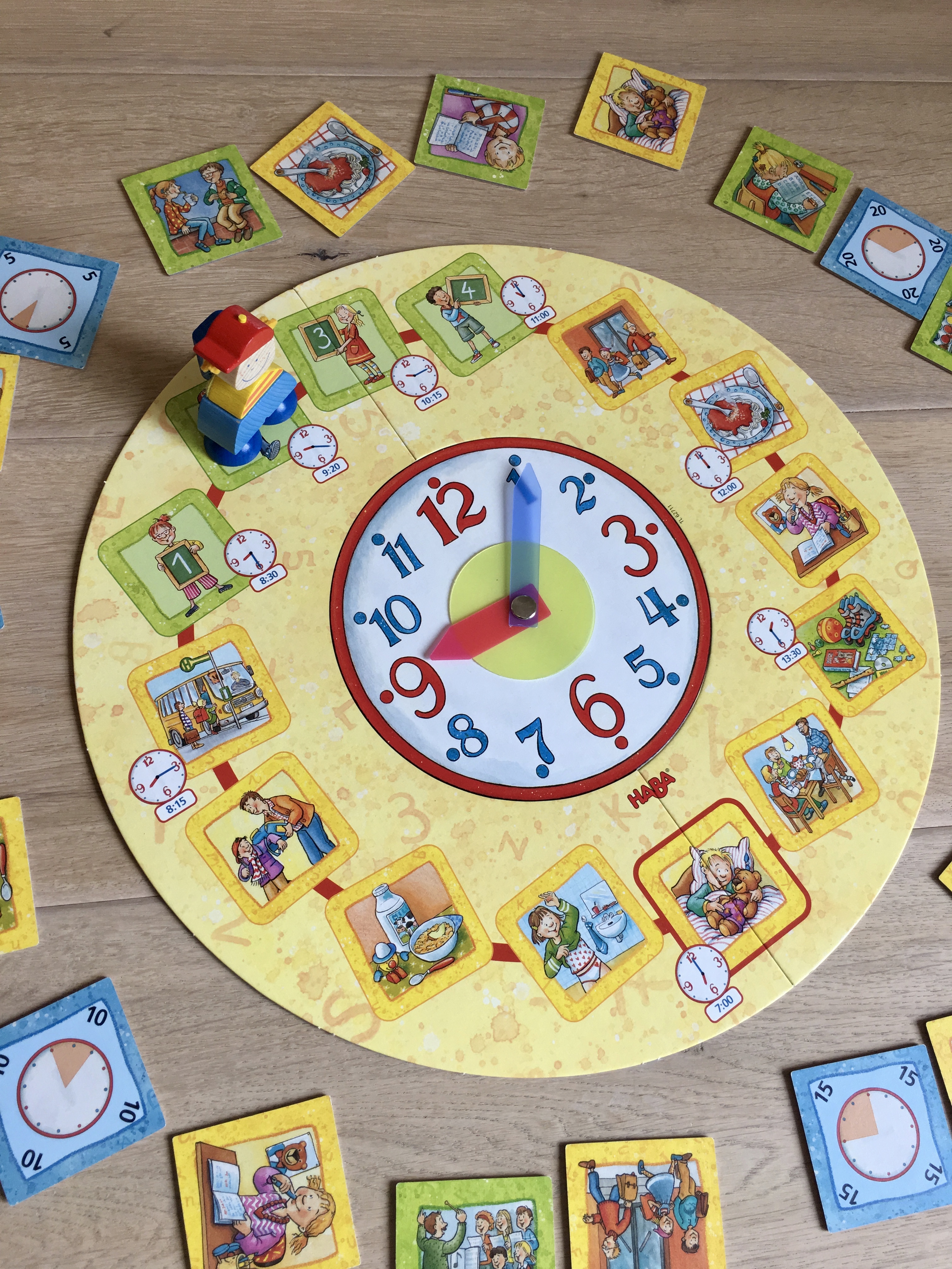 In der Mitte liegt ein Spielbrett mit einer Uhr. Ziel ist es den ganzen Tag zu gestalten und dabei immer pünktlich zur angegebenen Uhrzeit da zu sein. Dabei funktioniert das Spiel prinzipiell wie Memory, denn man muss sich merken, wo die Karten für die nächste Aktivität (z.B. Anziehen oder Abendessen) oder die folgende Schulstunde abgelegt sind. Nimmt man die falsche Karte und erwischt gar eine Uhr, dann rückt die Zeit in der Spielmitte weiter vor und man kommt vielleicht zu spät. (Dafür gäbe es dann eine Schlafmützenkarte). Wird die richtige Karte aufdeckt, kann man sie behalten. Wer am Ende des Tages die meisten Karten gesammelt hat, hat gewonnen.
