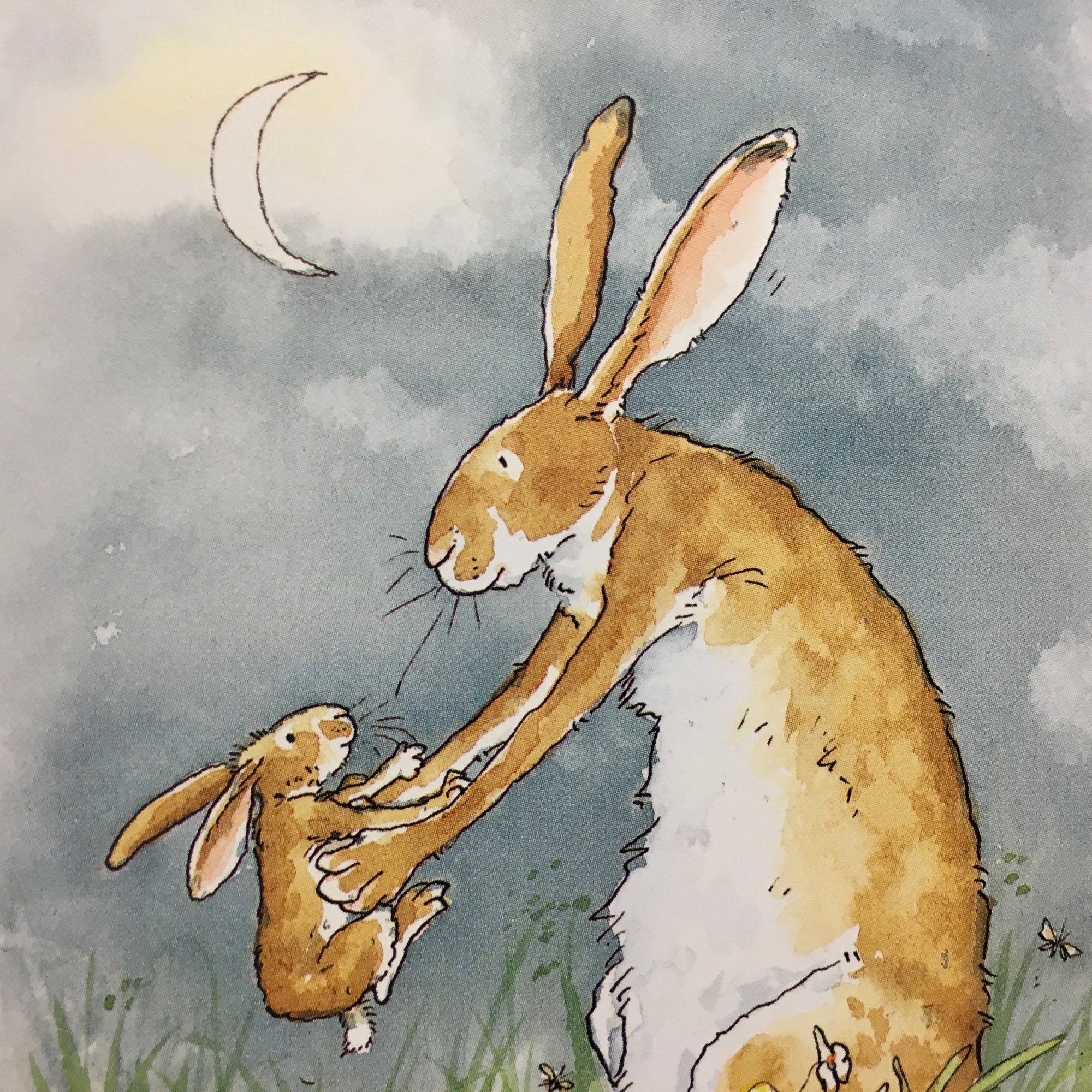 Ein wunderschöner Kinderbuch-Klassiker, der den Versuch des kleinen Hasen schildert, auszudrücken, wie lieb er den großen Hasen hat. Natürlich kann der große Hase seine Arme viel weiter ausbreiten, viel höher reichen und höher hüpfen. Doch beim Einschlafen hat der kleine Hase eine Idee: „Ich hab dich lieb bis zum Mond“. Der große Hase lächelt und flüstert: „Bis zum Mond und wieder zurück haben wir uns lieb.“