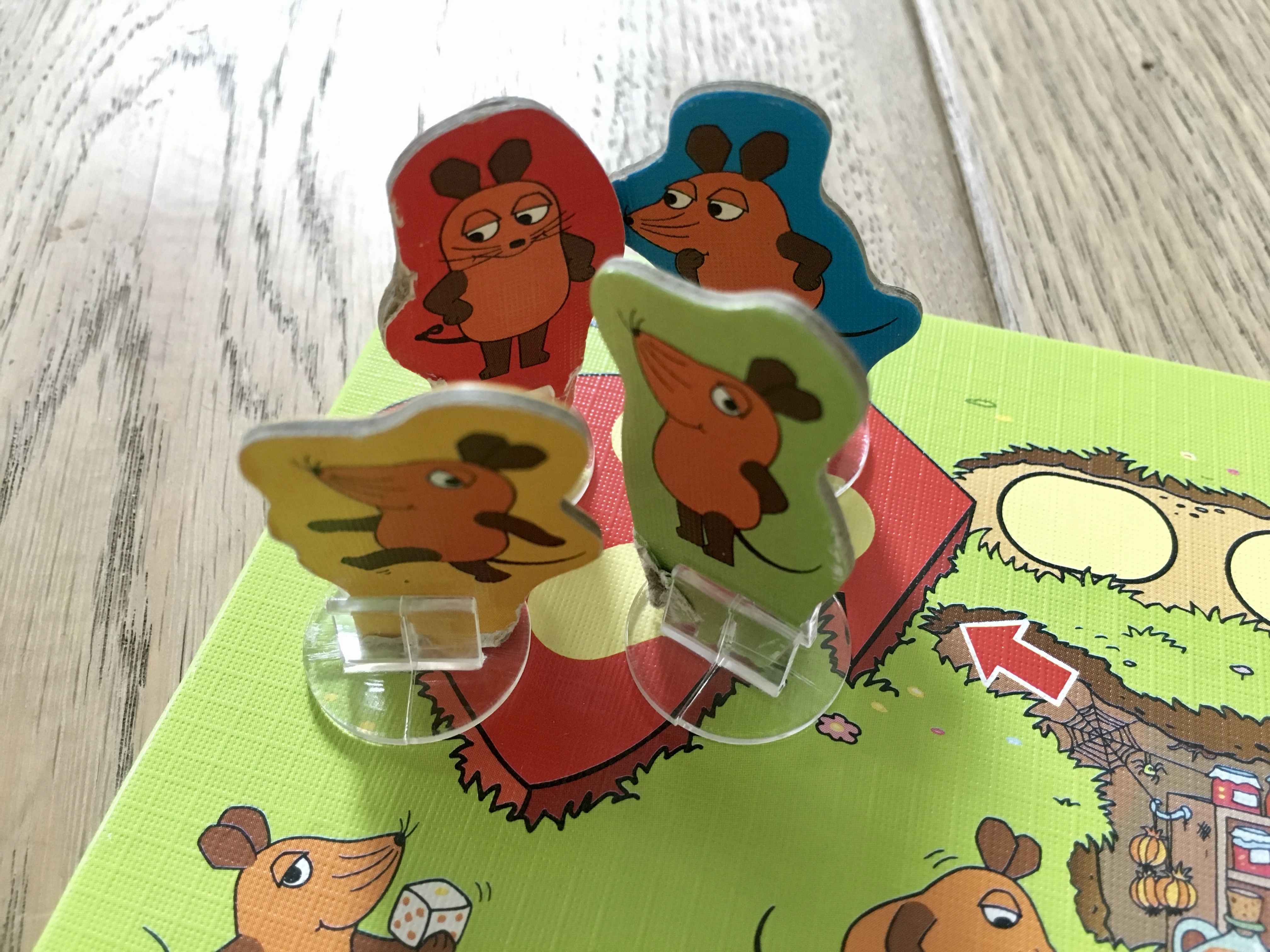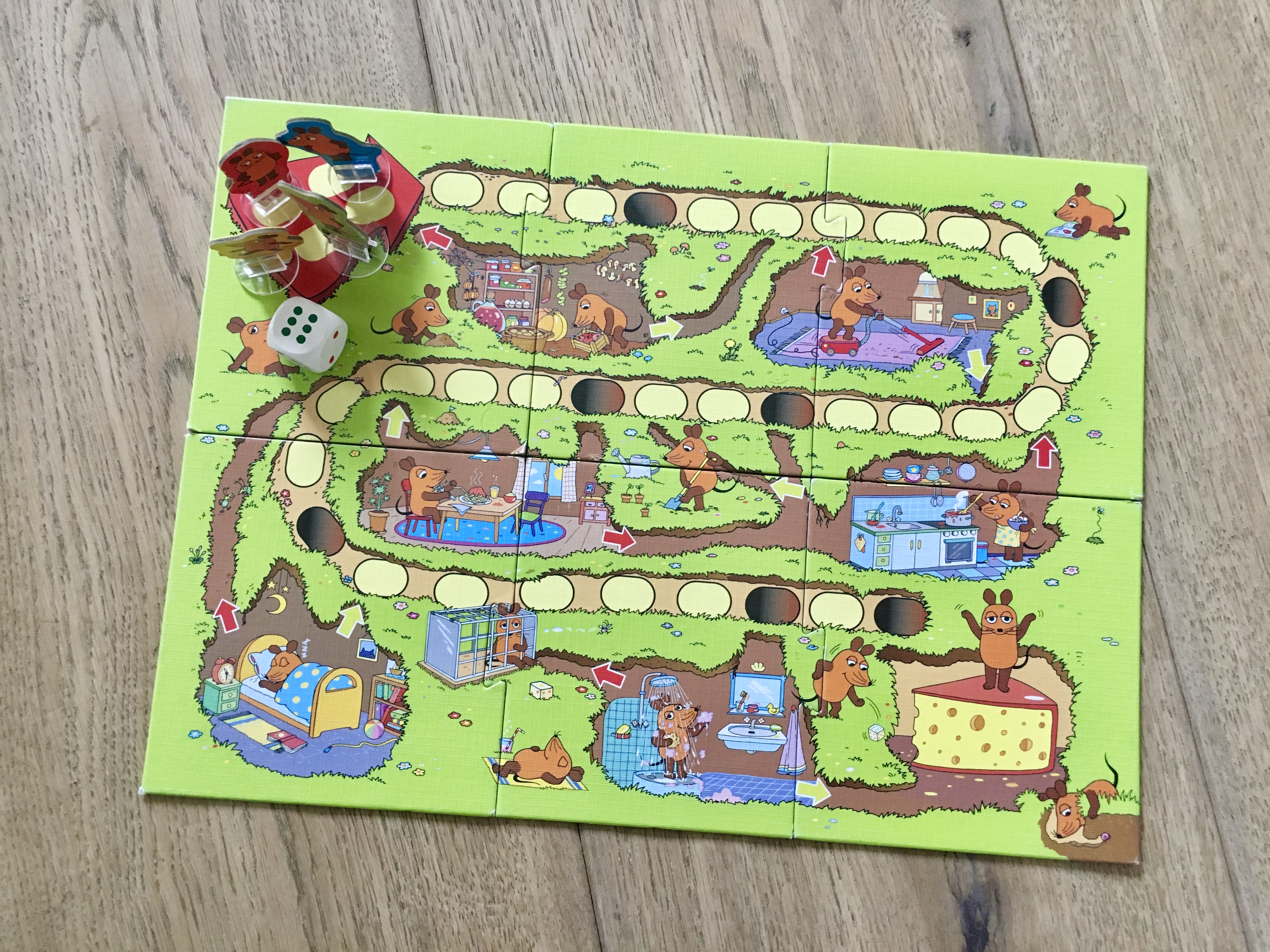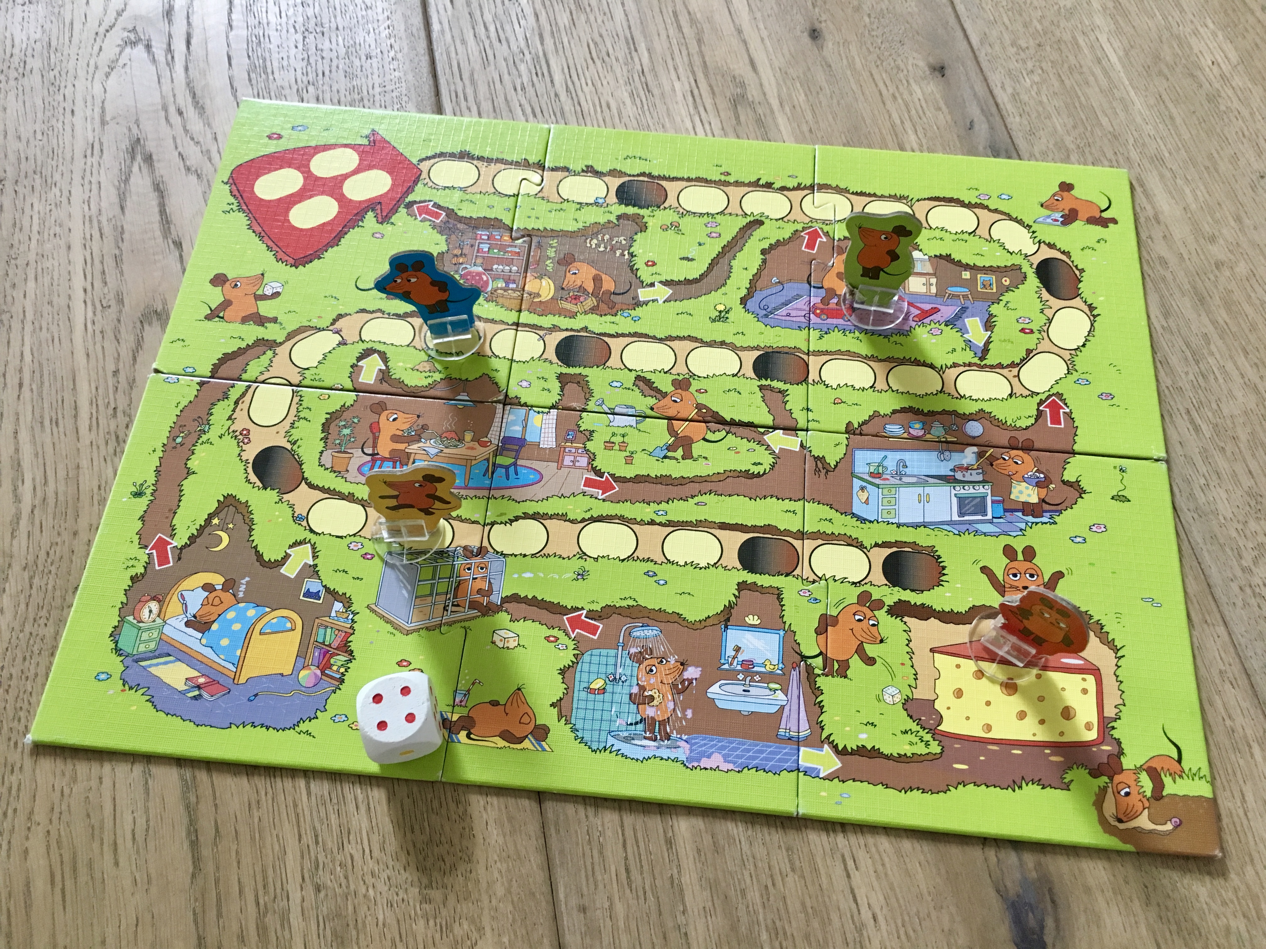Die Spieler würfen reihum und setzten ihre Maus-Figur entsprechend weiter. Kommt eine Maus auf ein Mauseloch, ‚fällt‘ man ein Maus-Zimmer. er nächste Wurf entscheidet, ob man eine Abkürzung nehmen darf (grüne sechs), einen Umweg nehmen muss (rote zwei, vier oder fünf) oder einmal aussetzen muss (gelbe eins). Kurz vor dem Ziel wartet außerdem die ‚Mausefalle‘, hier muss der Spieler sogar zweimal aussetzen…