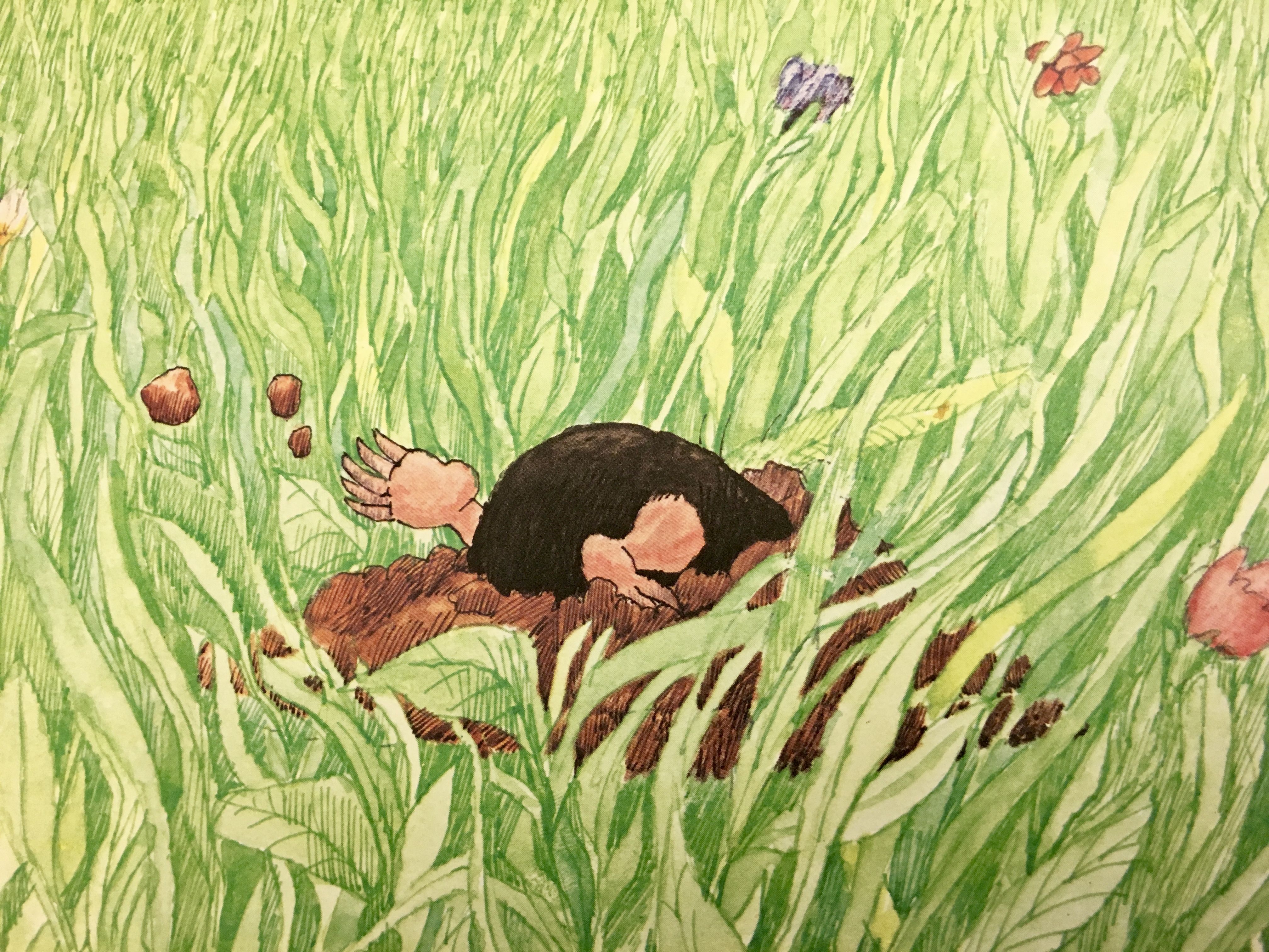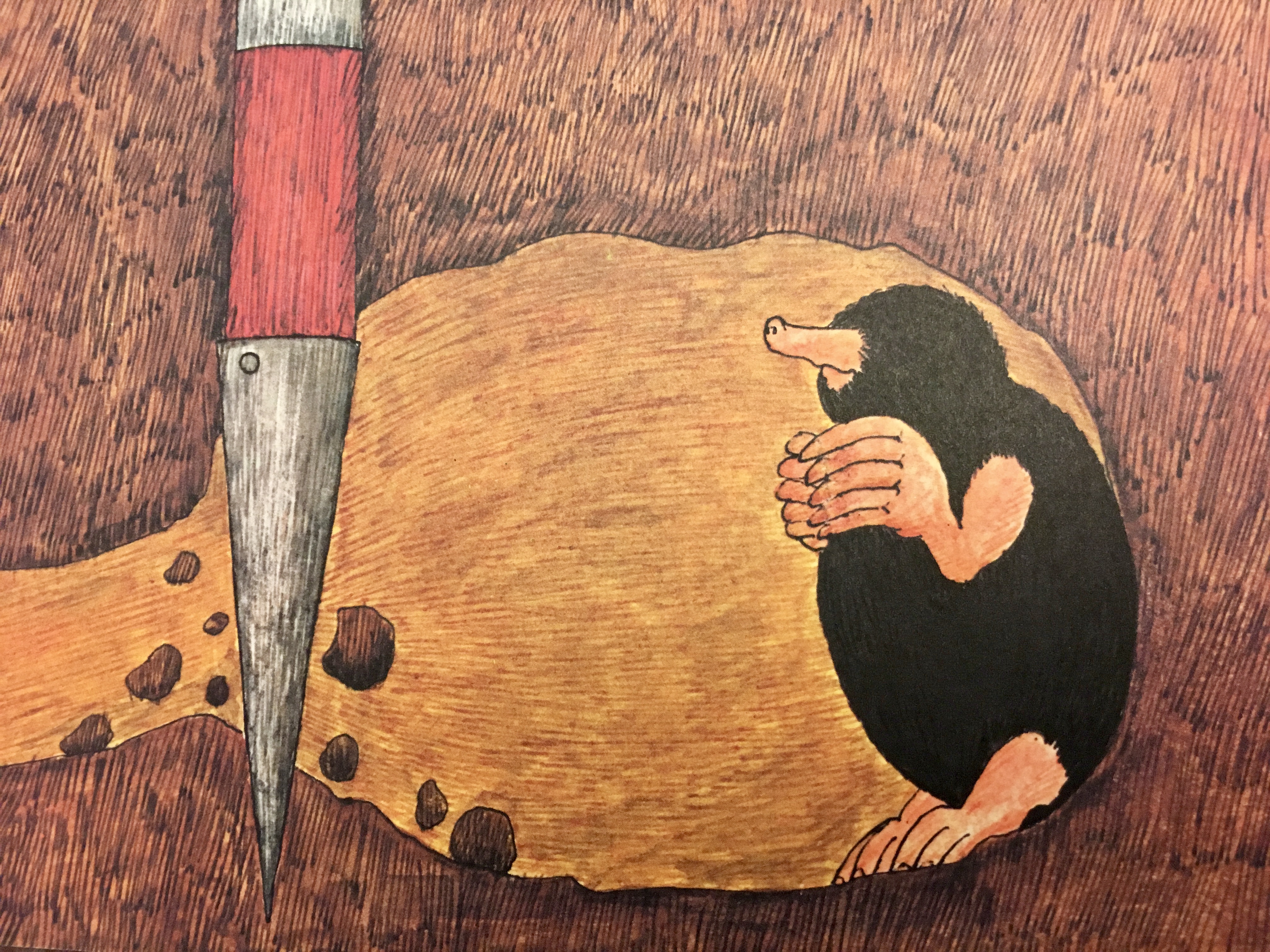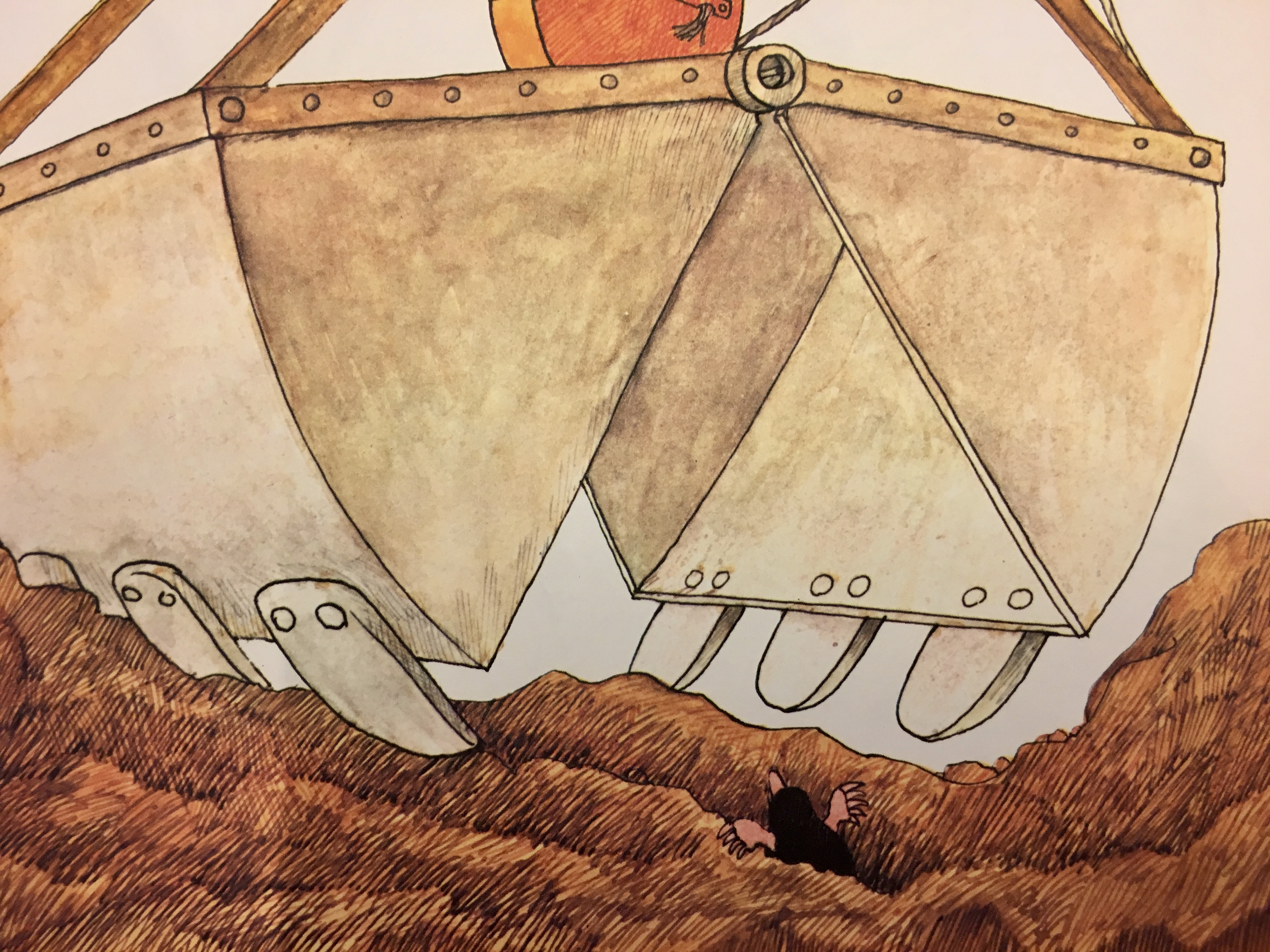 Die Bilder zeigen eindrucksvoll, welche Dinge, dem kleinen Maulwurf widerfahren. Mal weit schweifend, mal im Detail, zeigen sie das, was gerade in der Geschichte wichtig ist. Dabei sind die Bilder schon manchmal bedrückend, wenn man beispielsweise sieht, wie der kleine Maulwurf von einem riesigen Bagger gepackt wird und erfordern sicher nochmal eine gesonderte Ansprache des Kindes.