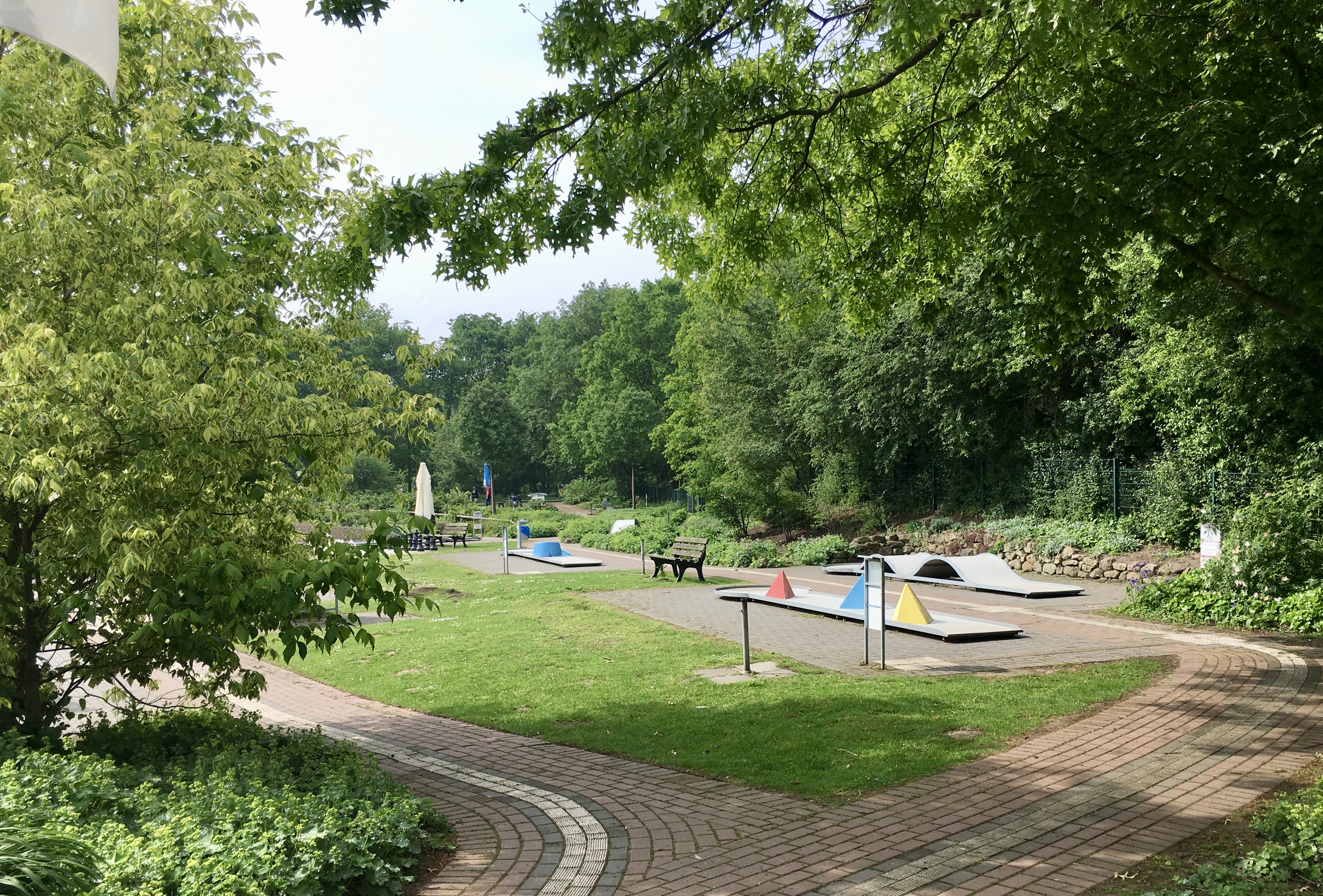 Zwischen beiden Spielplätzen gibt es eine Mini-Golf-Anlage mit 16 Bahnen. und ein Schachfeld.