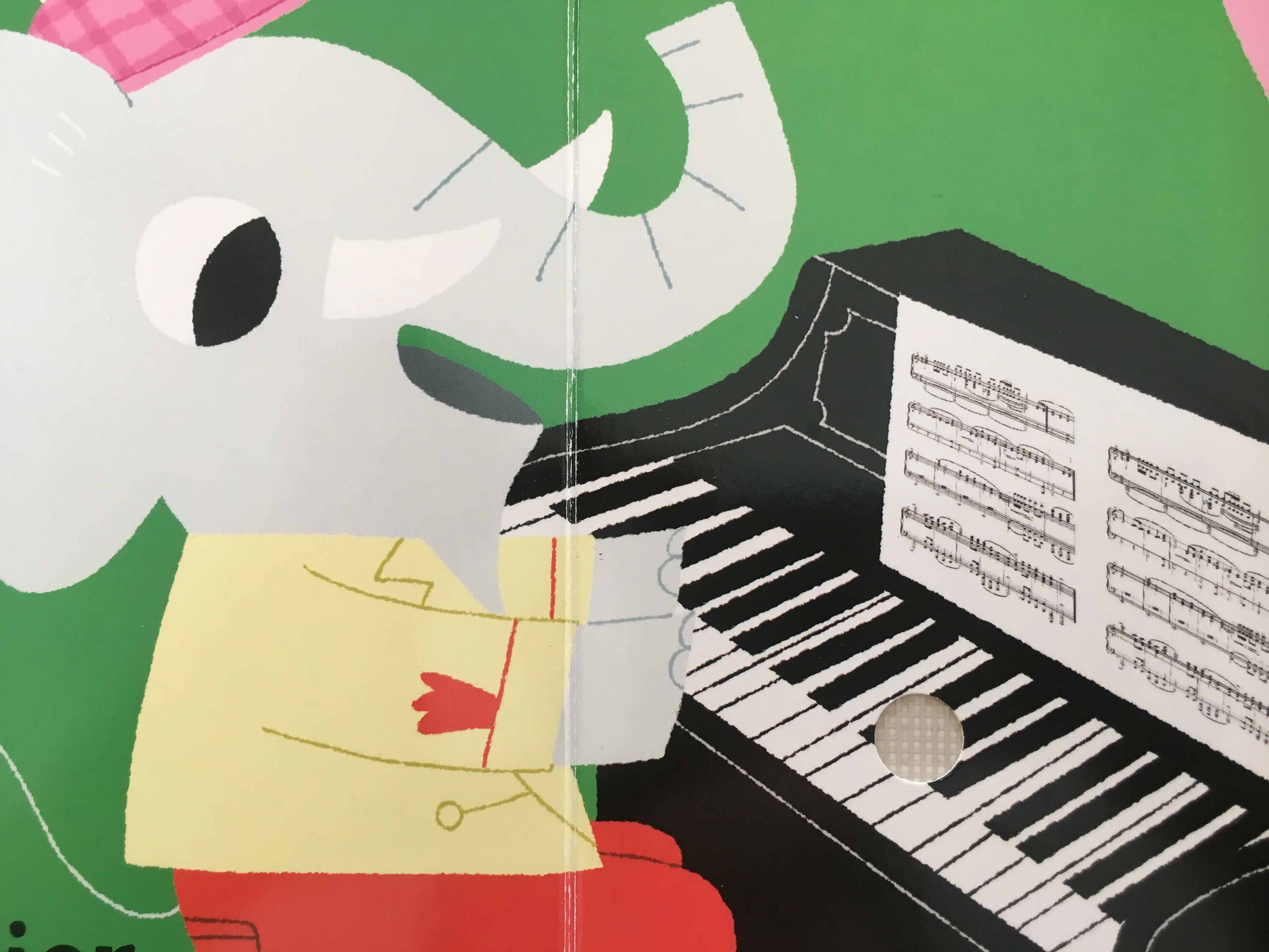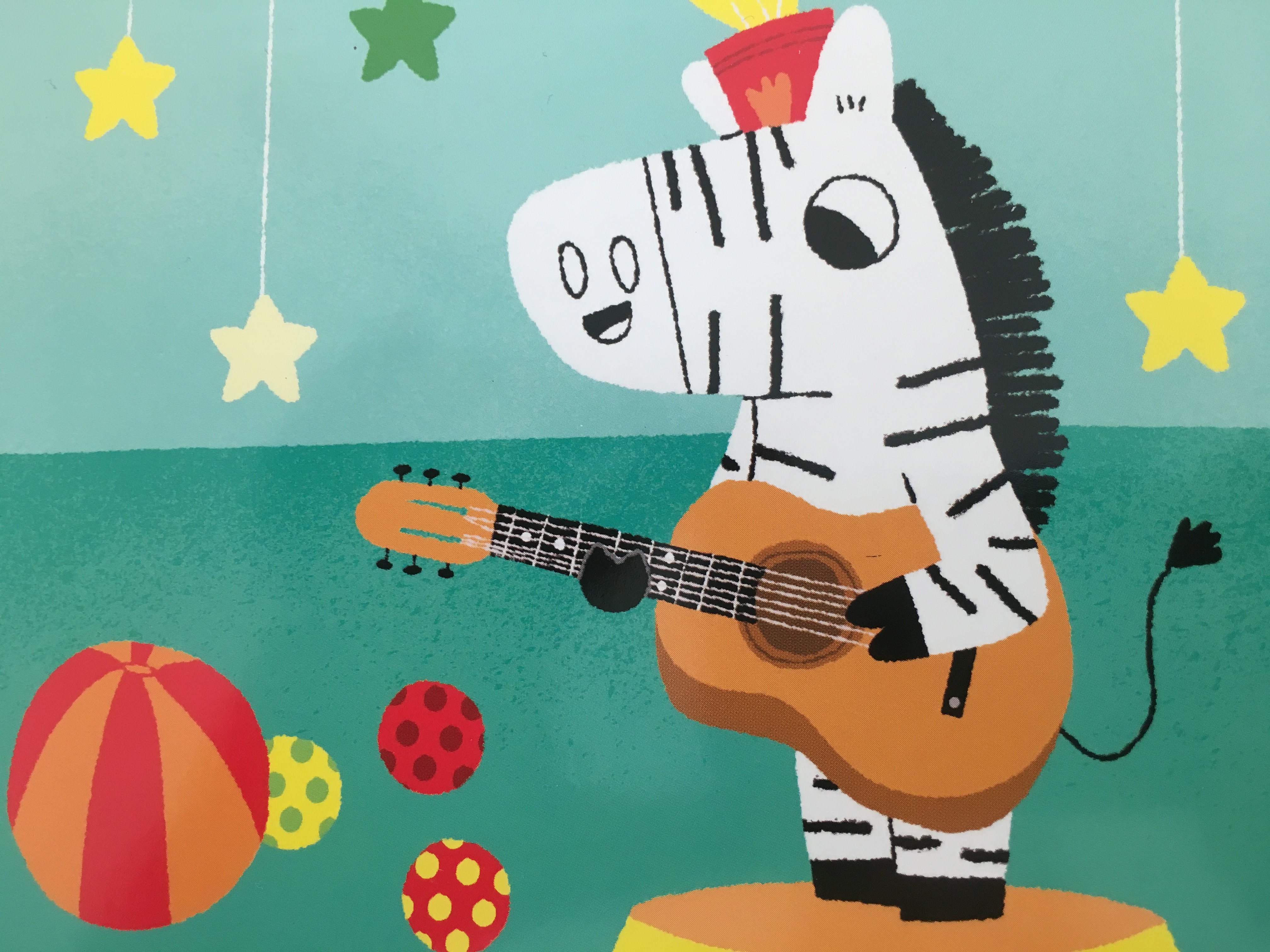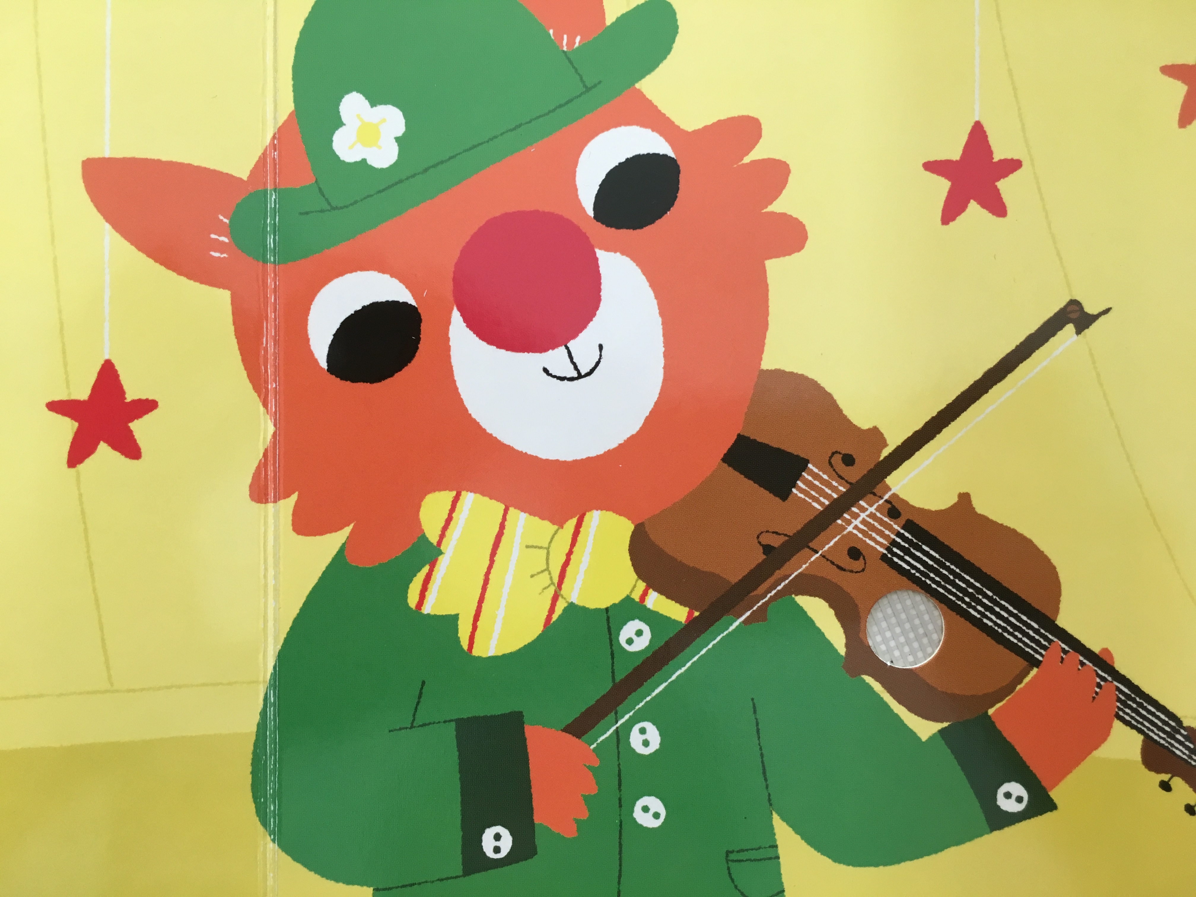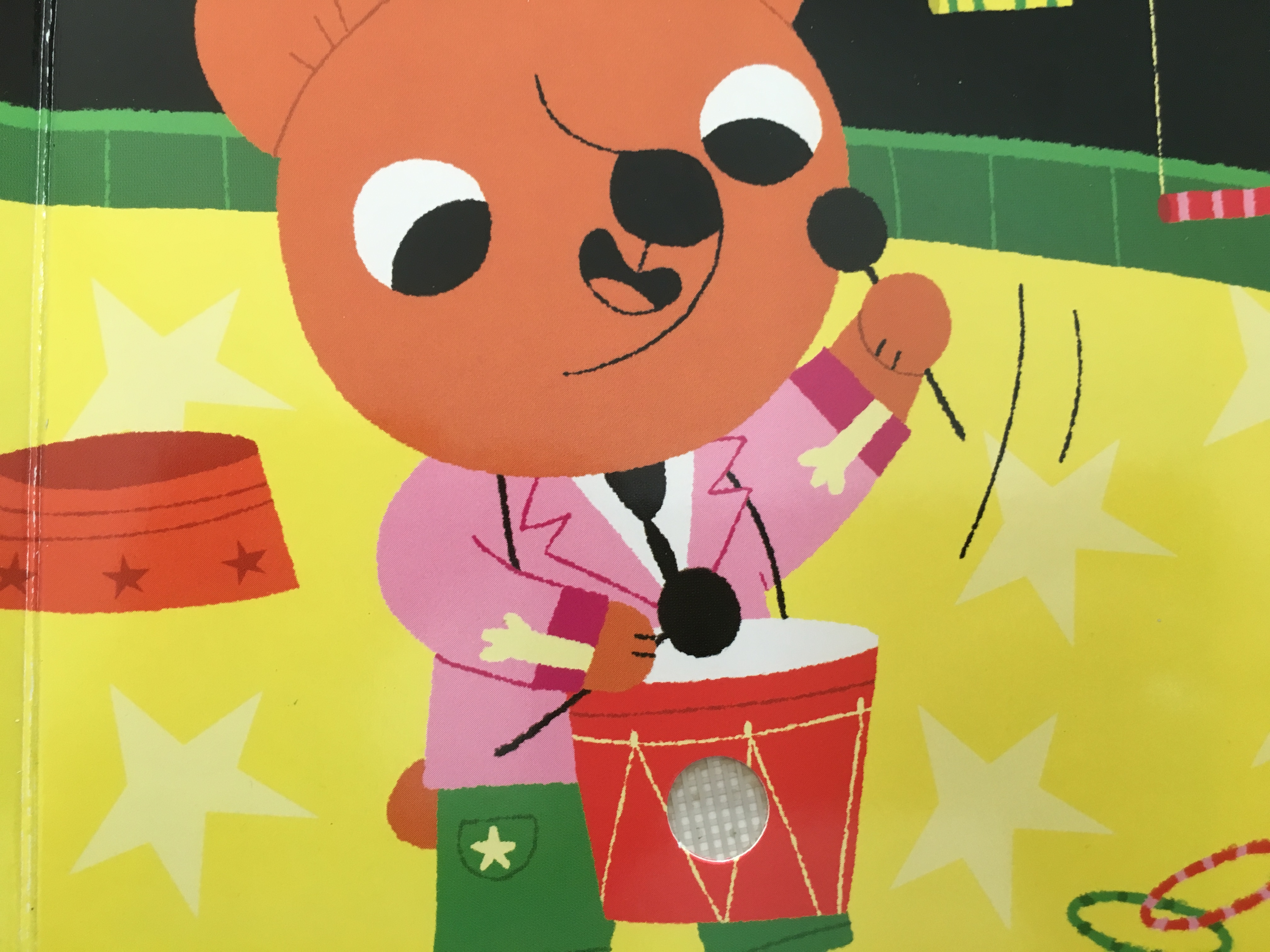 Verschiedene Tiere spielen die einzelnen Instrumente, die auf jeweils einer Doppelseite dargestellt sind. Flächige, Kind gerecht einfache Darstellungen zeigen die Instrumente in Aktion. Pro Seite kann ein Kreis gedrückt werden und das entsprechend Musikstück wird abgespielt. Und zum Glück für die Eltern hat das buch hinten auch einen ‚Aus‘-Schalter. 🙂