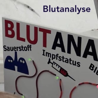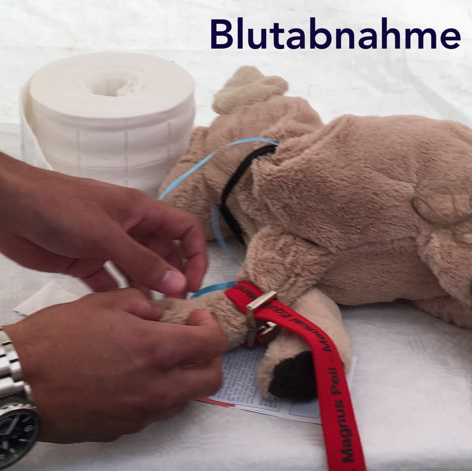 Es folgt die Blutabnahme mit der Blutanalyse (zum Beispiel Sauerstoff, Impfstatus oder Kuschel-Index).