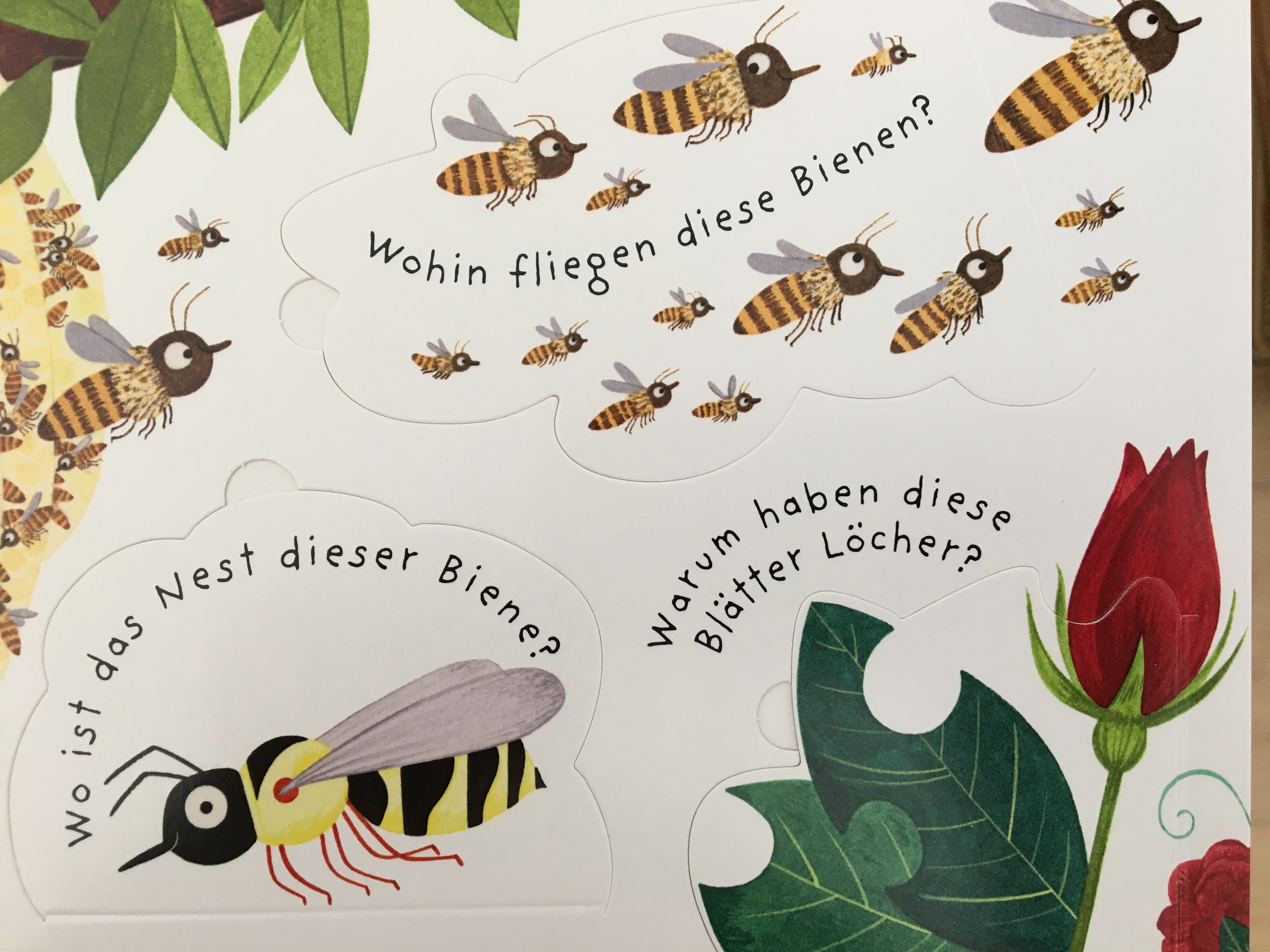 Die schöne Illustration und Gestaltung sowie die über 50 Klappen auf zwölf Seiten machen das Buch zu einem spielerischen Erlebnis für kleine Kinder. Hinter jeder dieser Klappen verbirgt sich die Antwort auf eine Frage. Es wird also mehr angeschaut als gelesen.