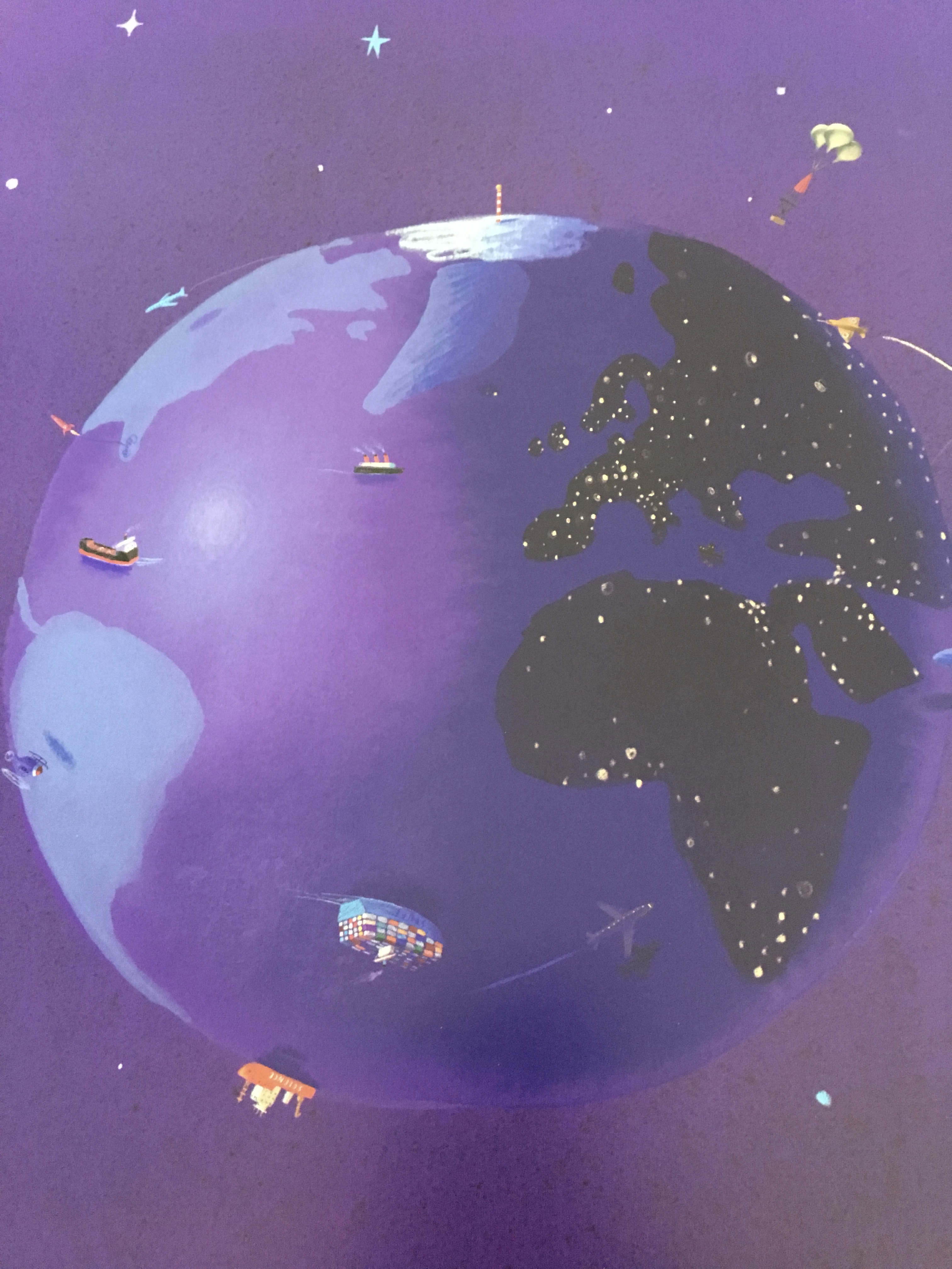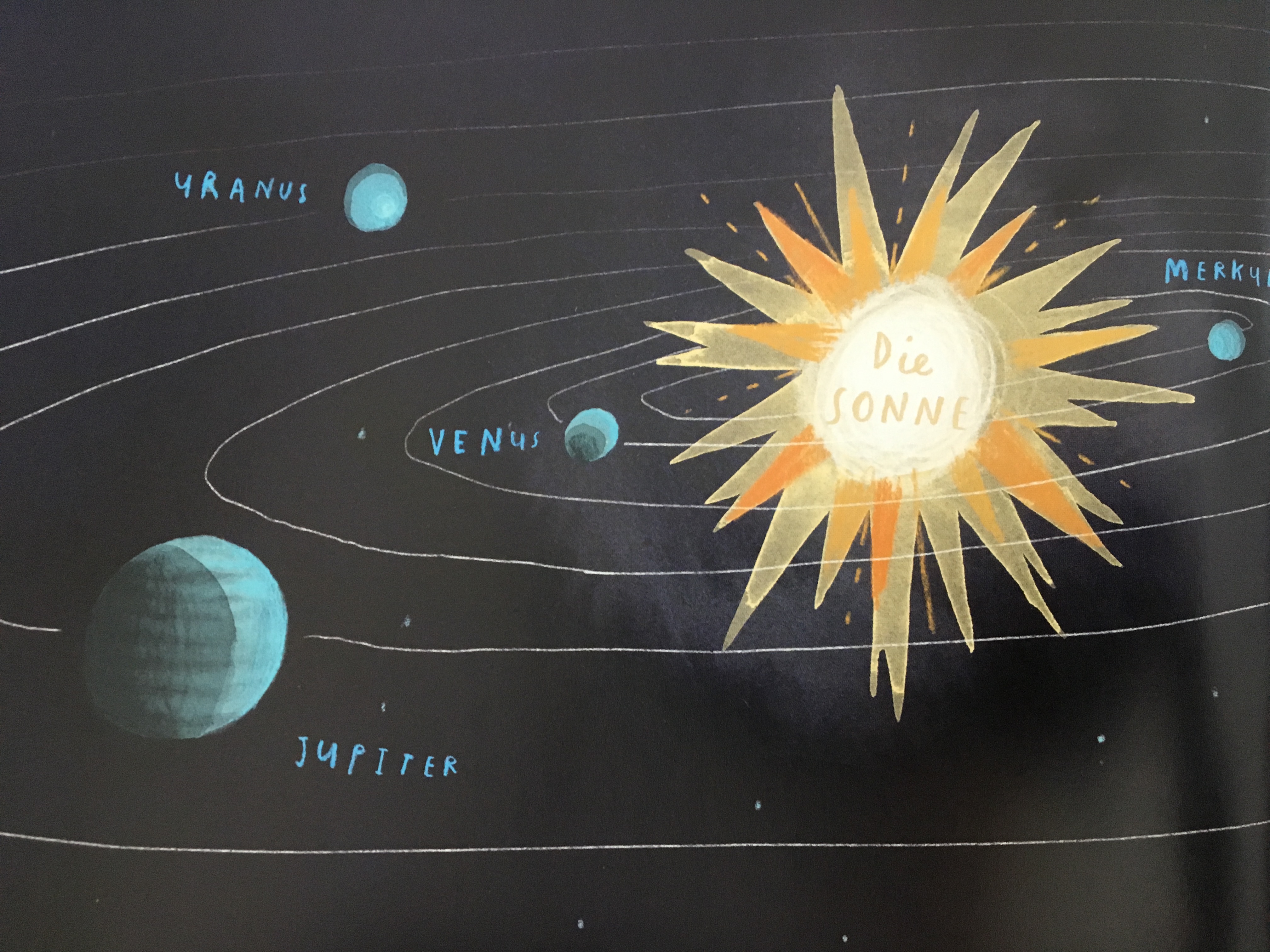 Oliver Jeffers geht nicht ins Detail, das ist bei dem, was er zeigen will auch gar nicht notwenig. Die Reduzierung und auch den Mut auf einer großen Seite einfach nur eine kleine Kugel – unsere Welt – zu zeigen, macht deutlich, wie wichtig es ist, auf unsere kleine Welt aufzupassen.