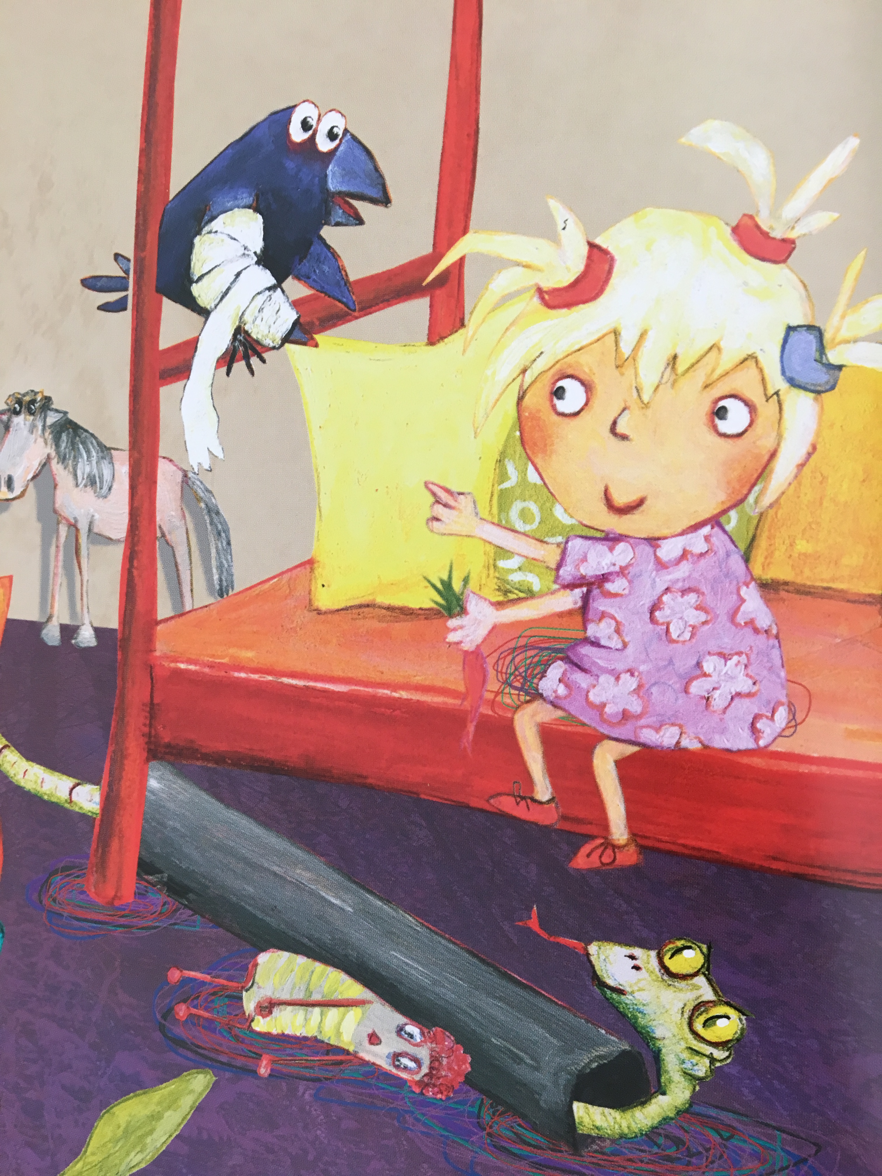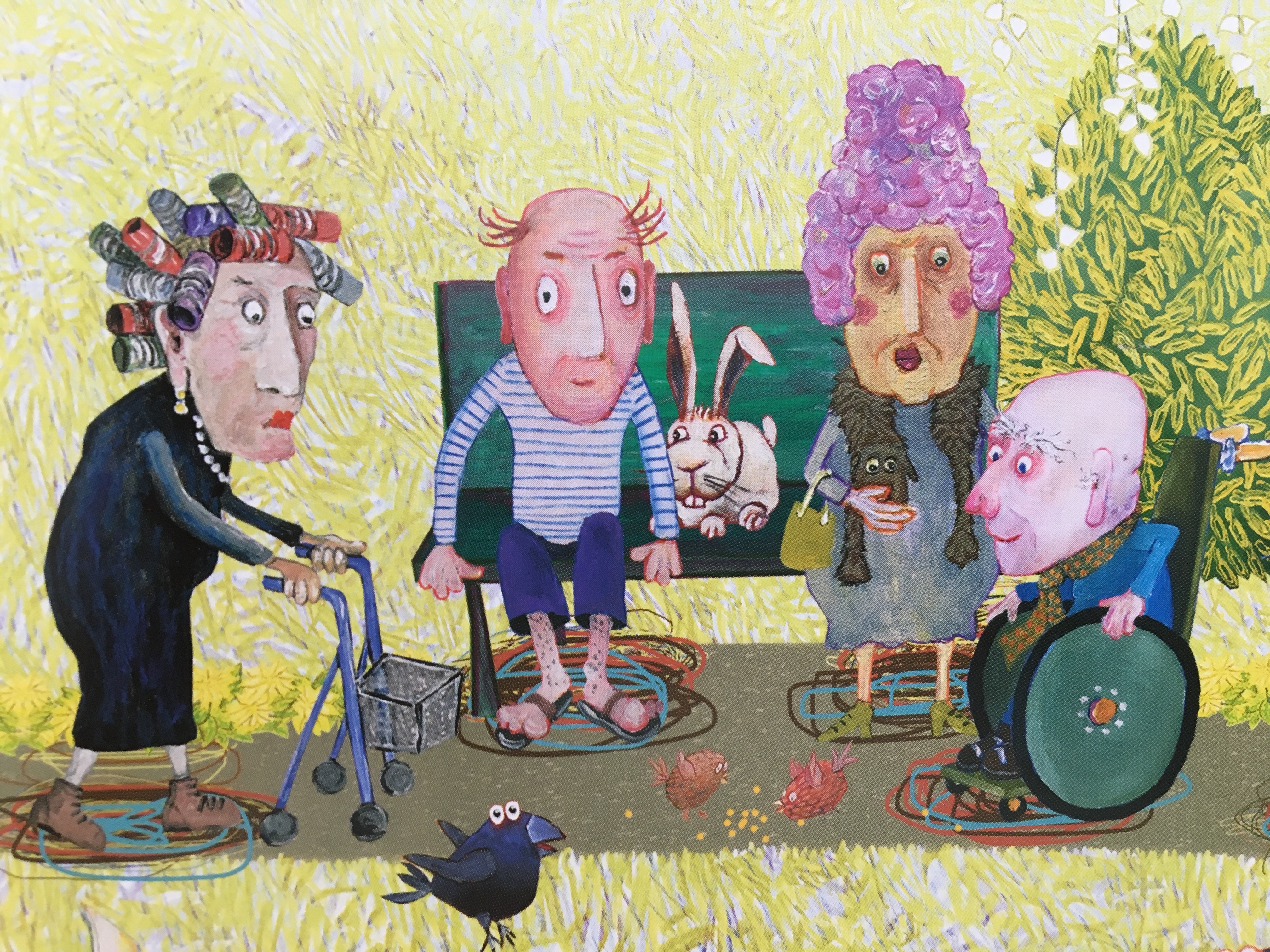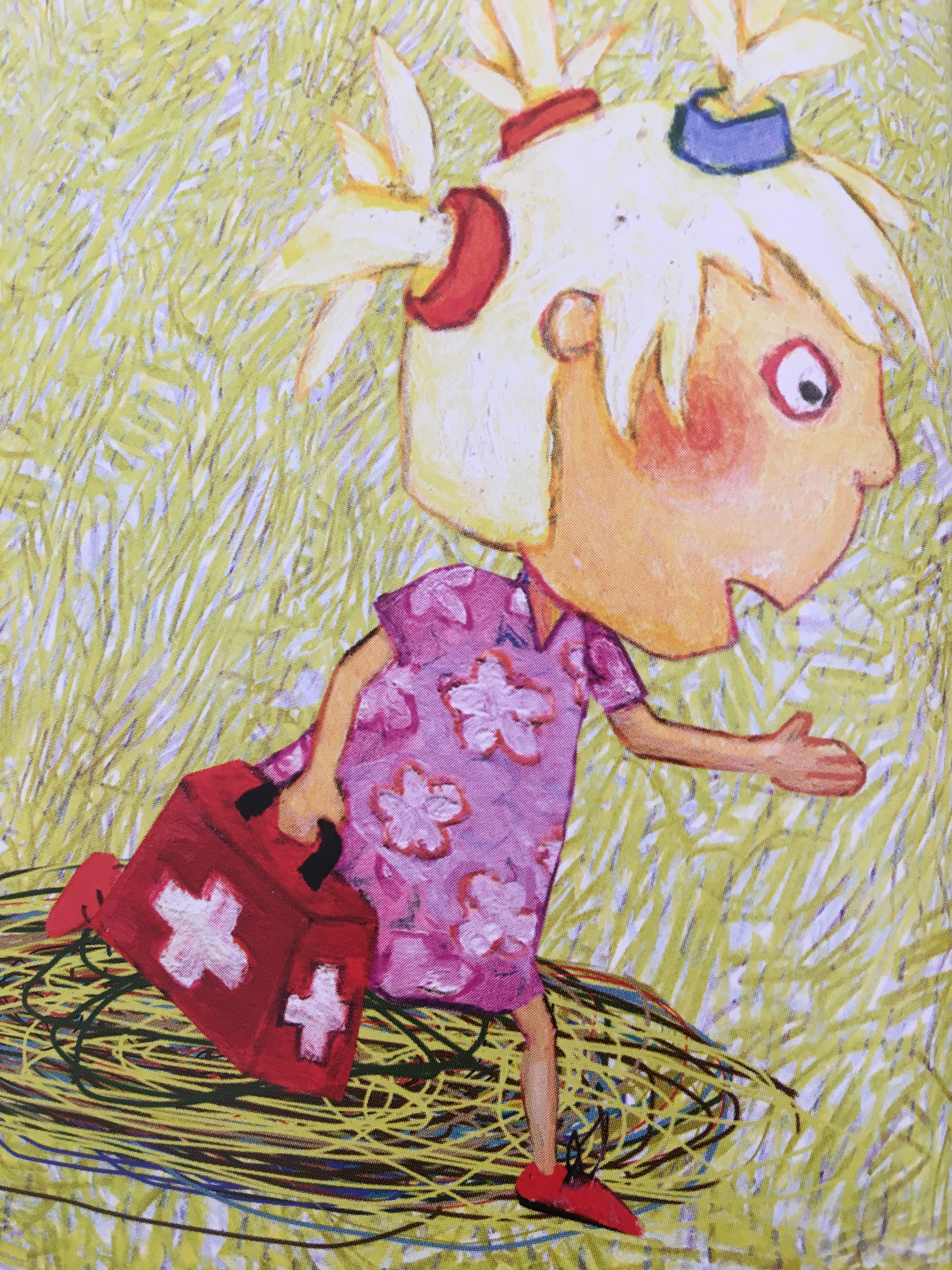 Frieda hat einen Erste-Hilfe-Koffer und ein großes Herz, klar, dass sie allen in Not geratenen Tieren helfen muss: Der Maus in der Mausefalle, dem Vogel mit dem gebrochenen Arm, dem Meerschweinchen ohne Zähne, der verletzten Schlange. Sie bringt alle Tiere mit nach Hause, was – nun ja – nicht gerade zu Begeisterung ihrer Eltern führt. Als sie auch noch ein Kälbchen mitbringt, ist deren Geduld zu Ende. Aber Frieda hat eine tolle Idee: Die einsamen Rentner auf den Parkbänken könnten sich ich um die Tiere kümmern. Und damit alle sind zufrieden.