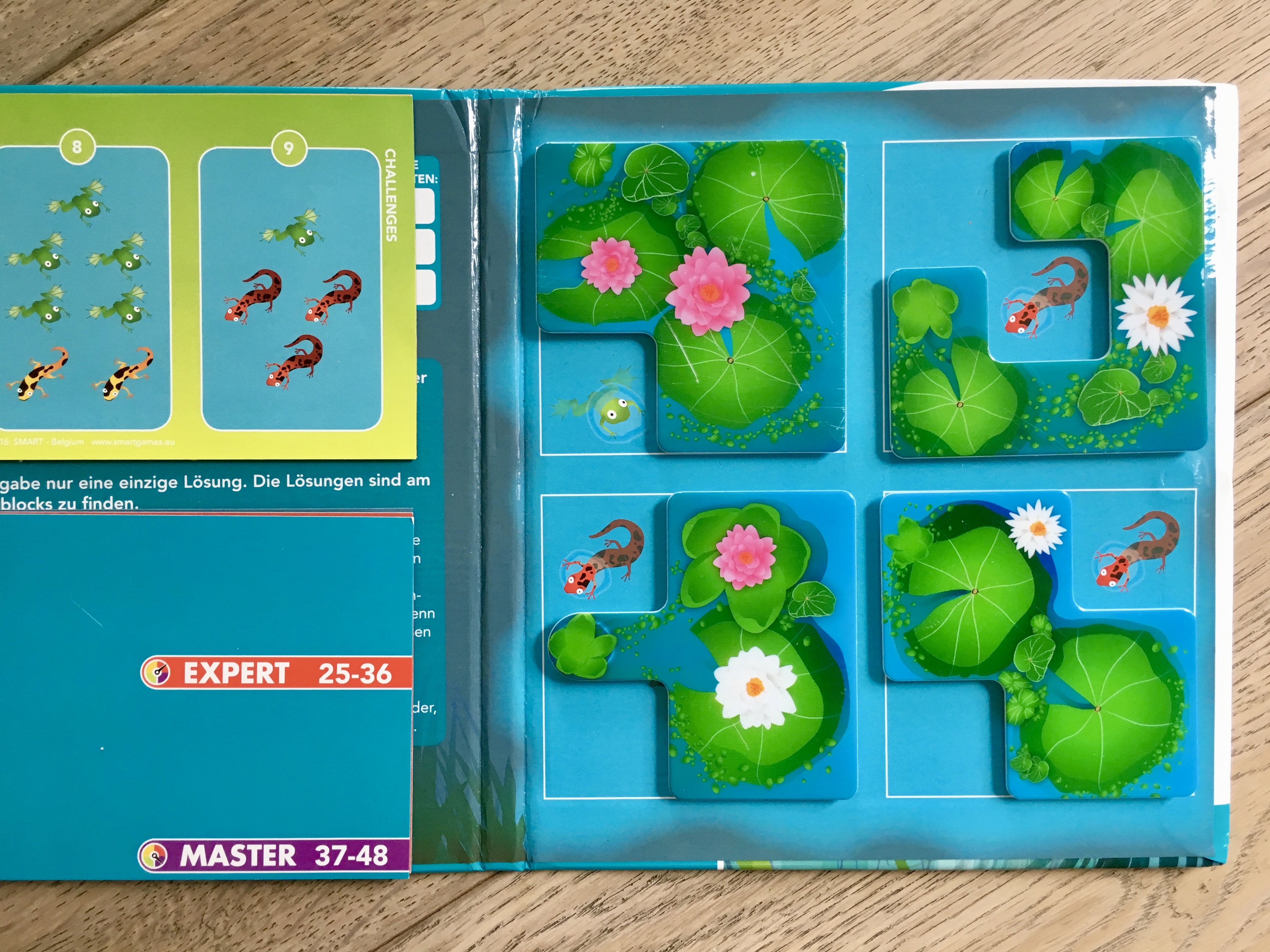 Diese tollen Knobel-Spiele eignen sich durch die kompakte Größe, die magnetischen Spielfiguren und den Druckknopf zum Verschließen wunderbar für unterwegs. Bei der ‚Unterwasserwelt‘ wird auf den vorderen Seiten gezeigt, welche Tiere offen zu sehen sein sollen (zum Beispiel ein Frosch und drei Salamander). Alle anderen Tiere oder Gegenstände müssen durch den Einsatz der Puzzleteile verdeckt werden. Nur wie müssen diese positioniert werden? Genau das ist die große Frage…