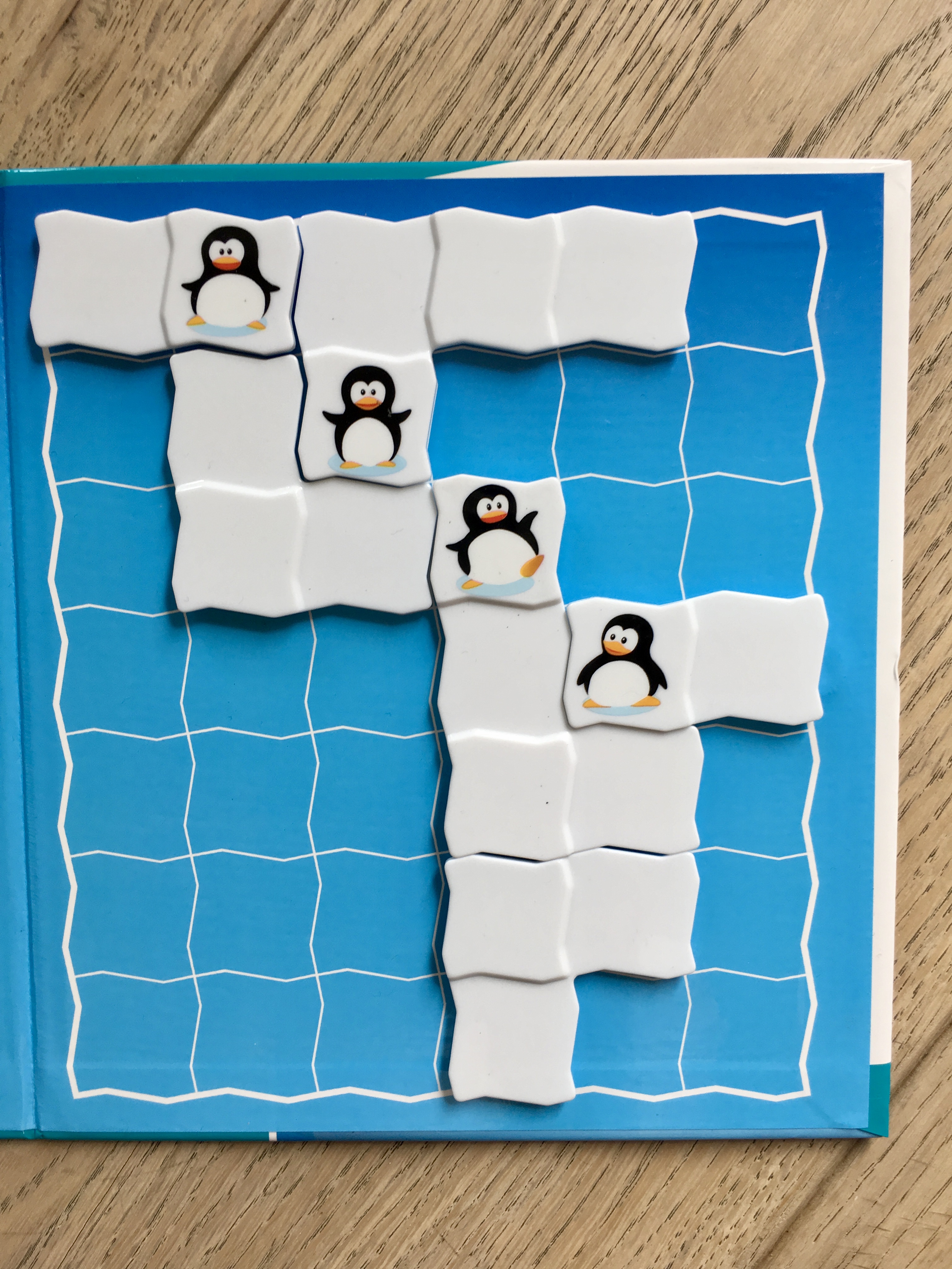 Bei der ‚Pinguin-Parade‘ werden die Puzzleteile mit und ohne Pinguin nach den jeweiligen Aufgaben zusammengelegt, so dass das gewünschte Muster entsteht.