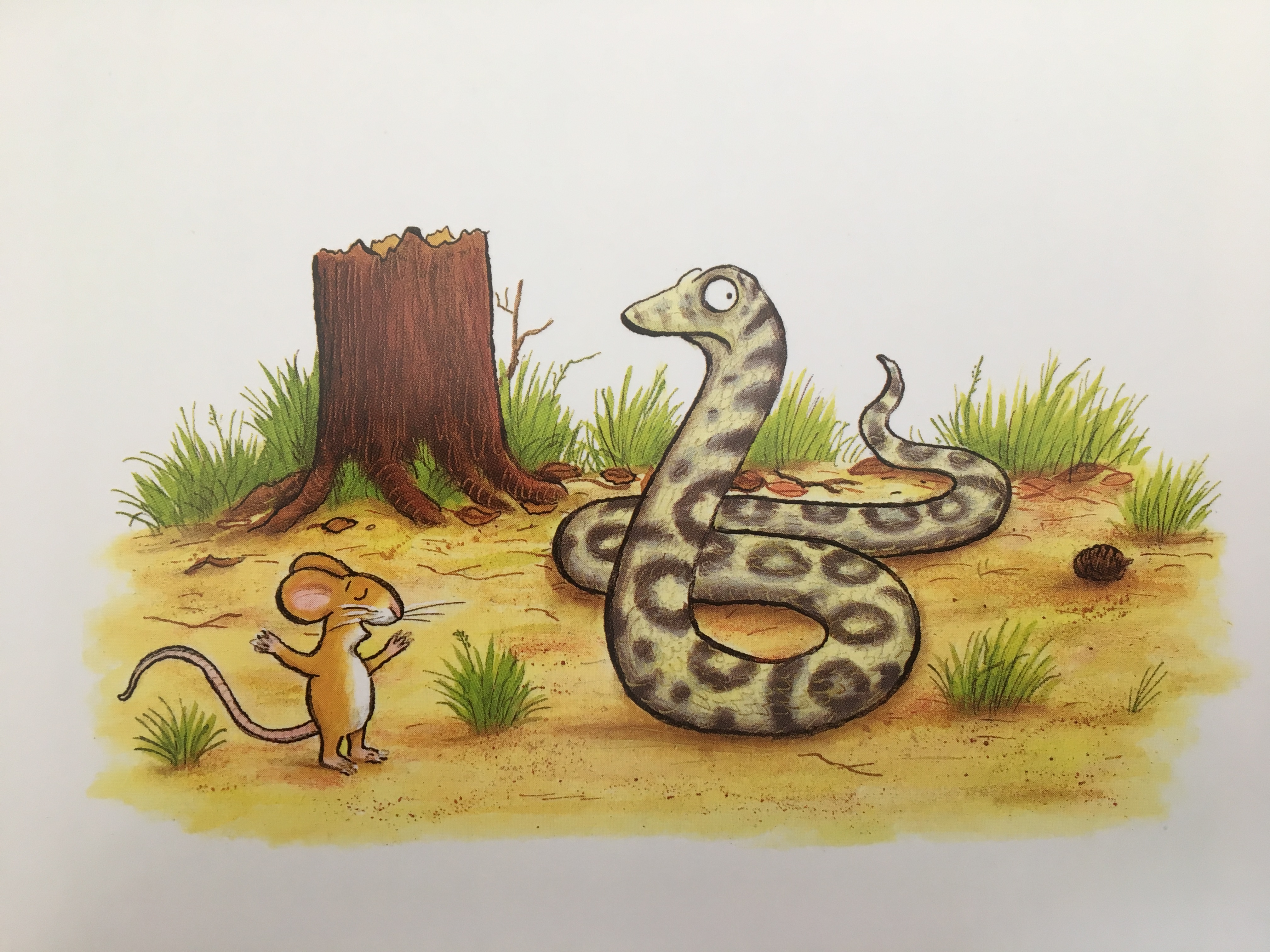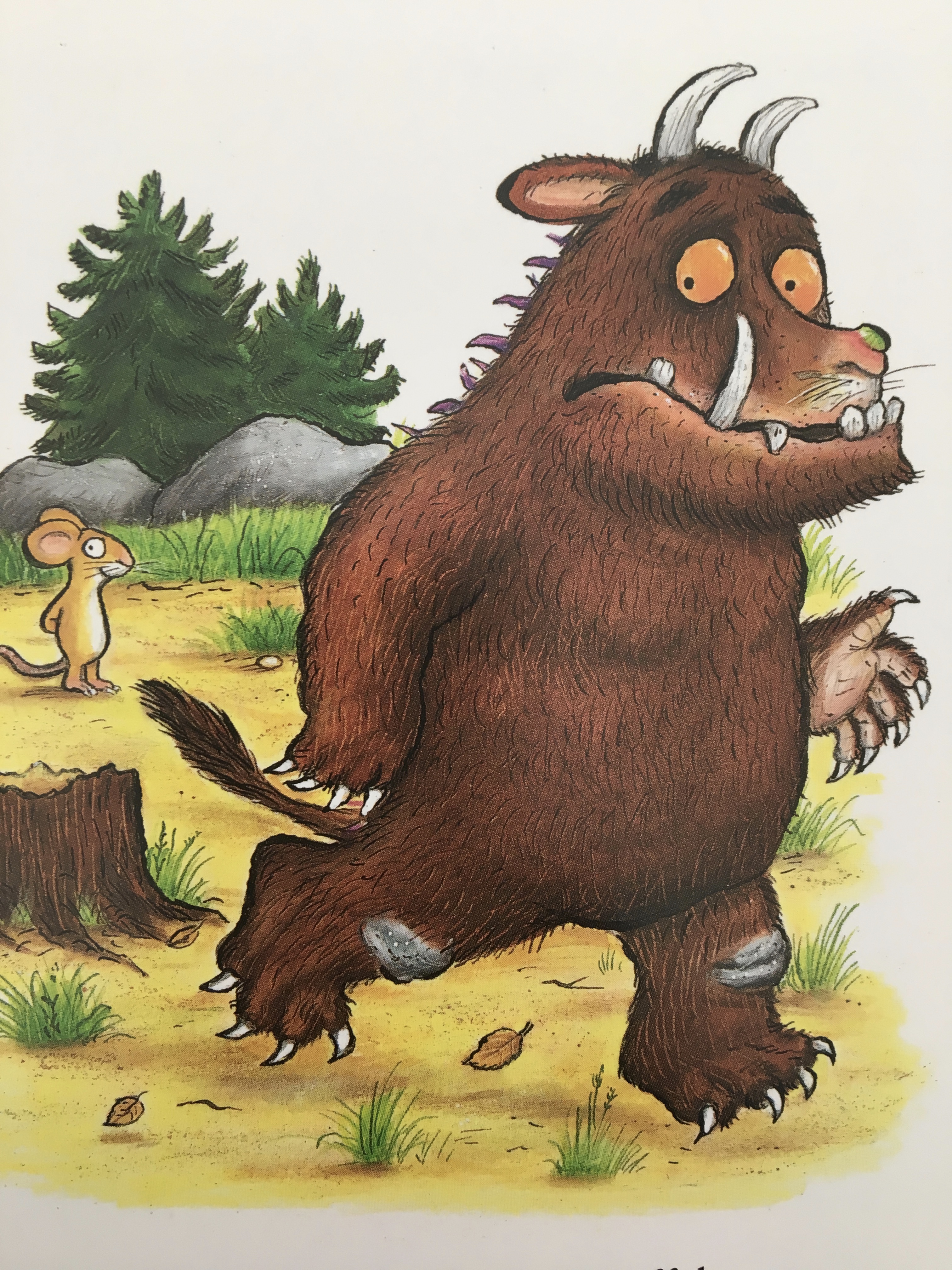 Der Kinderbuch-Klassiker ‚Der Grüffelo‘ von Axel Scheffler erzählt die Geschichte einer cleveren, kleinen Maus, die es schafft, den anderen für sie gefährlichen Tieren des Waldes mit den Geschichten über den schrecklichen Grüffelo, Angst einzujagen. So flüchten der Fuchs, die Eule und die Schlange lieber, als die kleine Maus zu fressen. Doch dann taucht der Grüffelo wirklich auf. Aber auch hier zeigt die Maus, wie gewitzt sie es versteht, die Dinge so zu drehen, dass schlussendlich auch der schrecklich große Grüffelo kein Interesse mehr an einem ‚Butterbrot mit kleiner Maus‘ hat, sondern lieber das Weite sucht.