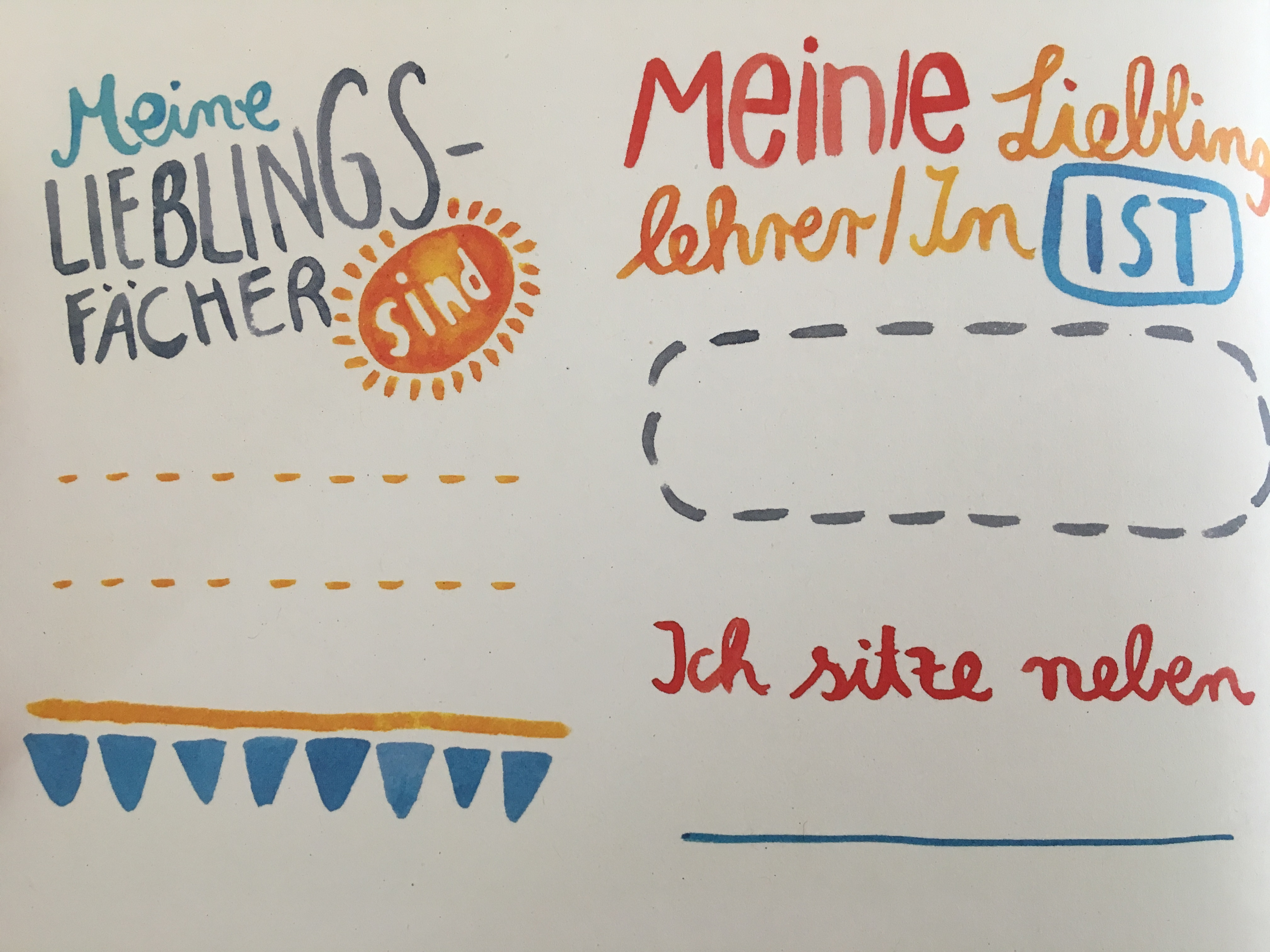 Die schöne Grafik macht das Buch schon ohne den selbst gemachten Inhalt zu etwas Besonderem. Platz finden in dem Buch neben dem ersten Schultag, ein paar allgemeine Dinge wie Stundenplan, Lieblingsfächer, der erste Klassenausflug und am Ende ein paar Fragen zum ersten Jahr in der Schule: Das sind meine Freunde geworden, das hat mir besonders gut gefallen oder so waren meine ersten Schulferien.