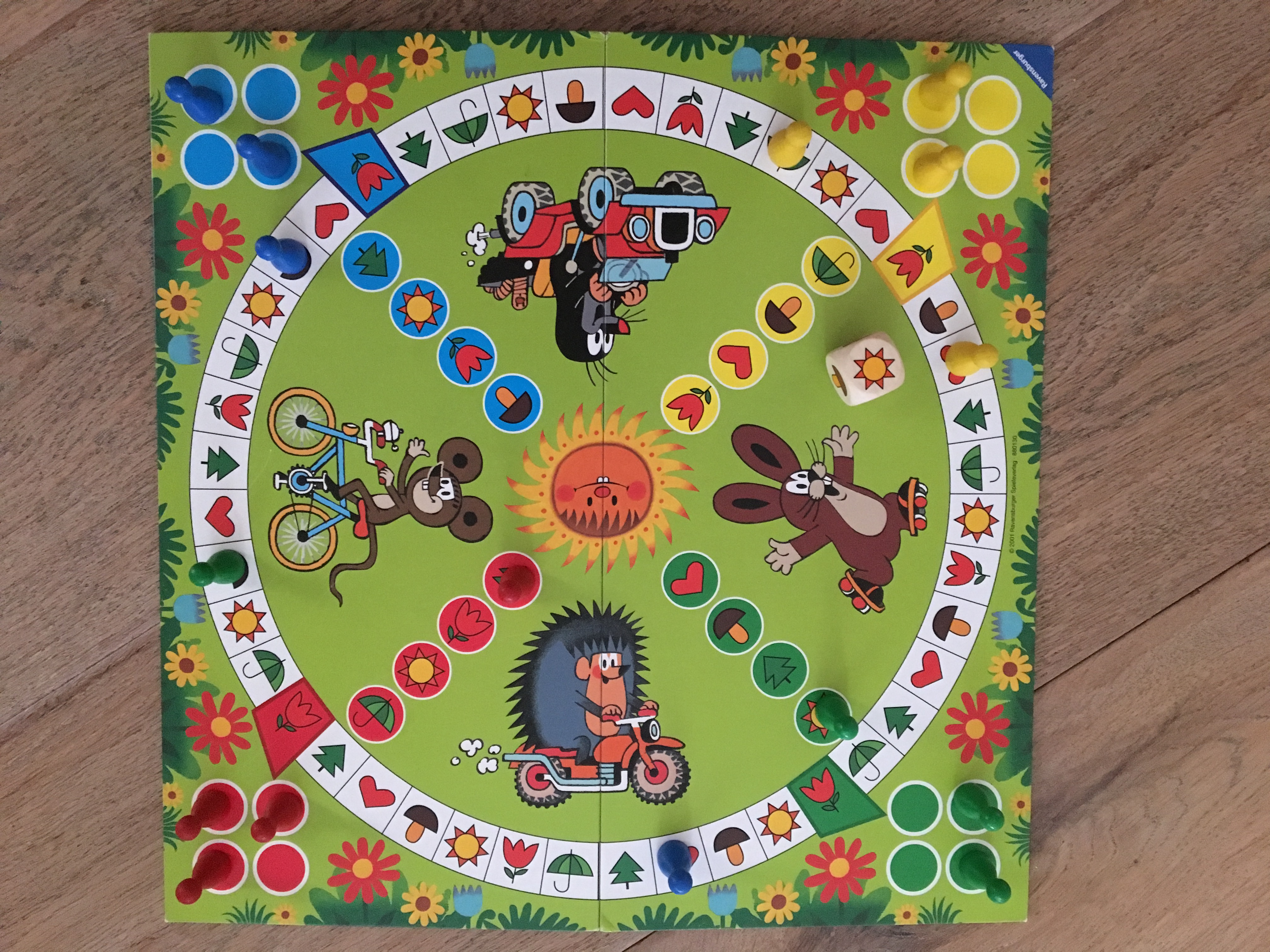 Der Spiele-Klassiker schlechthin ist ‚Mensch-Ärgere-Dich-Nicht‘. Dieses Lieblingsspiel vom kleinen Maulwurf ist die Kinder-Version davon. Statt Farben und Zahlen gibt es auf dem Würfel und dem Spielbrett Symbole wie Blume, Baum oder Sonne. Das Prinzip aber bleicht gleich. Jeder hat vier Spielfiguren und muss sie so schnell wie möglich in sein Haus bringen. Je nach Alter der Kinder können die Regeln, dann etwas entschärft werden, in dem man zum Beispiel ohne ‚Rauswerfen‘ spielt.