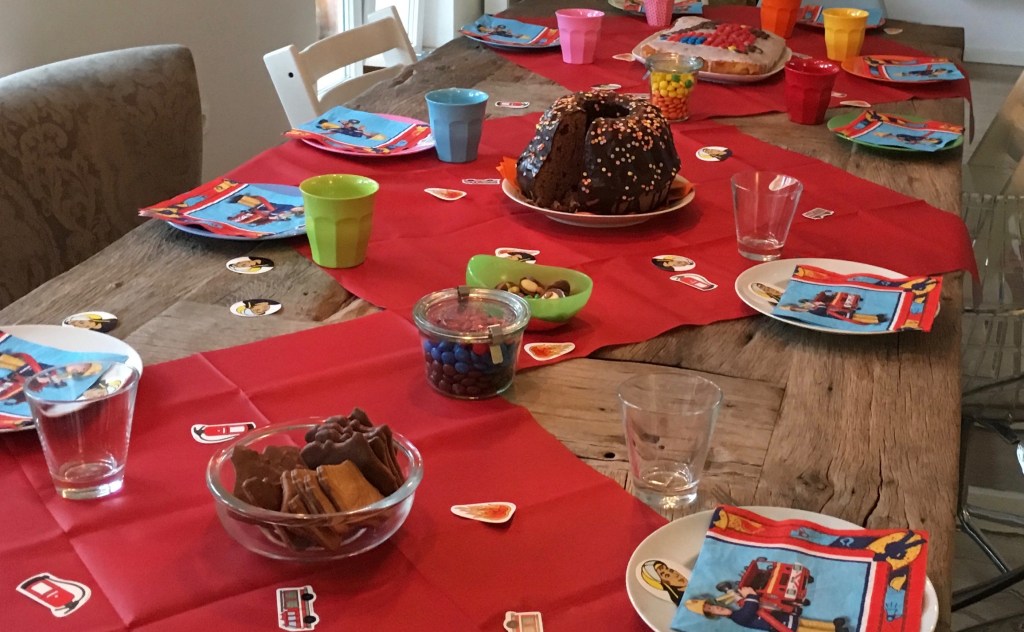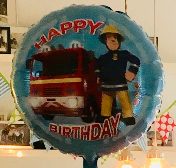 Für den Tisch haben wir Feuerwehr-Konfetti gekauft und dies mit Feuerwehrmann Sam-Servietten ergänzt. Dazu baumelten am Fenster Deko-Spiralen ebenfalls mit Feuerwehrmann Sam Motiven. Den Stuhl des Geburtstagskindes schmückte außerdem ein entsprechender Luftballon.