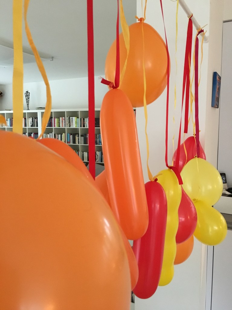 Immer wieder ein Highlight ist die Luftballon-Wand (hier natürlich in den Feuer-Farben rot/orange/gelb), die wir an einer Duschstange befestigt und zwischen zwei Wände an einem Durchgang geklemmt haben.