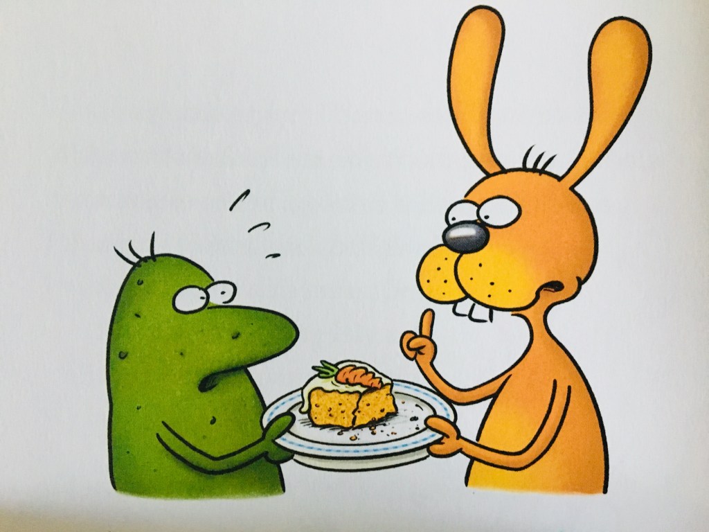 Die neue Geschichte ‚Geteilte Möhre ist doppelte Möhre‘ berichtet von dem letzten Stück Rüblitorte mit Marzipanmöhre und wie schwierig es sein kann so ein Küchenstück gerecht zu teilen. Am Schluß schaffen es die beiden Freunde dann doch und genau da, kommt Oma Bär mit einem weiteren Stück Kuchen…