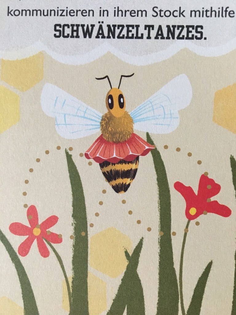 Wichtig ist in dem Buch aber auch, welchen Beitrag die Bienen in unser Ökosystem leisten, warum sie gefährdet sind und was wir tun können, um ihnen zu helfen zum Beispiel im eigenen Garten. Das Buch ist wunderbar illustriert, so wechseln sich schöne Info-Grafiken ab (zum Beispiel: 1 Teelöffel Honig = Das Lebenswerk von 12 Bienen) mit Motiven zum Schwänzeltanz der Honigbiene oder einen schönen Blumenwiese. Kurz, eine tolle Zusammenfassung über das Wichtigste rund um das Thema Bienen, wenn man eben kein Bio-Buch lesen will.