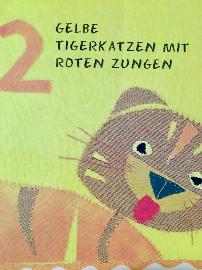Ein Buch zum Zählen und Farben lernen für ganz Kleine hat Johanna Ignjatovic gestaltet. Bei wird immer eine Zahl mit einem Tier und zwei Farben kombiniert (1 grünes Krokodil mit gelben Augen), von der eine auf der nächsten Seite wieder aufgegriffen wird (2 gelbe Tigerkatzen mit roten Zungen) etc. Auf der fünften und letzten Seite werden alle Farben noch einmal kombiniert (blau, gelb, rot, grün).