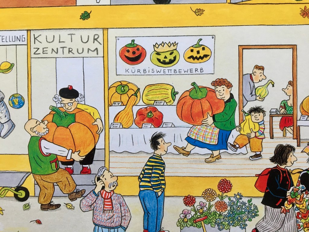 Im Herbst gibt es Friedrich und Andrea, die man dabei begleiten kann, wie sie einen riesigen Kürbis zur Kürbis-Wettbewerb bringen. Oder natürlich die vielen Kinder mit Laternen, die sich zu einem großen Umzug formieren und zum Schluß am See gemeinsam singen. Beliebt sind bei uns auch die Suchspiele: Wo ist das Eichhörnchen oder welche Frau trägt eine rote Hose mit Punkten.