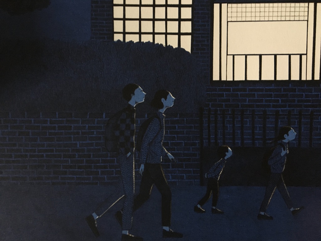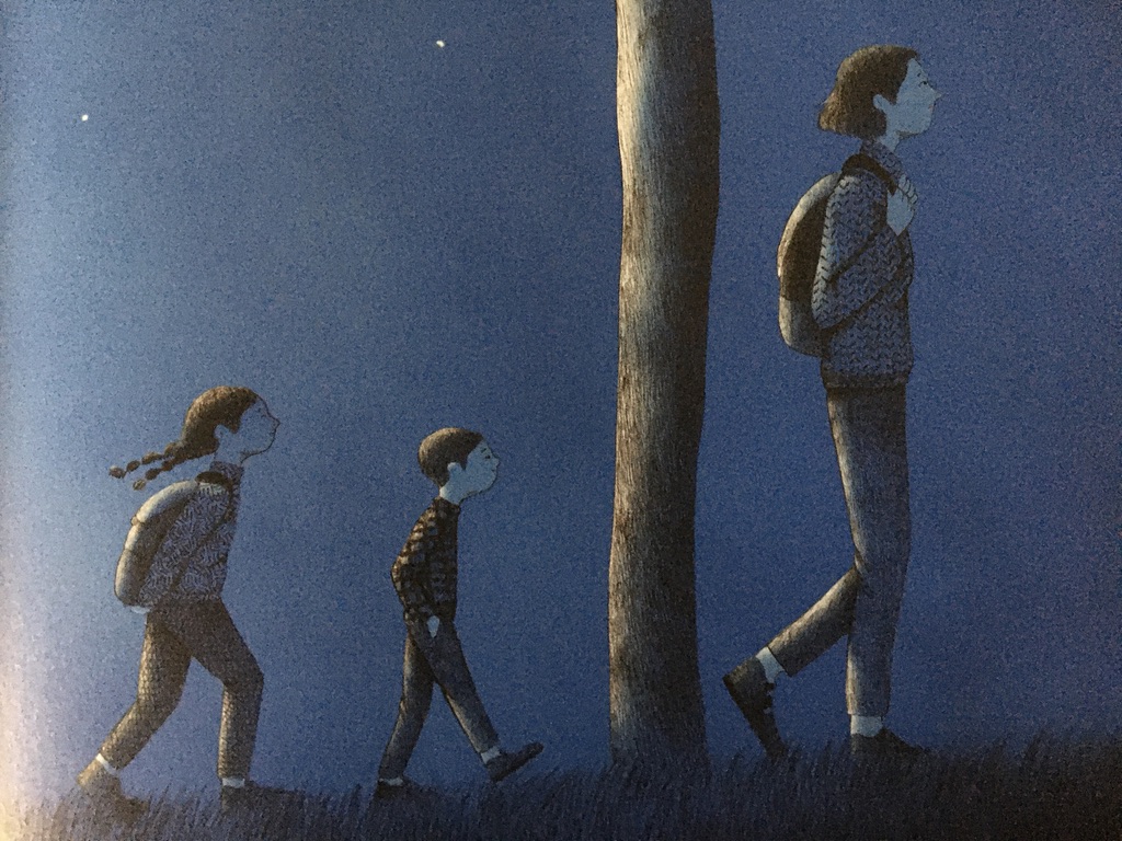 Ein Buch, das fast keine Worte braucht: Eine Familie steht mitten in der Nacht auf. ‚Wir sind verabredet…‘ flüstert Mama. Eine Nachtwanderung beginnt. Leise wandern sie durch die Strassen, betrachten die schlafenden Häuser und einige leuchtende Fenster. Außerhalb der Stadt wird es immer stiller und dunkler. Die Gerüche werden intensiver, es sind der Mond und ein wunderbarer Sternenhimmel zu sehen. Noch ein letzter Anstieg und dann kommt sie: Die Verabredung. Der neue Tag. Die Sonne geht auf.