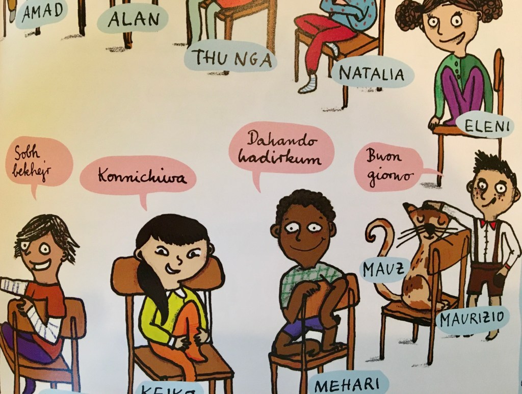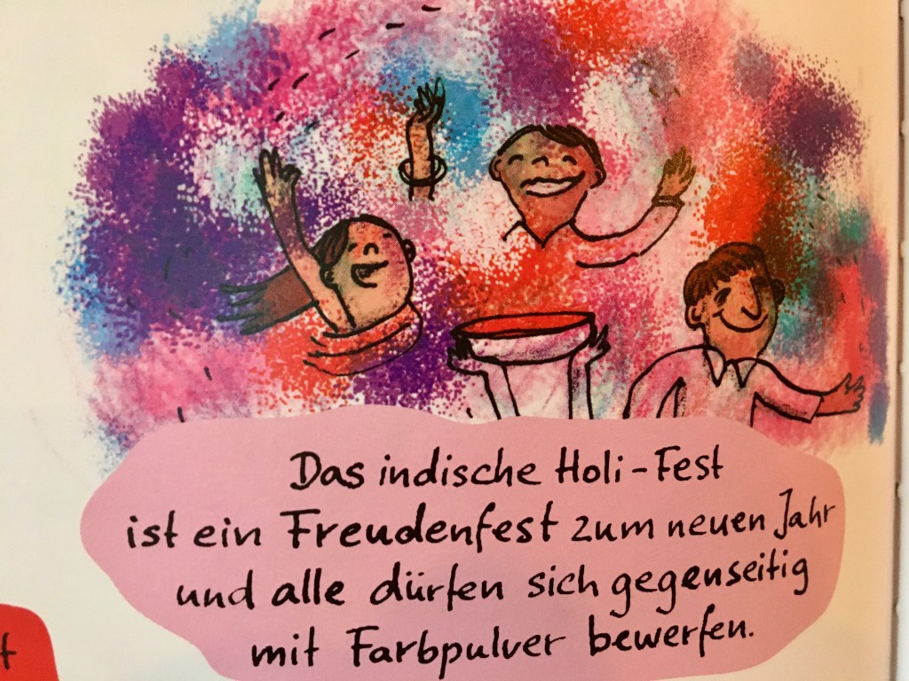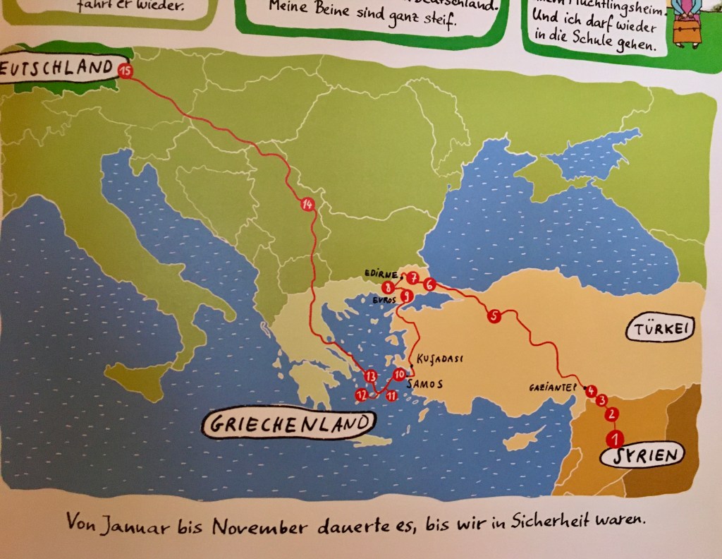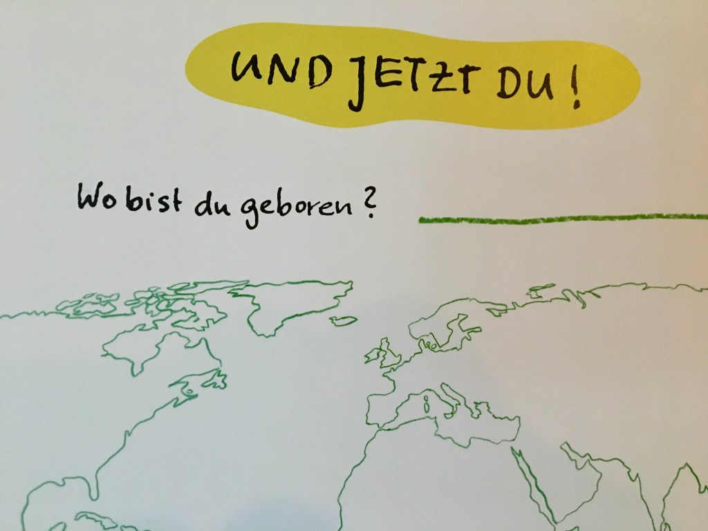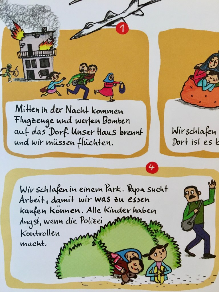 Das Buch beginnt mit unseren Gemeinsamkeiten, dem was wir alle tun: tanzen und singen, Geschichten erzählen, lachen oder schlafen. Die nächsten Seiten widmen sich dem schwierigsten Thema: Warum Menschen woanders hingehen, dabei werden auch Krieg, Vertreibungen oder Armut thematisiert. Die Stationen einer Flucht von Syrien nach Deutschland werden anhand einer Karte veranschaulicht und gezeigt, wie verstreut eine palästinensische Familie lebt. Über die Sprache als Mittel der Verständigung kommen sich die Menschen näher – manchmal auch ohne Worte. Und was sind eigentlich Vorteile? Auch über die Deutschen? Schlussendlich aber spielen alle Kinder überall und egal woher sie kommen. Und das schönste sind die gemeinsamen Feste.