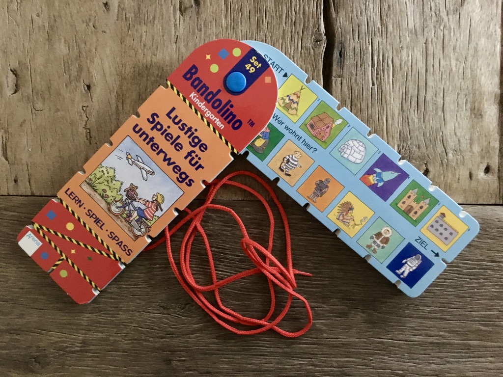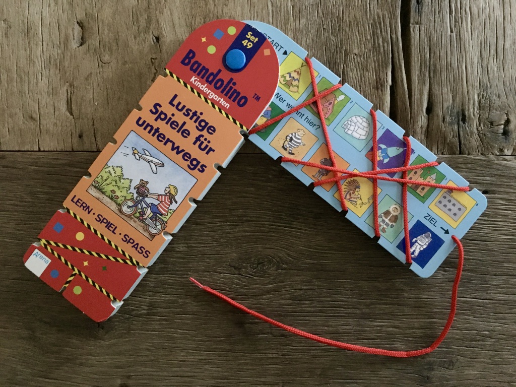 Eine einfache und gerade für Unterwegs großartige Idee: Die Spiele von Bandolino. Auf jeder Seite befinden sich zwei Reihen Bilder, von denen jeweils zwei zusammen gehören. Mit Hilfe der am Rand eingestanzten Löcher werden diese beiden jeweils nacheinander mit dem beiliegenden Band verbunden bis alle Bilder verknüpft sind. Dann kann die Seite umgedreht werden. An dem aufgezeichneten Muster auf der Rückseite lässt sich einfach erkennen, ob die Aufgabe richtig gelöst ist. Also: Ganz einfach, mit Lerneffekt, zum alleine spielen, nichts kann herunterfallen – eine perfekte Beschäftigung für Reise und unterwegs. Die Bandolino Spiele gibt es für verschiedenen Altersstufen z.B. Kindergarten oder Grundschule und mit vielen verschiedenen Aufgaben und Themen.