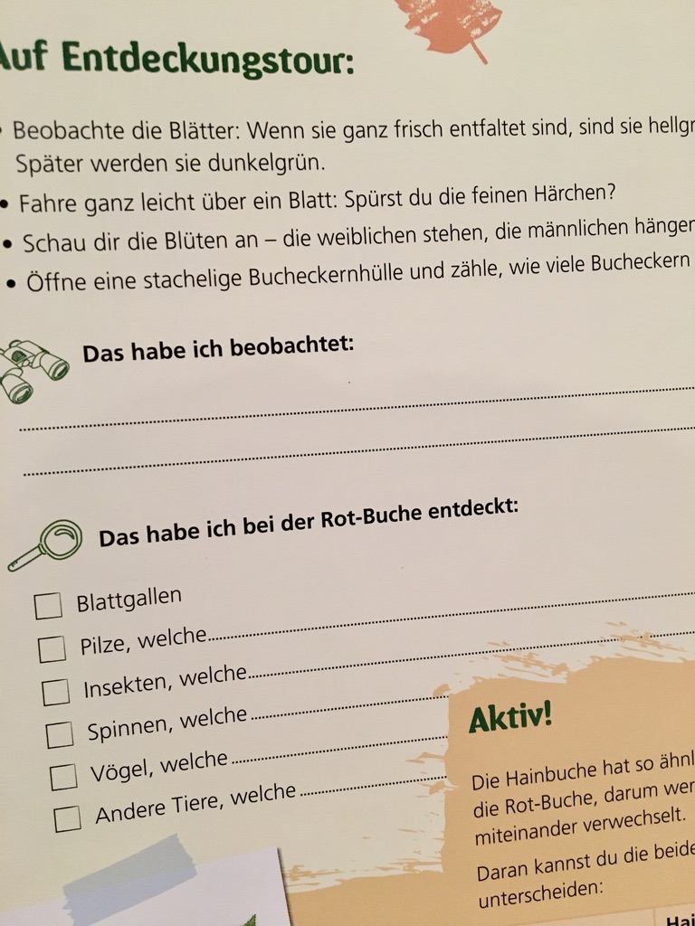 Zu den verschiedenen Tiere und Pflanzen gibt es einen Steckbrief sowie weitere Informationen. Hinzu kommen Aufgaben, Fragen und kleine Experimente, die die Kinder selber lösen und beantworten können. Alles wird in das Forscher-Buch eingetragen. Das wird selbstverständlich auf der ersten Seite mit einem Forscher-Fragebogen personalisiert, damit klar ist, wer die tollen Entdeckungen im Buch gemacht hat.