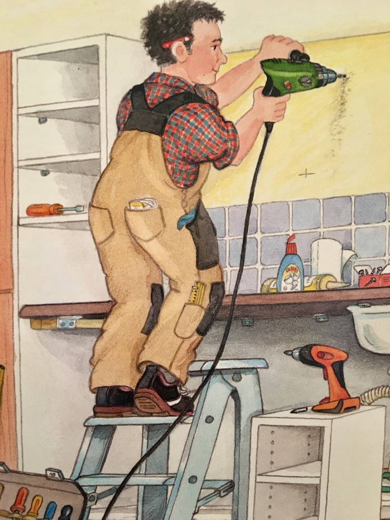 In diesem Buch können die Kinder mithelfen: Beim Bohren, beim Streichen, beim Hämmern, mit der Zange oder mit der Säge. Erzählt werden klassische Heimwerker-Situationen wie ein Umzug mit Küchenmontage, das Streichen des Kinderzimmers, der Ausbau des Dachbodens, eine Reparatur im Badezimmer oder der Bau eines neuen Möbelstückes. Das dafür typische Werkzeug können die Kinder dann ‚benutzen‘, indem sie beispielsweise etwas hin-und-her schieben oder heraus ziehen.