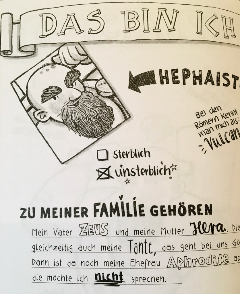 Gut, dass es jetzt Zeus zu bunt wurde und er Hermes beauftragt hat, die echten Geschichten über die Helden der griechischen Sagen zusammenzustellen. Von A wie Archill oder Aphrodite über D wie Demeter, E wie Europa bis Z wie Zeus, werden die Götter in einem Kapitel vorgestellt. Erst ein Bild mit allen besonderen Merkmalen, dann folgt ein übersichtlicher Steckbrief (Familie, Heimat, Stäben und Schwächen) und schließlich erzählen sie ihre Geschichte und wir erfahren so endlich, was wirklich hinter den ganzen Sagen und Geschichten steckt.