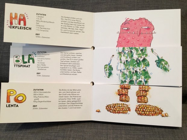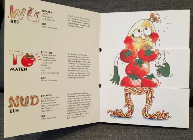 Den Kopf bilden zum Beispiel Wurst, Pute, Hackfleisch, Garnelen oder Tofu. Der Köper sind Tomaten, Kürbis, Lauch oder Rote Beete. Und Nudeln, Risotto, Polenta oder Püree sind die Beine. Für jede dieser drei Komponenten gibt ein eigenes kleines und unkompliziertes Rezept. Alle drei Zutaten können wild miteinander kombiniert werden und ergeben so 1331 Rezeptkombinationen. Das sollte doch für ein paar Tage reichen. Und bei so einem spielerischen Umgang mit den Kochideen, machen sicher auch die Kinder bei der Planung mit.