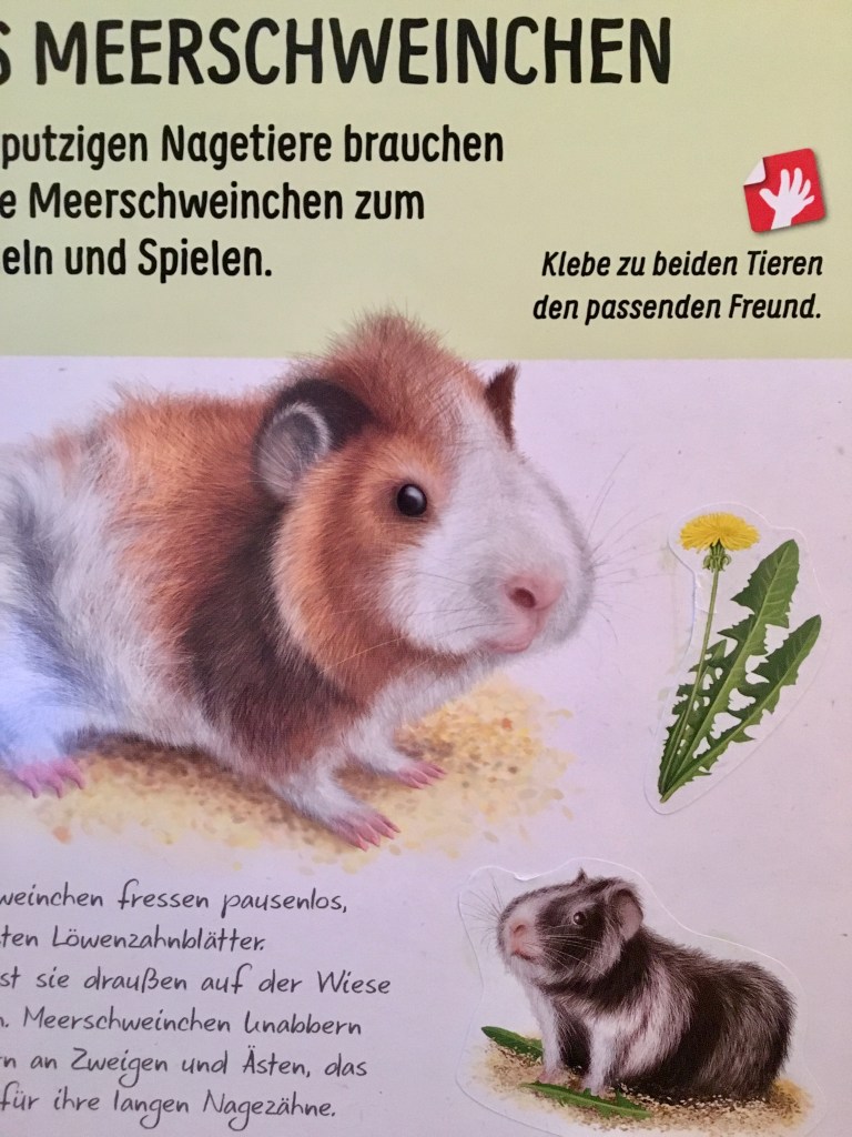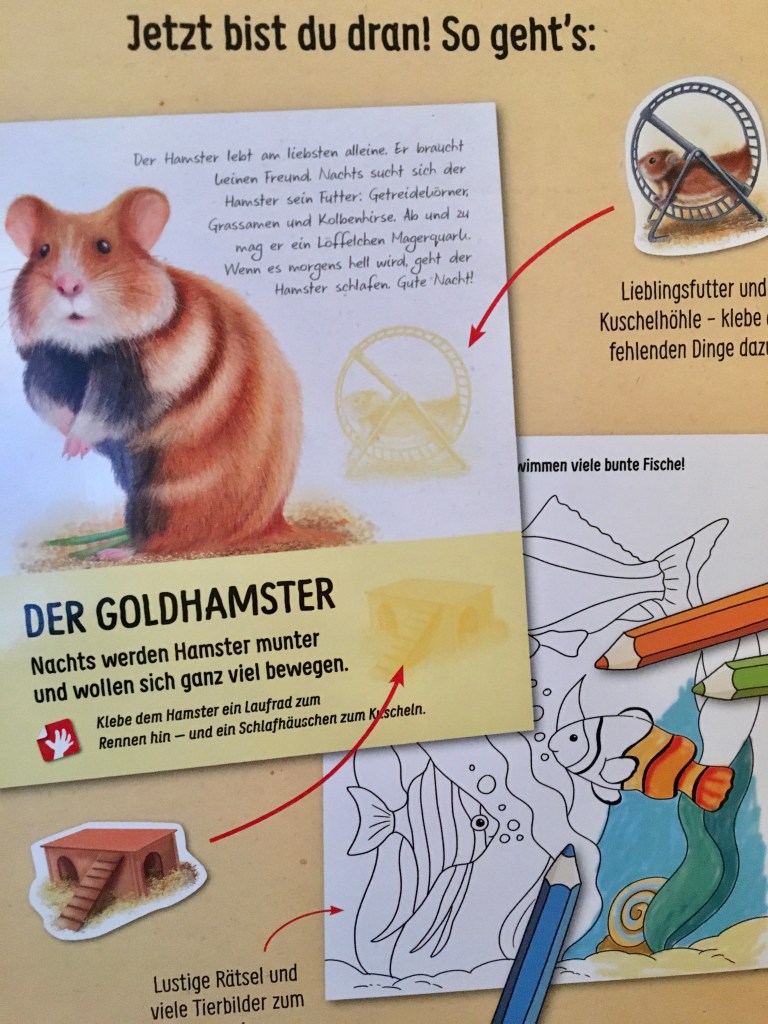 Dieses Buch kann man aber nicht nur (Vor-) Lesen, sondern die Kinder auch mitmachen lassen: Mit Aufklebern müssen Fragen beantwortet werden: Zum Beispiel muss das passende Futter den richtigen Tieren zugeordnet werden. Im hinteren Teil des Buches kann gemalt und gerätselt werden. Ein kurzweiliges Bilder-Sach- und Beschäftigungsbuch.