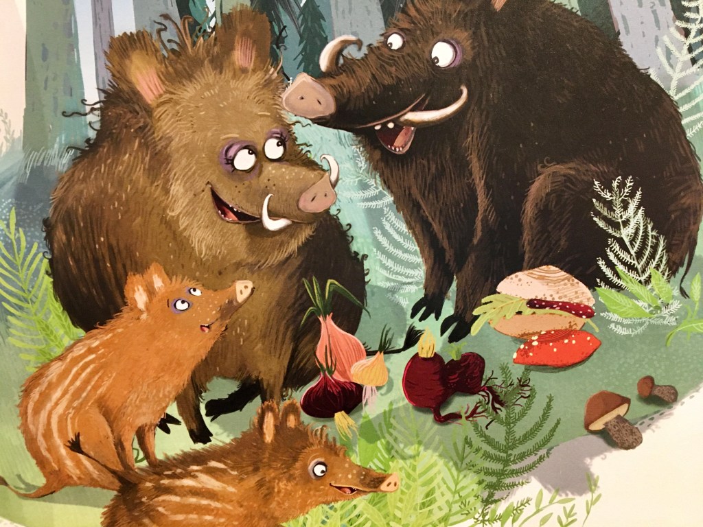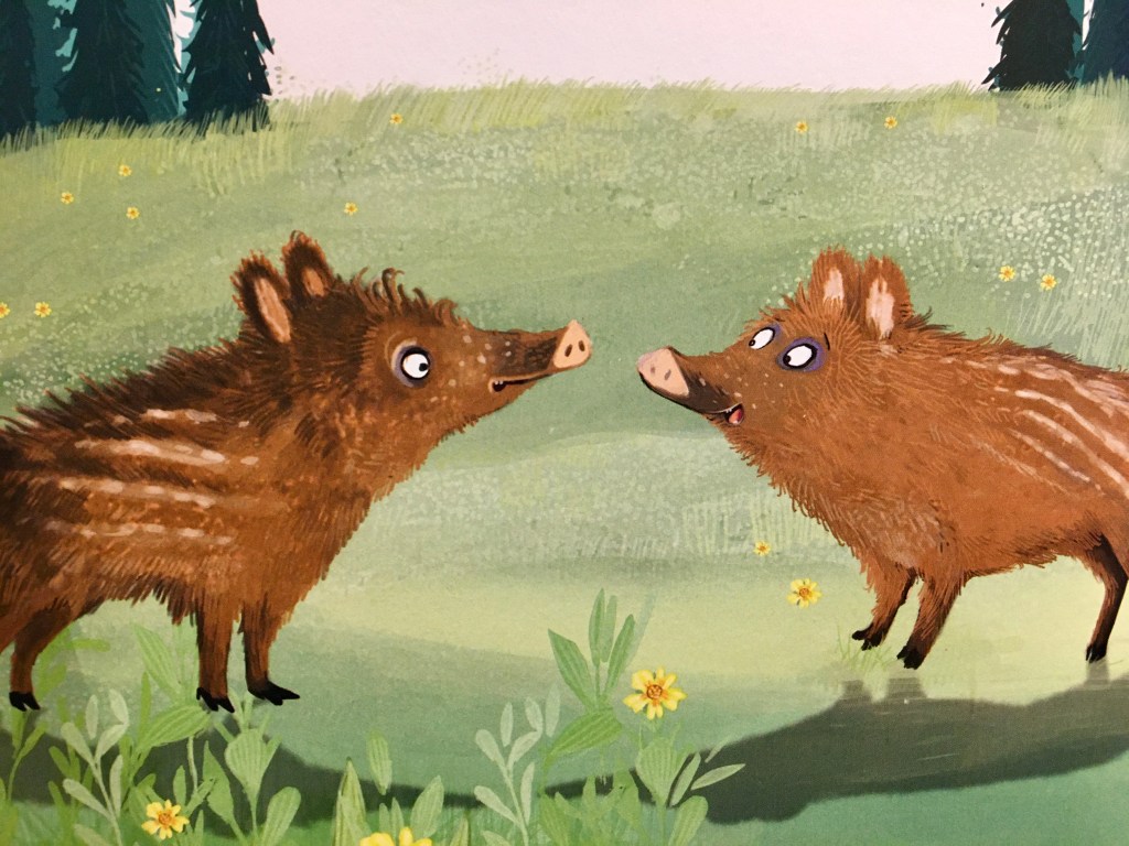 Die Wildschwein-Kinder Mops und Fiedel sind genervt. Mama will wieder, dass sie selber nach Futter wühlen. „Vielleicht“ überlegen sie, „sollten wir doch lieber bei unserem Papa wohnen. Bestimmt ist der viel cooler.“ Und so beginnen nach ihm zu suchen.