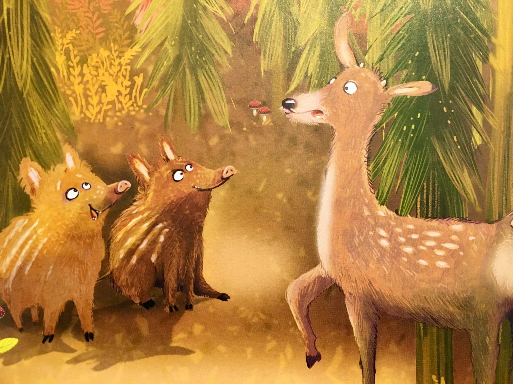 Doch woran erkennt man seinen Vater? Mops und Fidel überlegen, dass er ihnen wohl ähnlich sein sollte. Also suchen sie zuerst nach einem Tier, das auch Streifen hat, wie sie. Das Streifenhörnchen, das sie treffen, scheint aber nicht das richtige Tier zu sein. Es gibt ihnen den Tipp, ein größeres und stärkeres Tier zu suchen. Sie treffen ein Reh, das passt aber auch nicht. Es ist schließlich eine Dame und kein Papa. Mops und Fidel überlegen weiter: ‚Wild‘ müsste ihr Vater sein, sie sind ja auch Wild-Schweine. Aber auch der Bär, dem sie begegnen, ist es nicht. Schließlich treffen sie doch ihren Wildschwein-Papa. Und ganz so ähnlich ist er ihnen dann doch nicht. Zumindest fehlen die Streifen. Auch ihre Mutter taucht auf, sie hatte bereits nach den kleinen Schweinchen gesucht. Gemeinsam machen sie ein Picknick und der Papa verspricht, in Zukunft für die beiden Kleinen da zu sein.