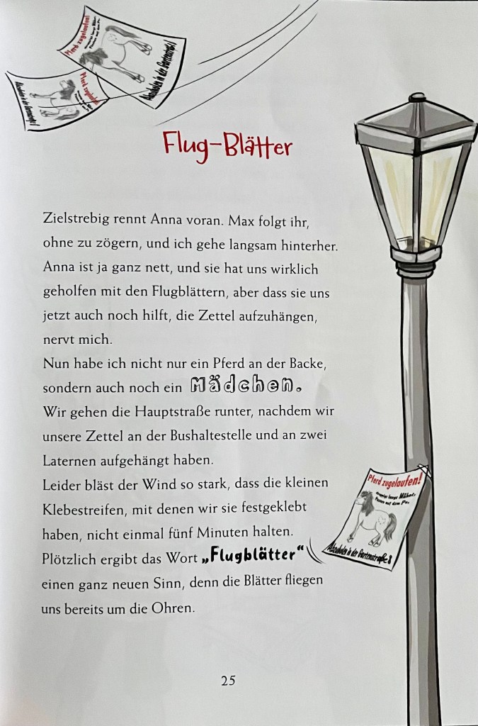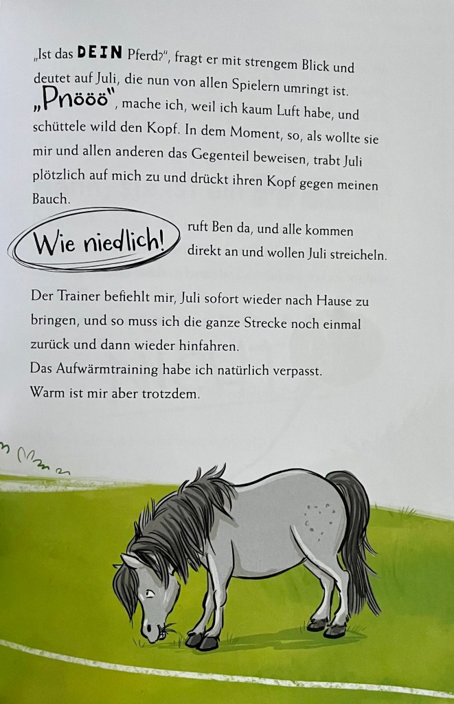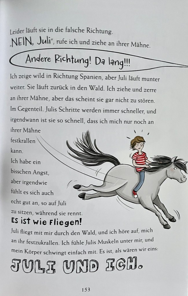 Natürlich passieren in diese Buch viele Dinge bis schließlich – Achtung: Spoiler – auch Paul, Juli in sein Herz geschlossen hat. Der vorhersehbare Schluß ändert aber nicht an dem großen Lesevergnügen. Denn das Buch hat mehrere Pluspunkte: Ein Pferdebuch mit einem Jungen als Hauptfigur ist eine willkommene Abwechslung. Dass der auch noch aus der Ich-Perspektive erzählt und das Geschehen mit seinen grummeligen, genervten und lustigen Kommentaren beschreibt, macht Spaß. Dazu kommt die durchgehende Illustration mit Comic-Elementen, die das Buch perfekt auch zum Vorlesen für kleinere Kinder machen, die gerne noch etwas zum Gucken haben. Für Erstleser ist es ebenfalls gut geeignet.