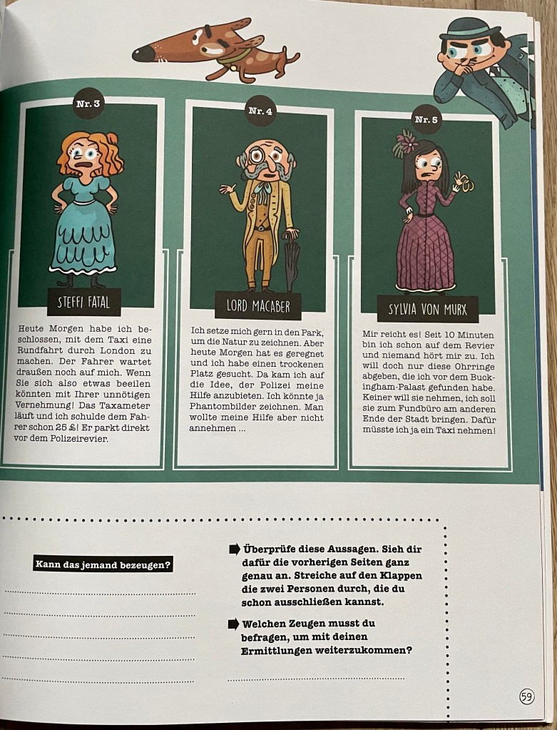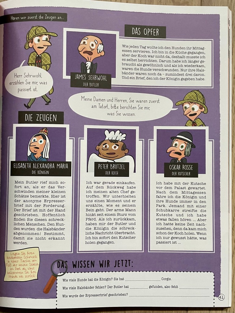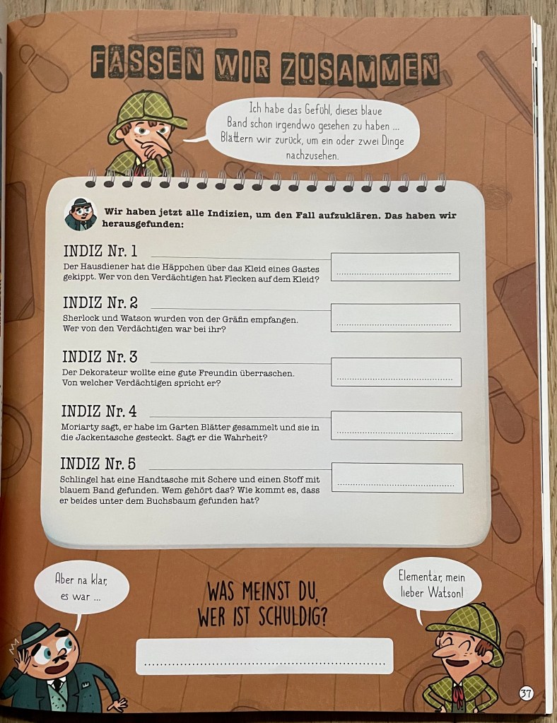 In Fall Nummer 1 wurden im Speisewagen des berühmten Orient-Express die Messer gestohlen, in einem anderen Fall wurden die Schlüssel der Gefängnistüren geklaut und fehlen auch noch die Vorhänge im Haus der Gräfin – alles natürlich Katastrophen, in denen die Ermittler dringend helfen müssen. Nun werden Verdächtige verhört, Indizien geprüft und kombiniert. Mit Hilfe von Handlungsempfehlungen und gezielten Fragestellungen werden die kleinen Ermittler*innen auf die richtige Spur geführt. Und am Schuss können sicher alle Fälle gelöst werden. und falls es doch nicht klappt, gibt es hinten die Lösungswege.