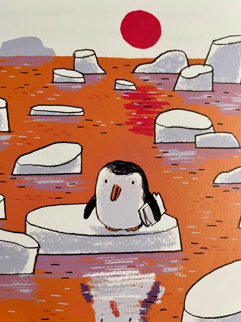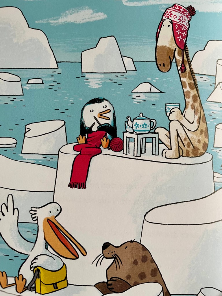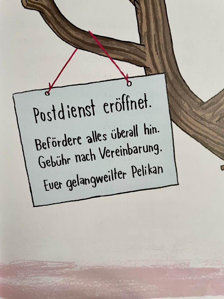 Ein Pelikan in der Savanne langweilt sich und eröffnet eine Poststation. Eine Giraffe in der Savanne langweilt sich und schreibt einen Brief. An wen? An das erste Tier hinter dem Horizont – also an den Pinguin. Es dauert eine Weile bis der Pelikan die Robbe erreicht, der überbringt im Eis die Post. Und dann schreibt der Pinguin zurück.