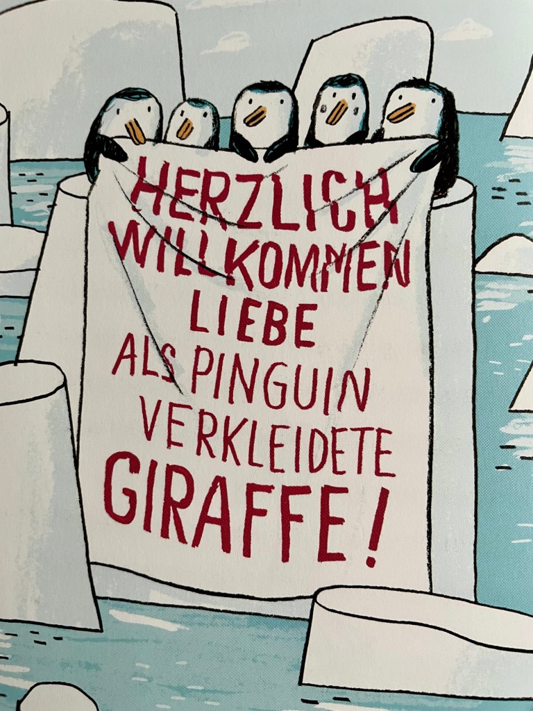 Es beginnt eine Korrespondenz, die manche Schwierigkeit zu meisten hat ‚Was ist ein Hals?‘ fragt der Pinguin oder warum der Pinguin Flügel hat, aber nicht fliegen kann. Und schließlich besucht die Giraffe, als Pinguin verkleidet, das eisige Zuhause des Pinguins. Immer dabei Professor Wal mit einer sagenhaften Fontaine. Ein wunderbares Buch über Freundschaft, wir es ist das Fremde zu entdecken und das wir doch alle gar nicht so verschieden sind, wie es sich manchmal zuerst anhört. Wunderbar minimalistisch illustriert von Jörg Mühle. Außerdem ein ganz tolles Buch für Leseanfänger und Erstleser. Bekommen hat das Buch den Deutsche Jugendliteraturpreis – zu Recht.