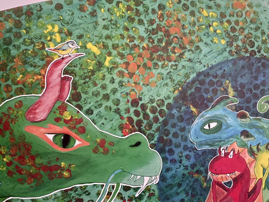 Ein Fels hat den großen Drachen eingeklemmt und die Drei retten ihn. So kommt es, dass die vier Drachen sich kennenlernen und schließlich sogar beschließen eine Wohngemeinschaft zu gründen – Platz genug für alle ist ja. Und so lernt auch der alte Drache noch, wie schön es ist, zusammen zu leben und sich gegenseitig zu unterstützen. Und so macht jeder Drache das, was er am besten kann und ’sie führten ein lustiges, erfülltes Leben‘.