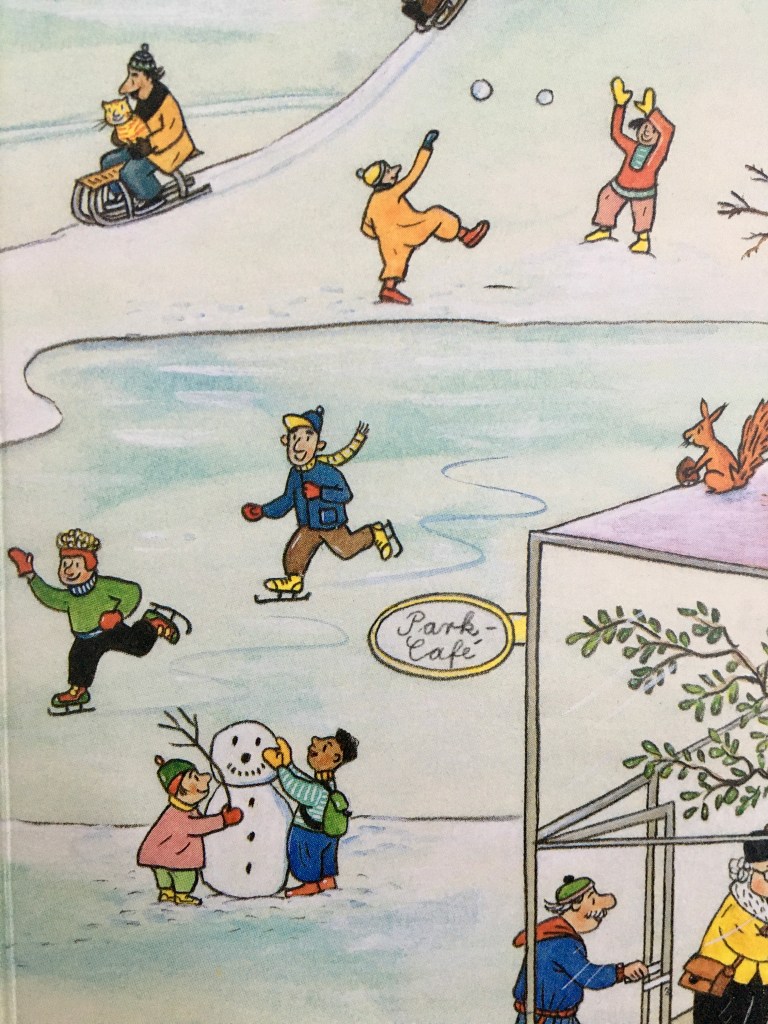 Zum Beispiel können wir Andrea folgen, die heute verschlafen hat, und auf der ersten Doppelseite den Bus verpasst. Sie läuft ihm hinterher, muss zu Fuß gehen und schafft es schließlich doch ins Café zum Treffen mit ihrer Freundin. Oder dem Jogger Manfred, der auf der zweiten Doppelseite sein Portemonnaie verliert, das Ina findet. Sie trifft ihn schließlich auf dem Marktplatz und gibt es ihm zurück.