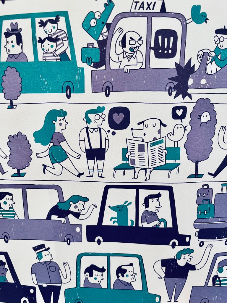 Besonders schön sind die diesem Buch aber die Illustrationen, die eben nicht im typischen Wimmelbuchstil von Ali Mitgusch oder Rotraut Susanne Berner sondern viel moderner daher kommen.