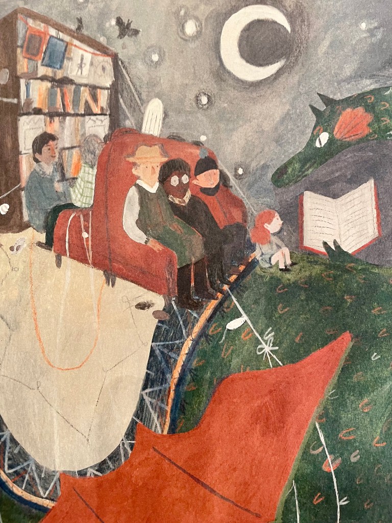 Und so sehr er sich bemüht, Franklin findet keinen Gesprächspartner, da alle Angst vor ihm haben. Doch eine Tages trifft er im Wald ein Mädchen, das gerade ein Buch über Drachen liest und sich deswegen nicht fürchtet. Die Beiden freunden sich an und erzählen sich Geschichten über Geschichten, denn Luna liebt Bücher genauso sehr wie Franklin. Um ihre Geschichten mit anderen zu teilen, schmieden sie einen Plan: Auf Franklins Flügeln bauen sie eine windschiefe Buchhandlung und fliegen damit ins Dorf. Und nach anfänglichem Zögern hören die Bewohner den Geschichten von Franklin zu…